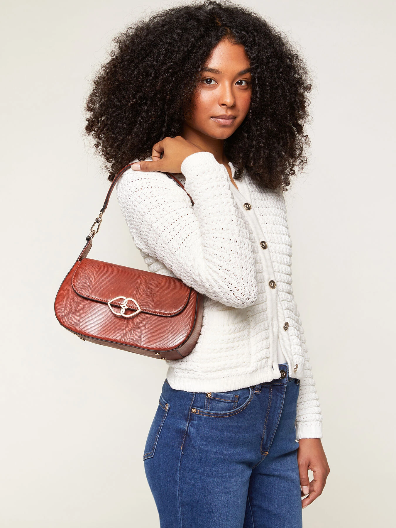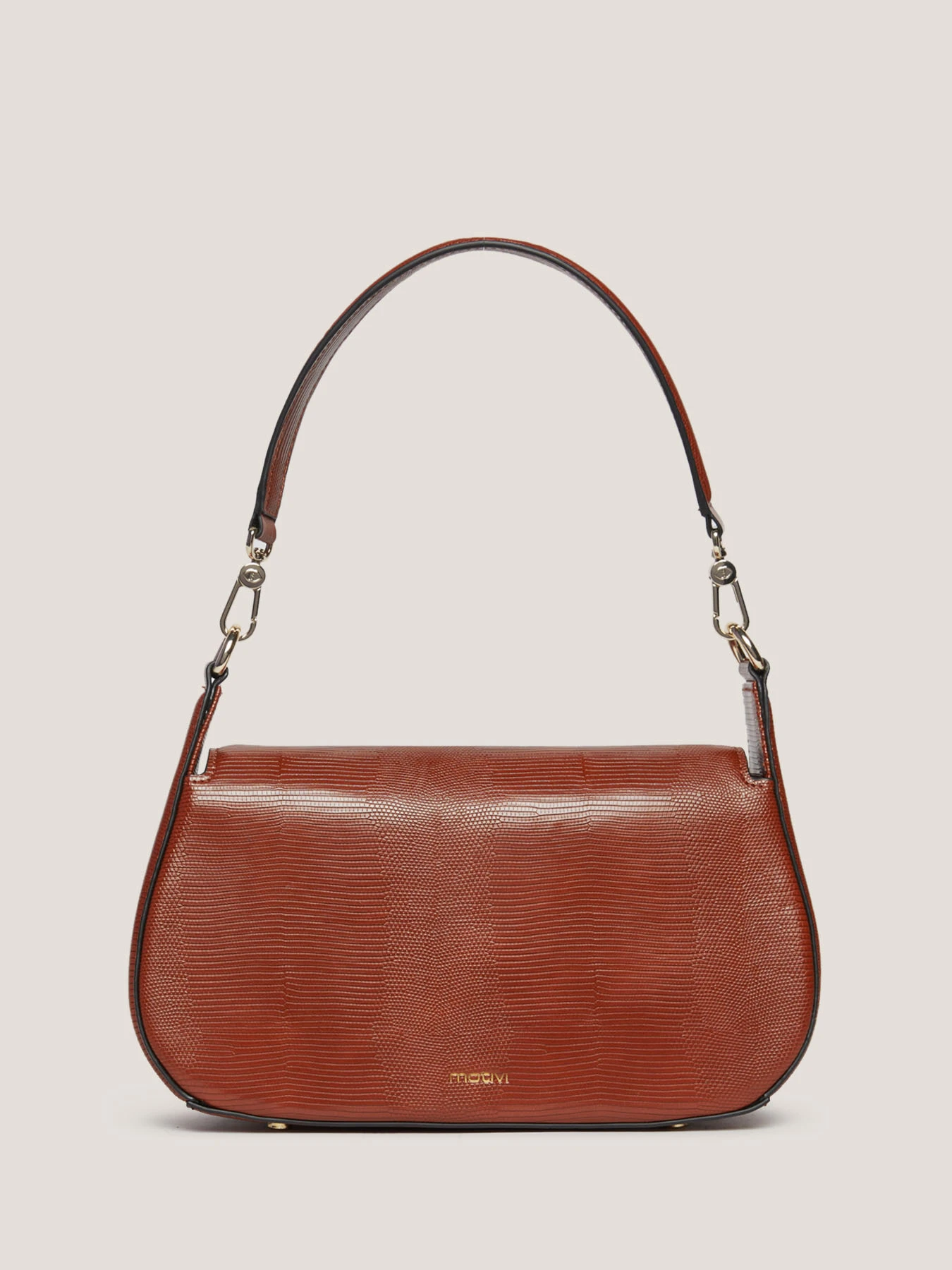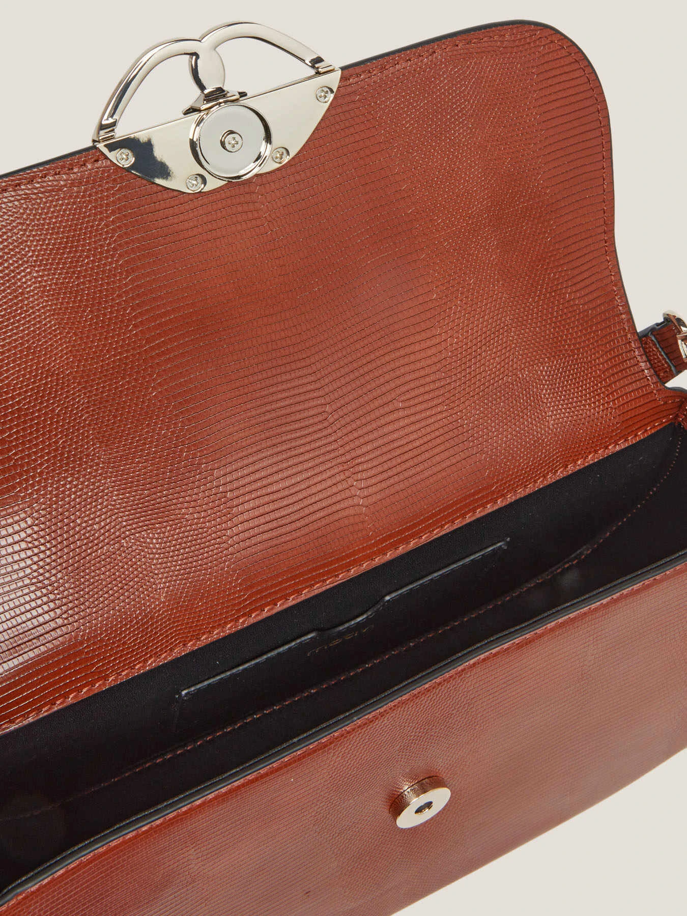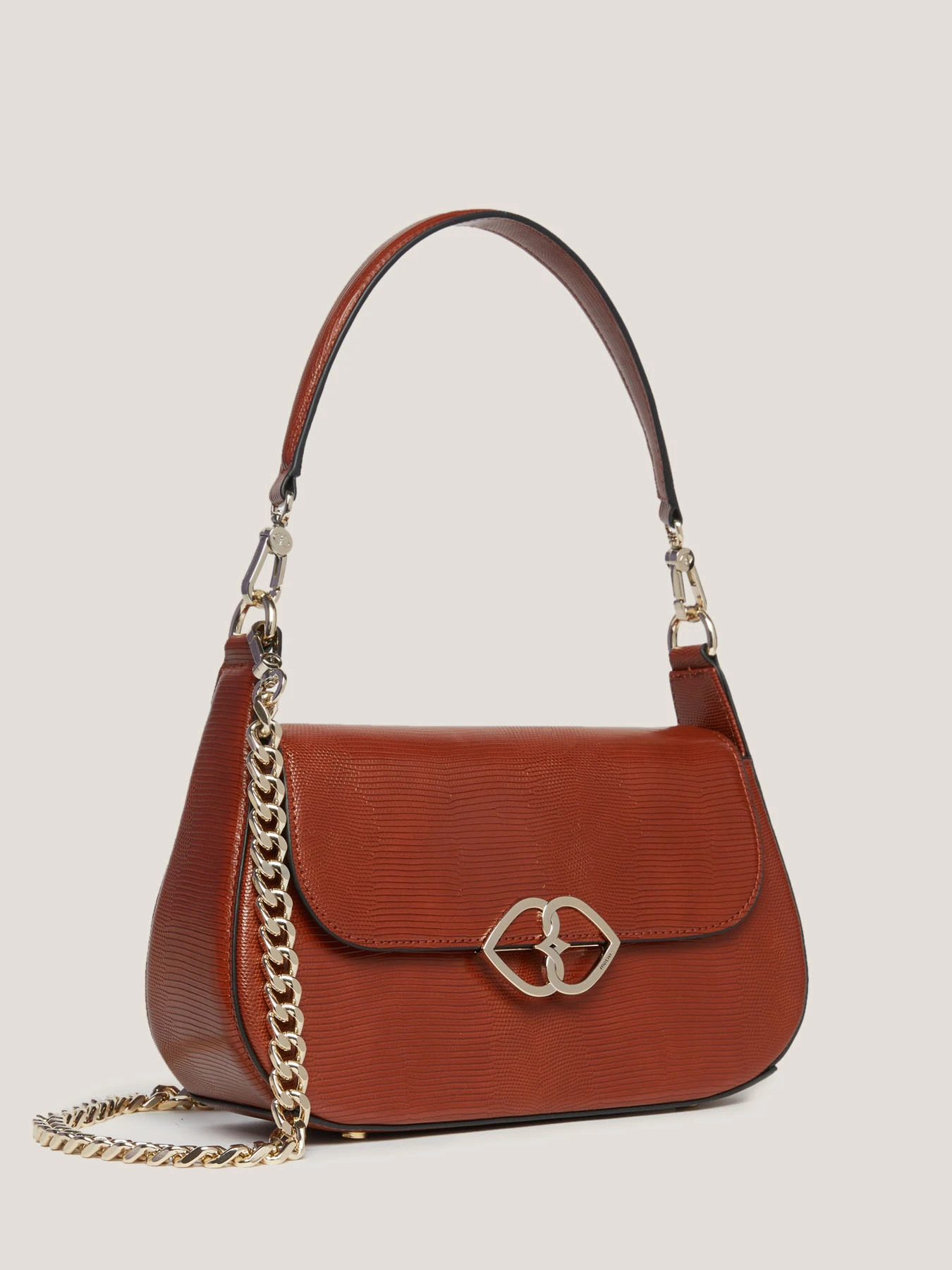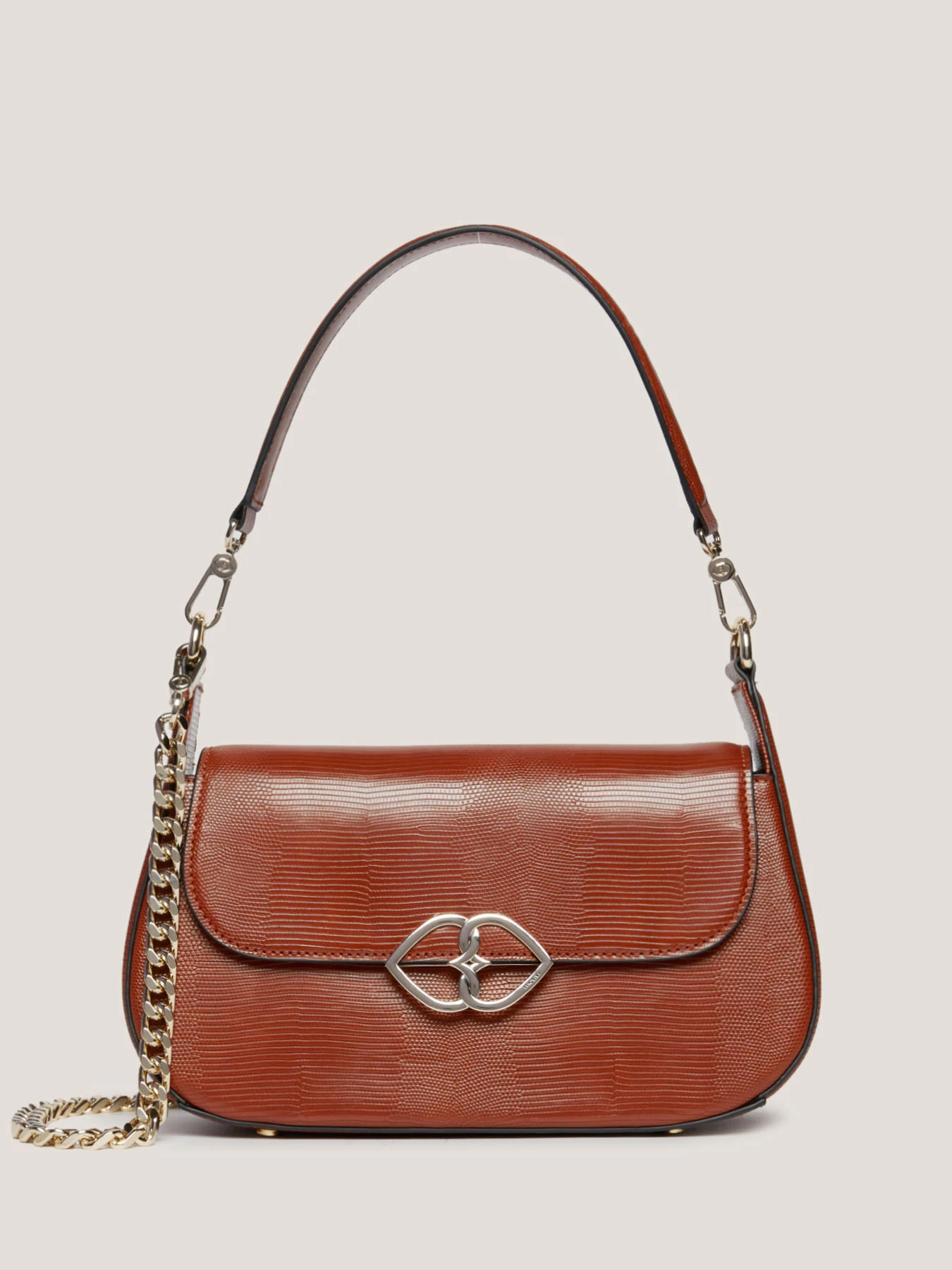 Arizona Bag in similpelle effetto rettile; manico tono su tono e tracolla in catena metallica, chiusura con patta e placca metallica Double Love, tasca interna; dimensioni: altezza 15,5 cm, larghezza 27 cm, ampiezza 8 cm.