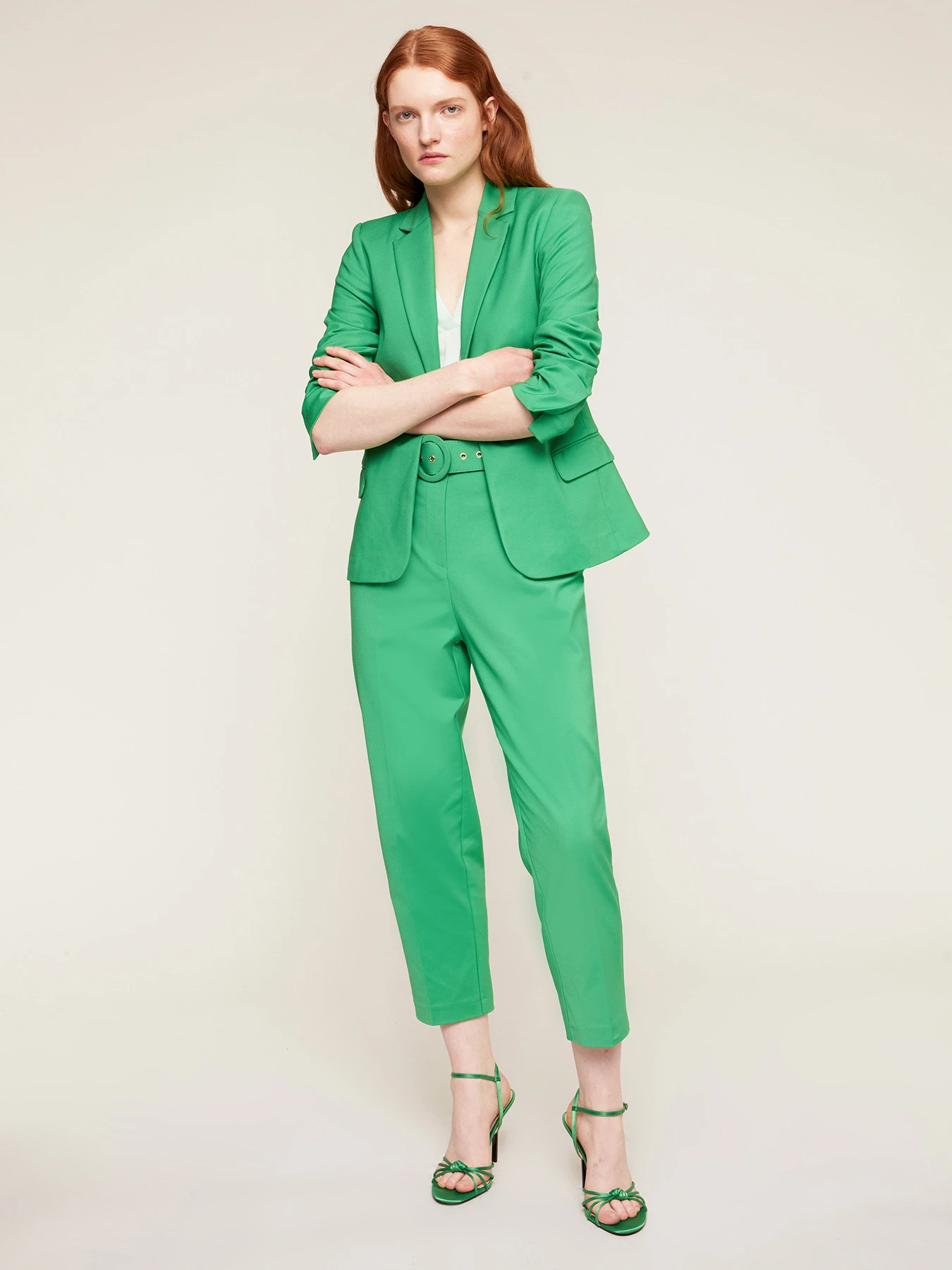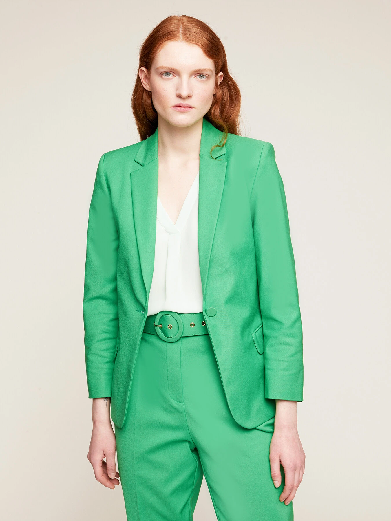 Blazer in tessuto tecnico misto cotone tinta unita; colletto a revers e chiusura monopetto con bottoni in tono; maniche lunghe, tasche frontali a patta.