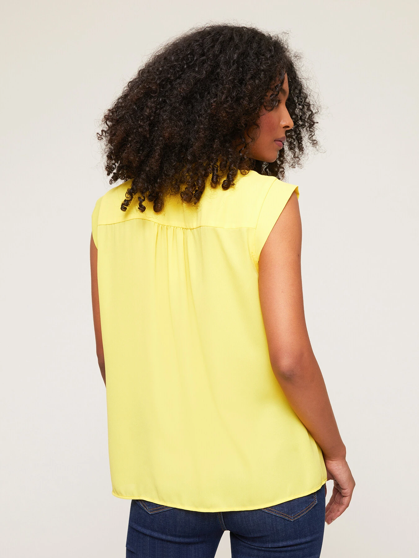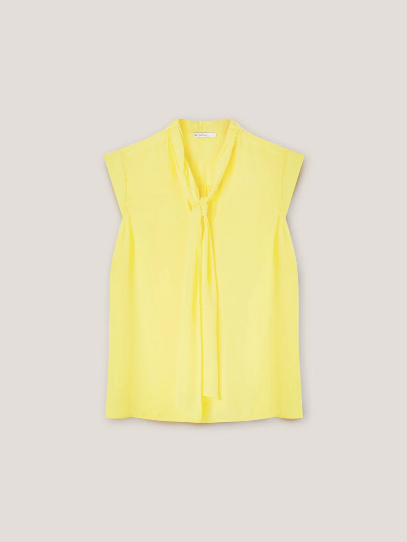 Blusa in tessuto crêpe; collo a listino con fusciacca da annodare a fiocco; maniche ad aletta.