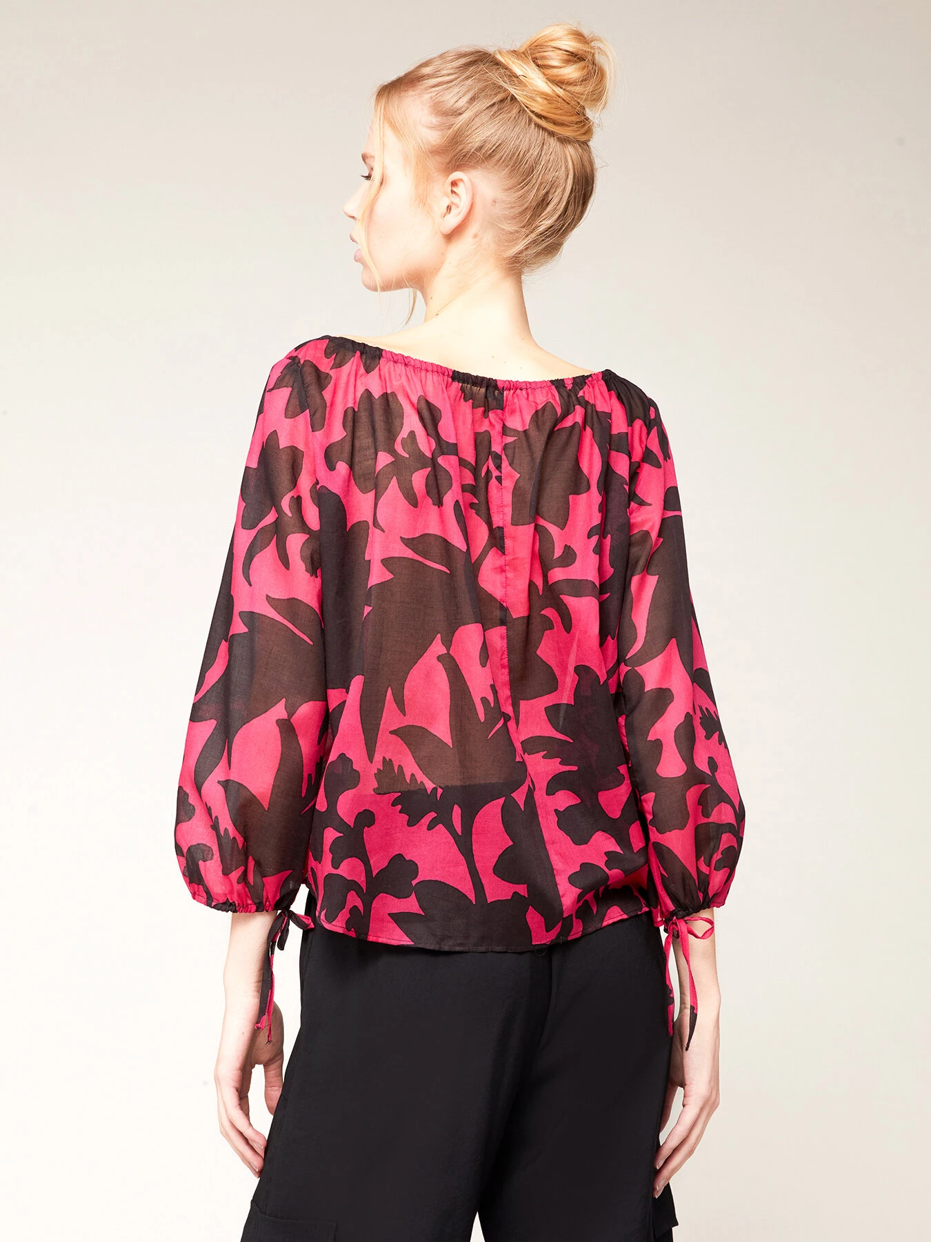 Blusa estiva fantasia floreale in mussola di cotone; ampia scollatura a barca con elastico interno; maniche lunghezza tre quarti con coulisse, fondo con lunghezze asimmetriche.