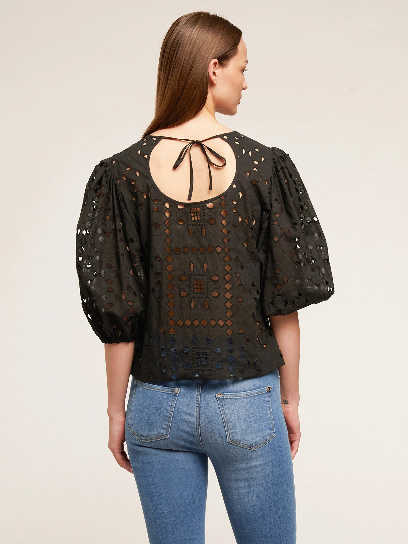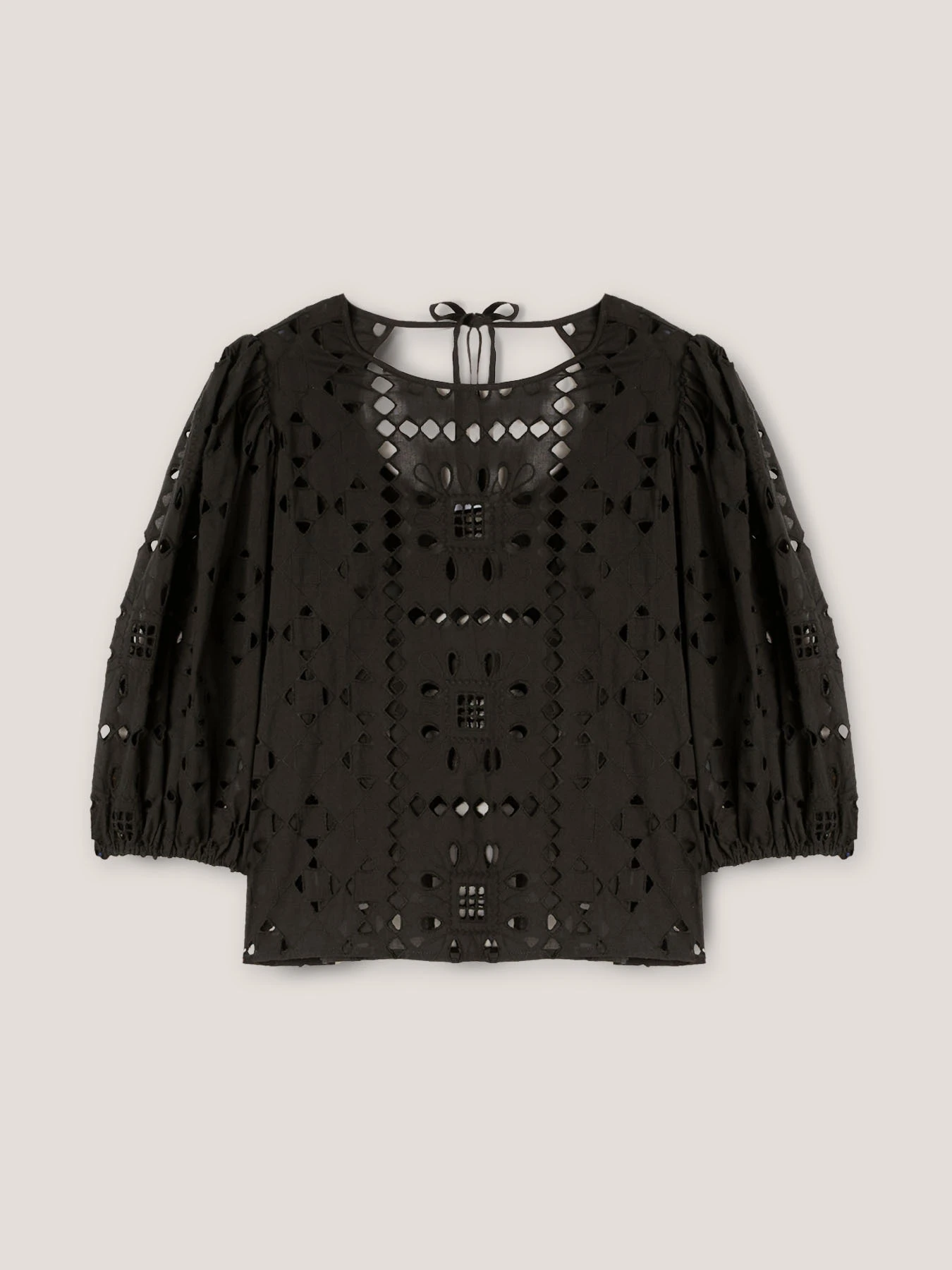Blusa estiva in sangallo 100% cotone; scollo tondo con ampia apertura posteriore; maniche a palloncino lunghezza tre quarti.