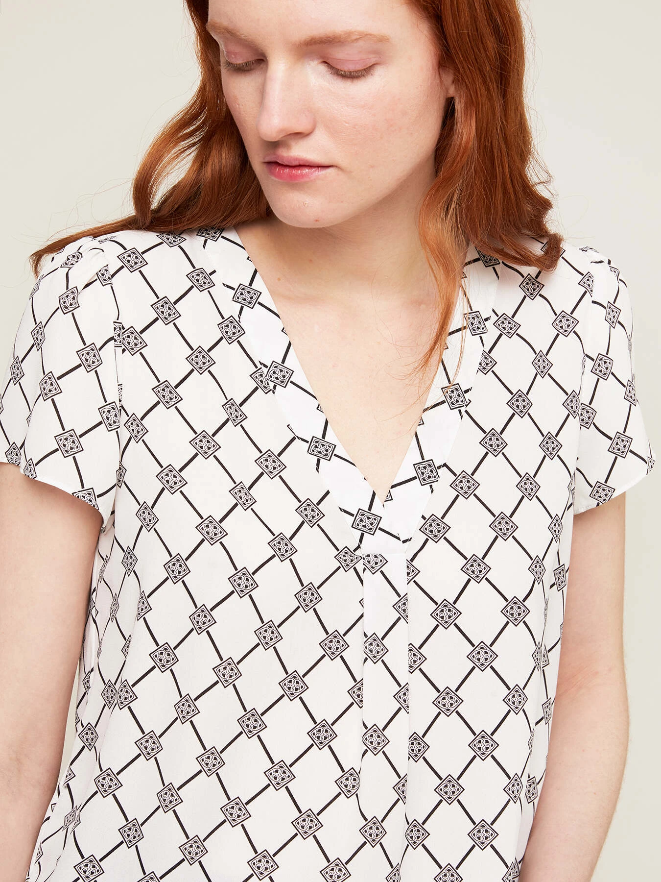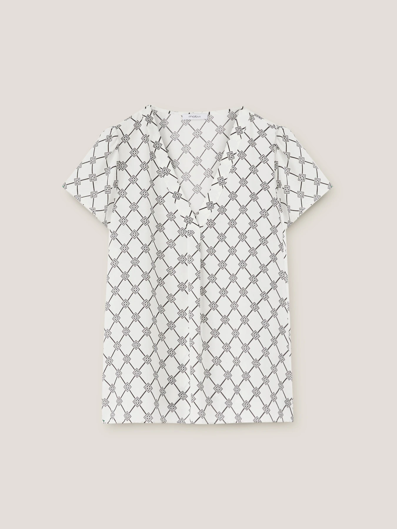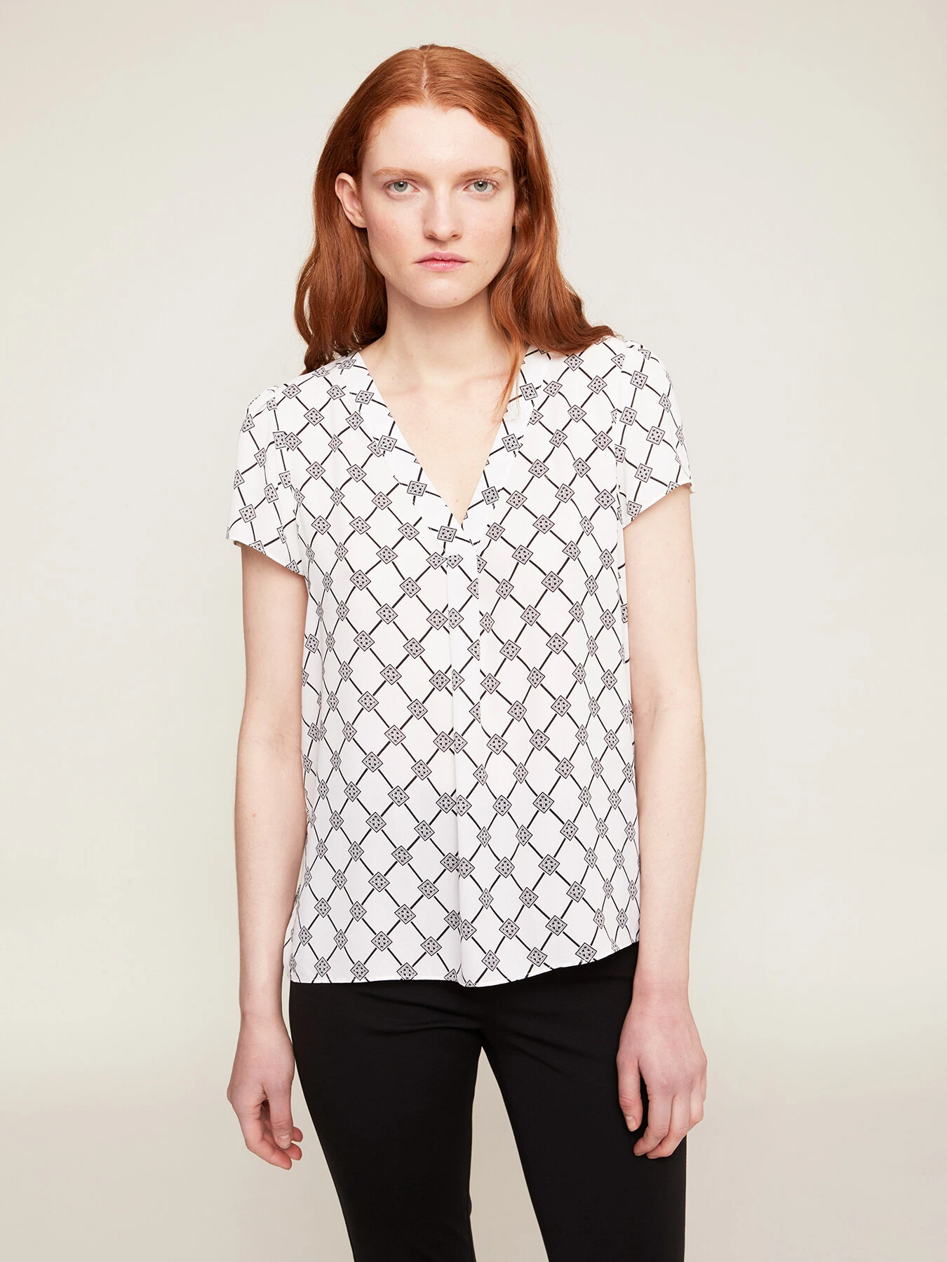 Blusa fluida fantasia a rombi in tessuto dalla mano crêpe; scollo frontale a v con motivo di piega a cannoncino; maniche corte.
