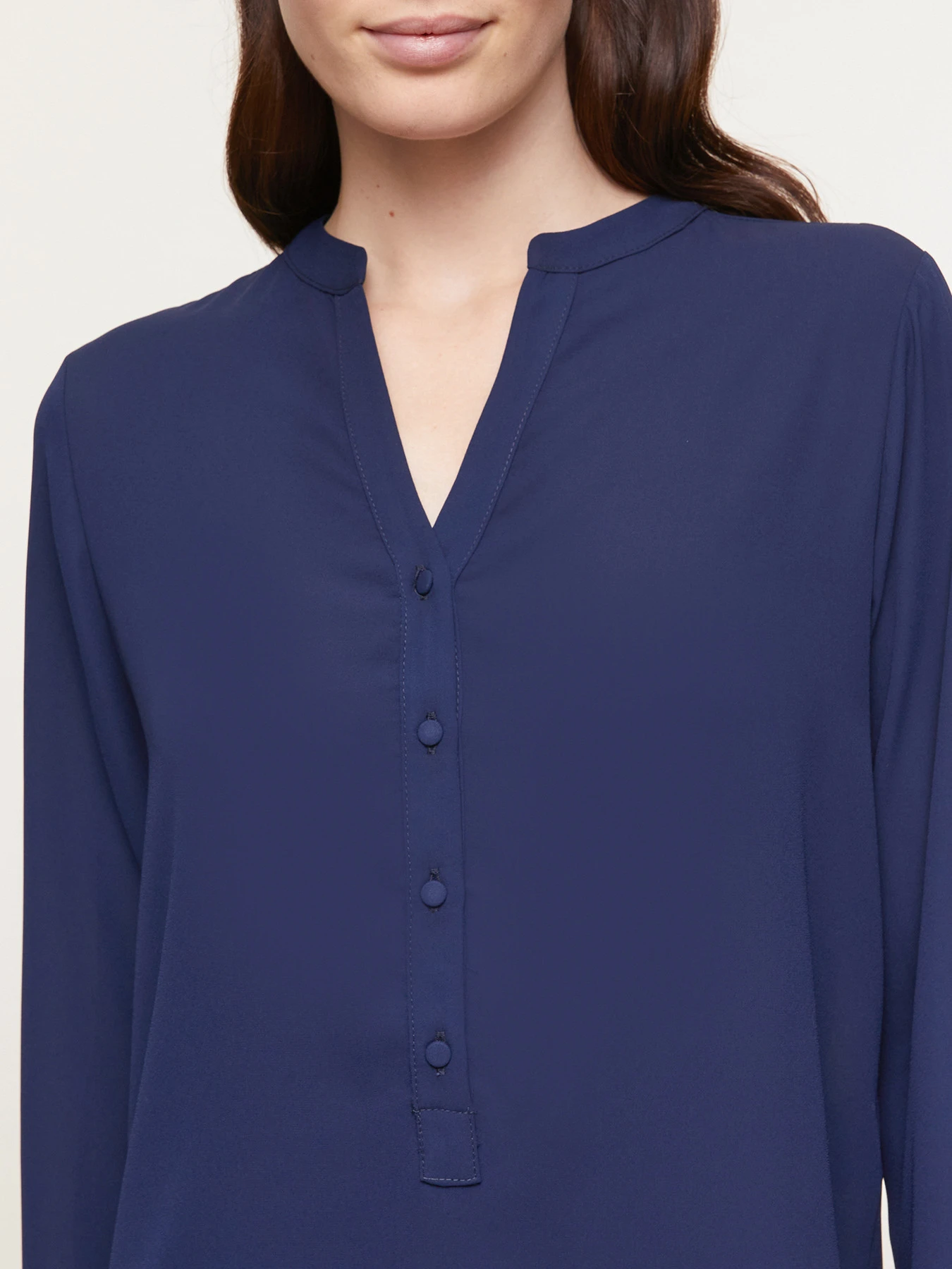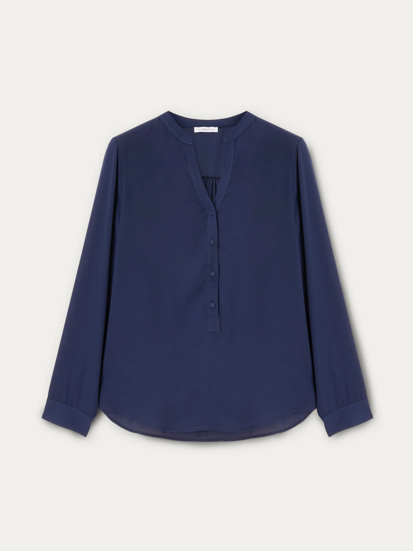Blusa in fluida in tessuto con mano crêpe; scollo frontale a serafino con bottoni foderati; manica lunga con polsino; taglio carrè con leggera arricciatura nel centro dietro.