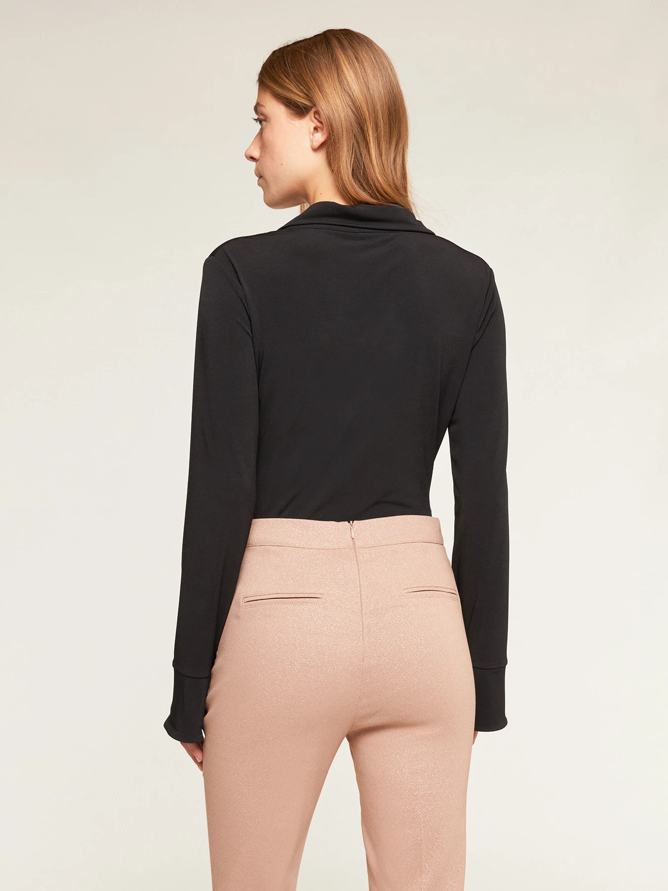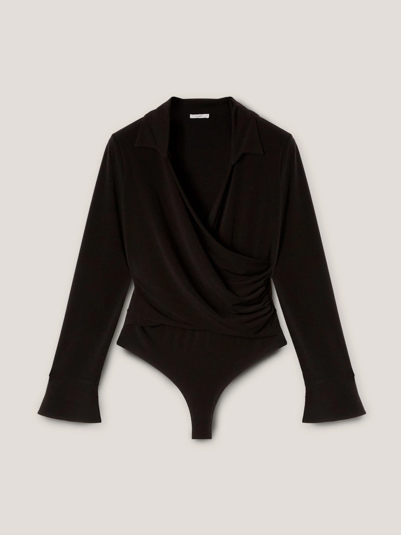 Body in jersey tinta unita; scollo a v con incrocio e colletto a vela; maniche lunghe con polsino sul fondo, slip con chiusura a bottoni automatici.