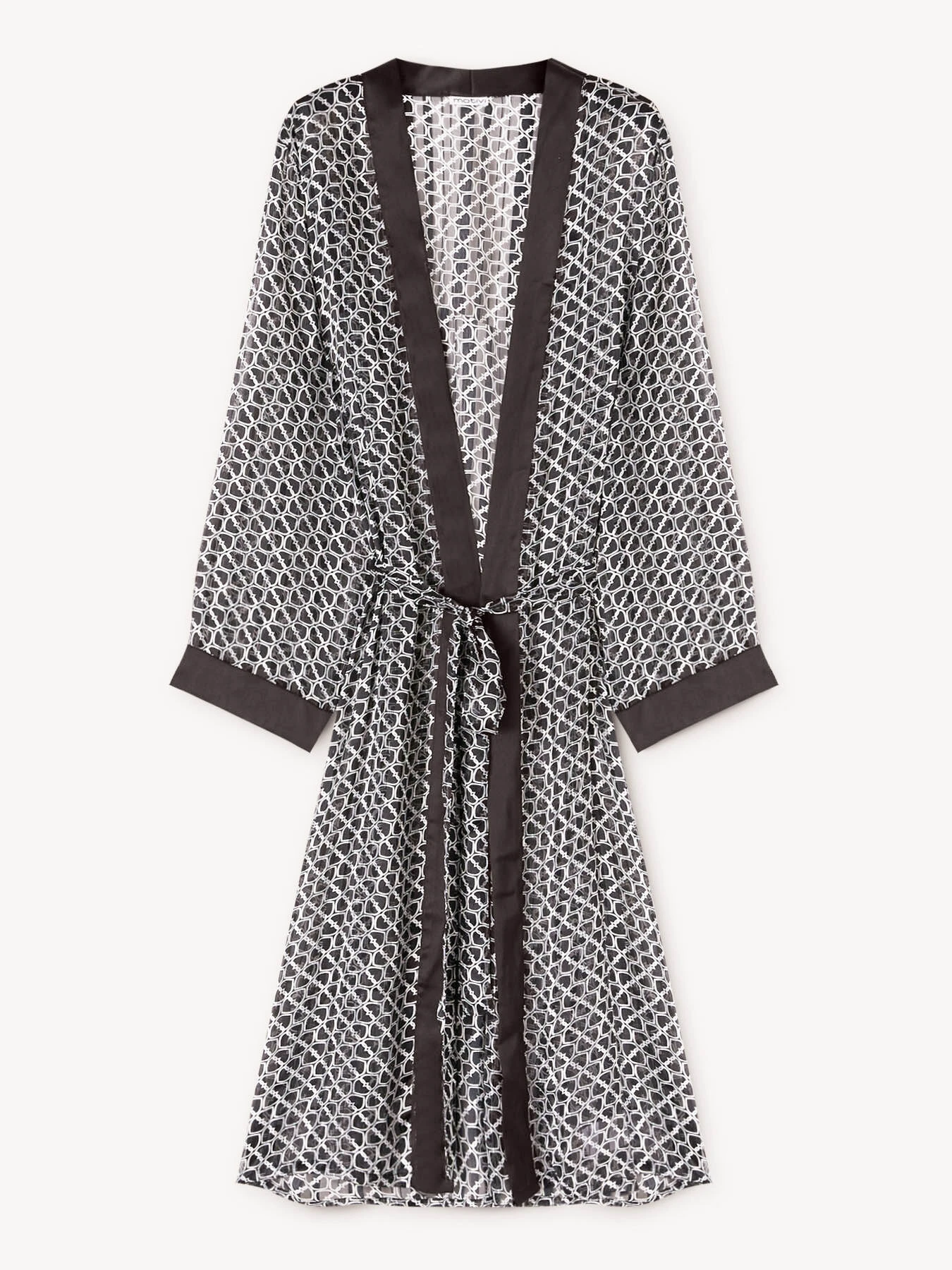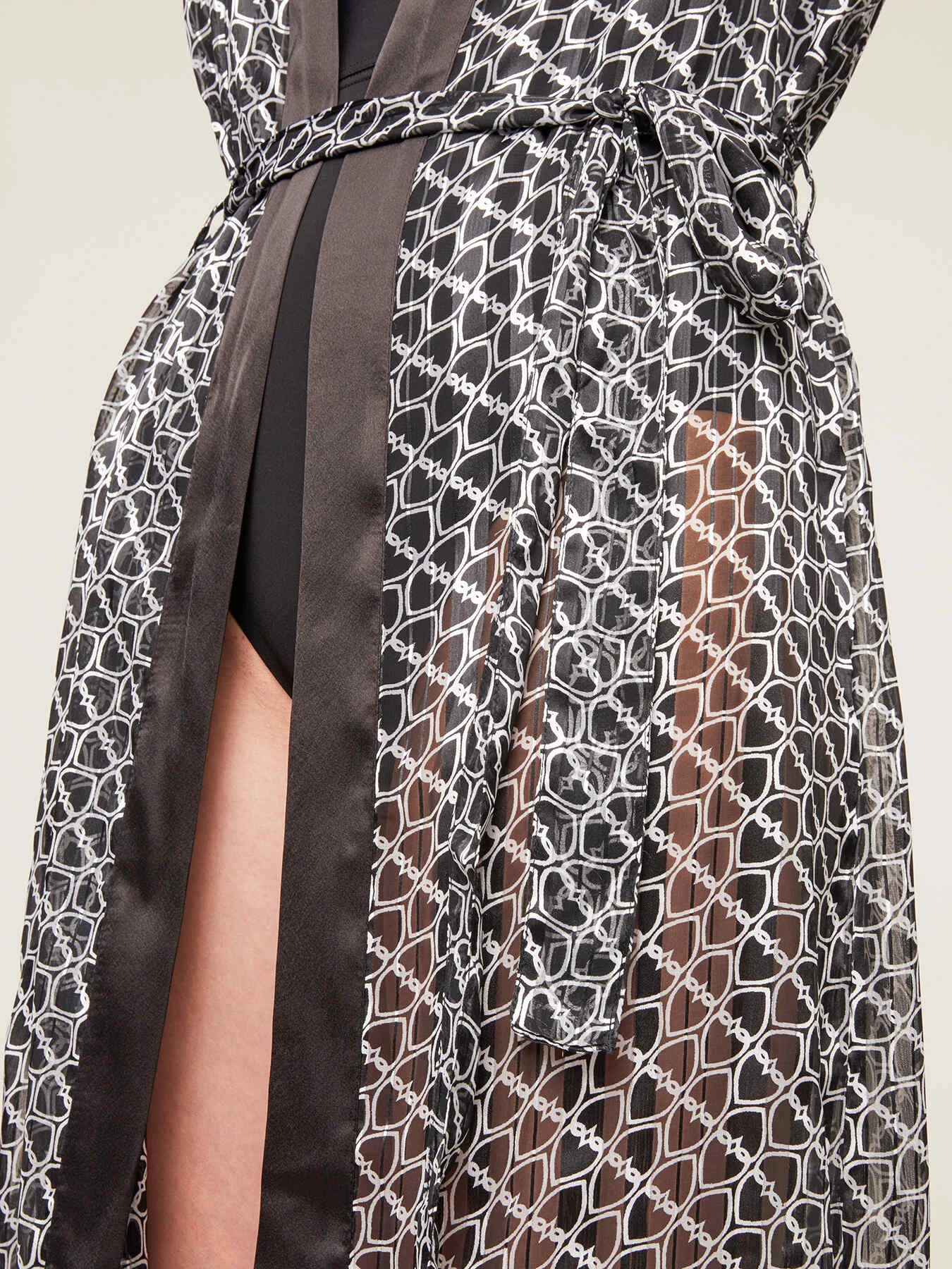 Caftano copricostume fantasia Double Love; bordo scollo in raso tinta unita; fusciacca in vita da annodare tono su tono, maniche lunghe.
