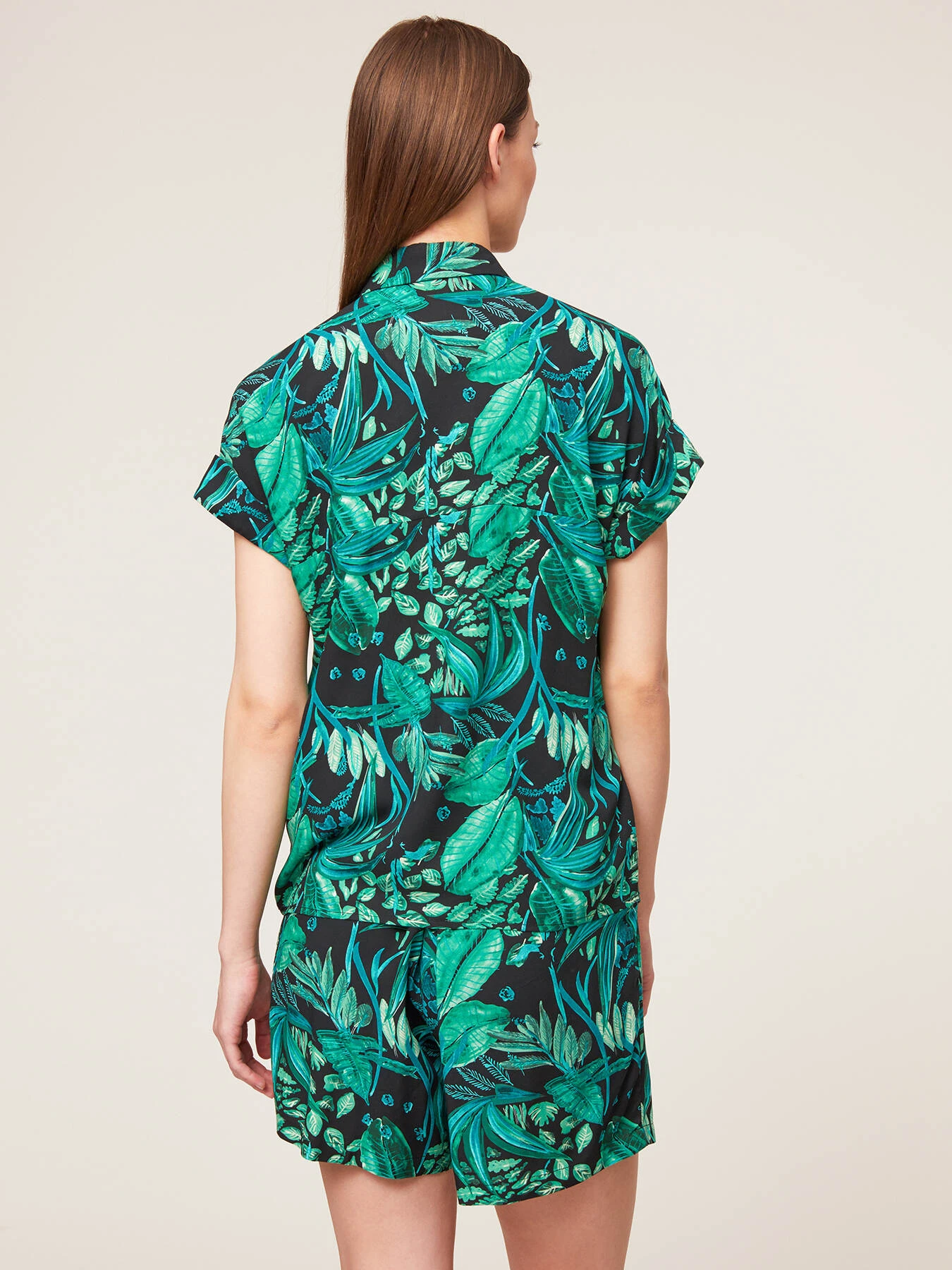 Camicia in tessuto fluido di viscosa fantasia jungle; modello a kimono con maniche corte e risvolto; colletto a vela e bottoni a vista effetto madreperla.