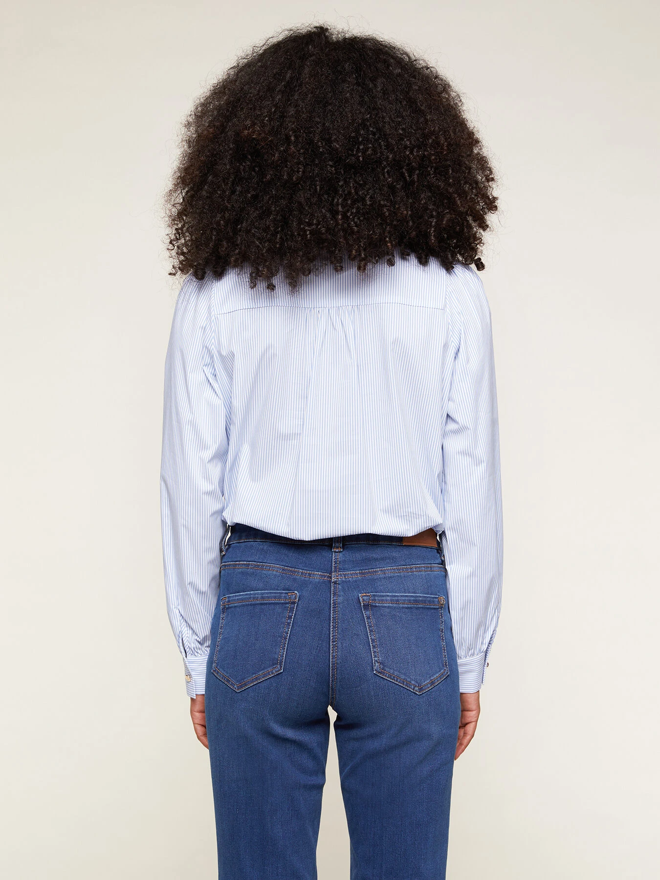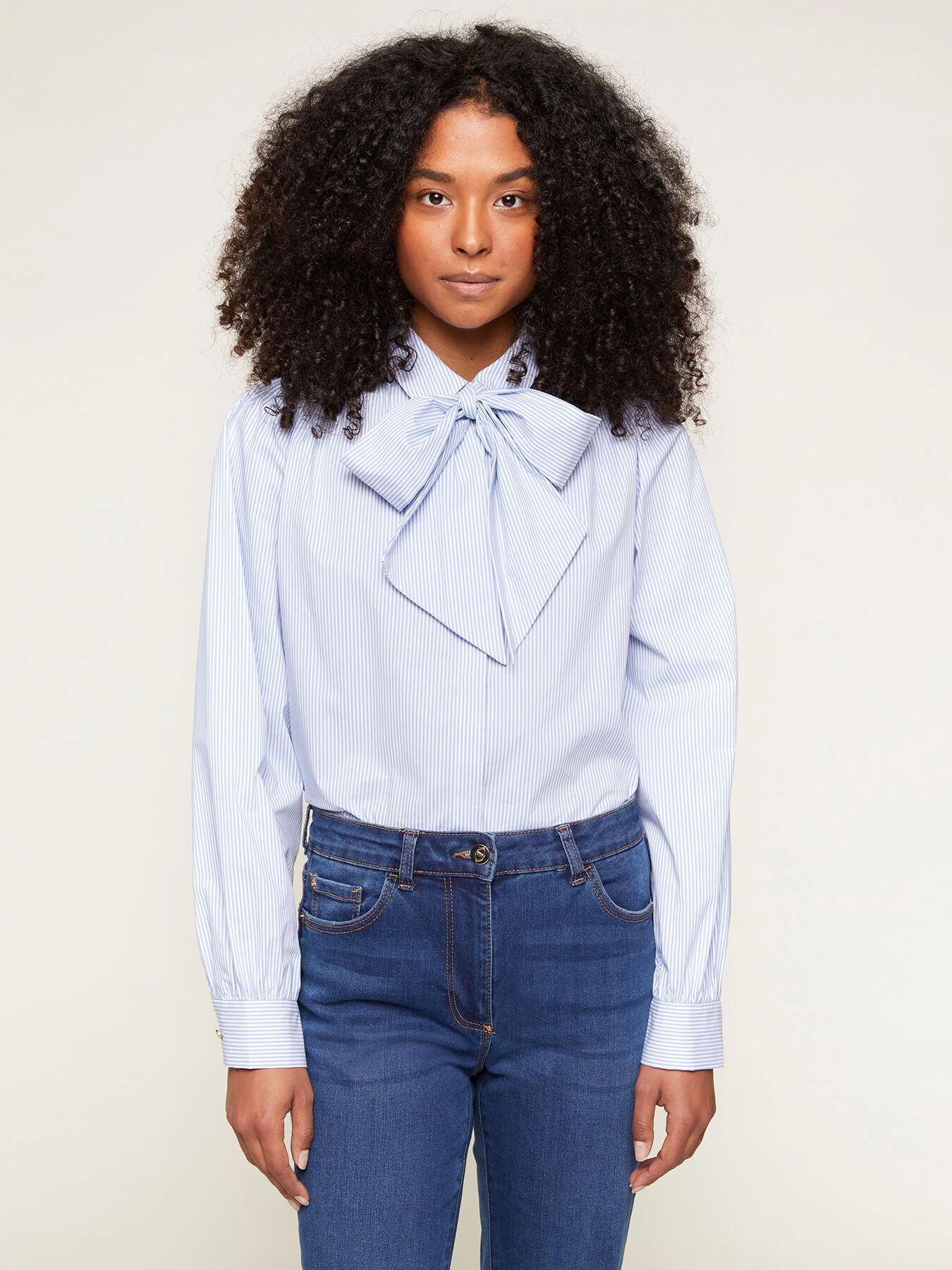 Camicia in tessuto tinto filo fantasia a righe; colletto classico con fiocco e abbottonatura all’inglese; maniche lunghe con leggero sbuffo ad attaccatura.