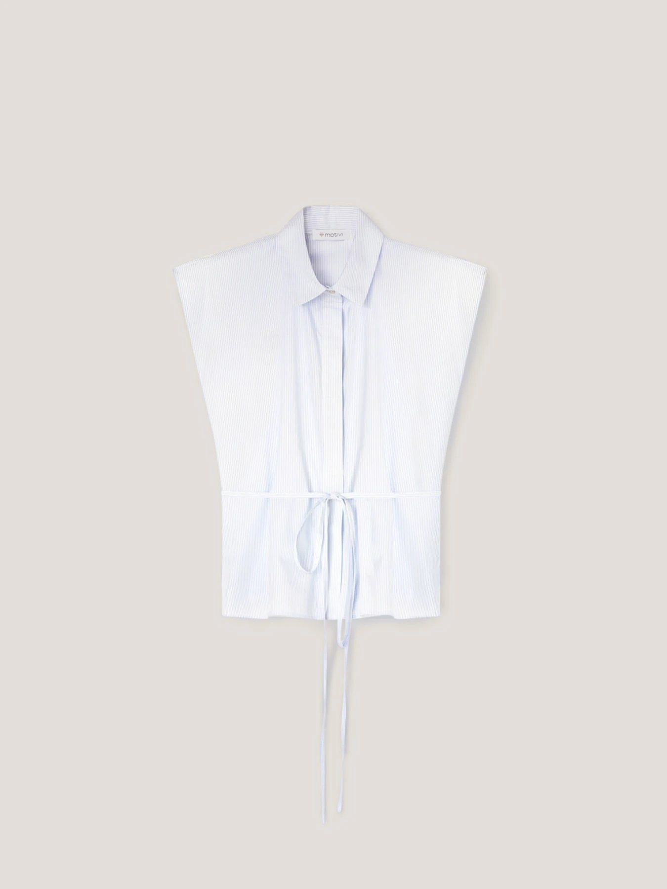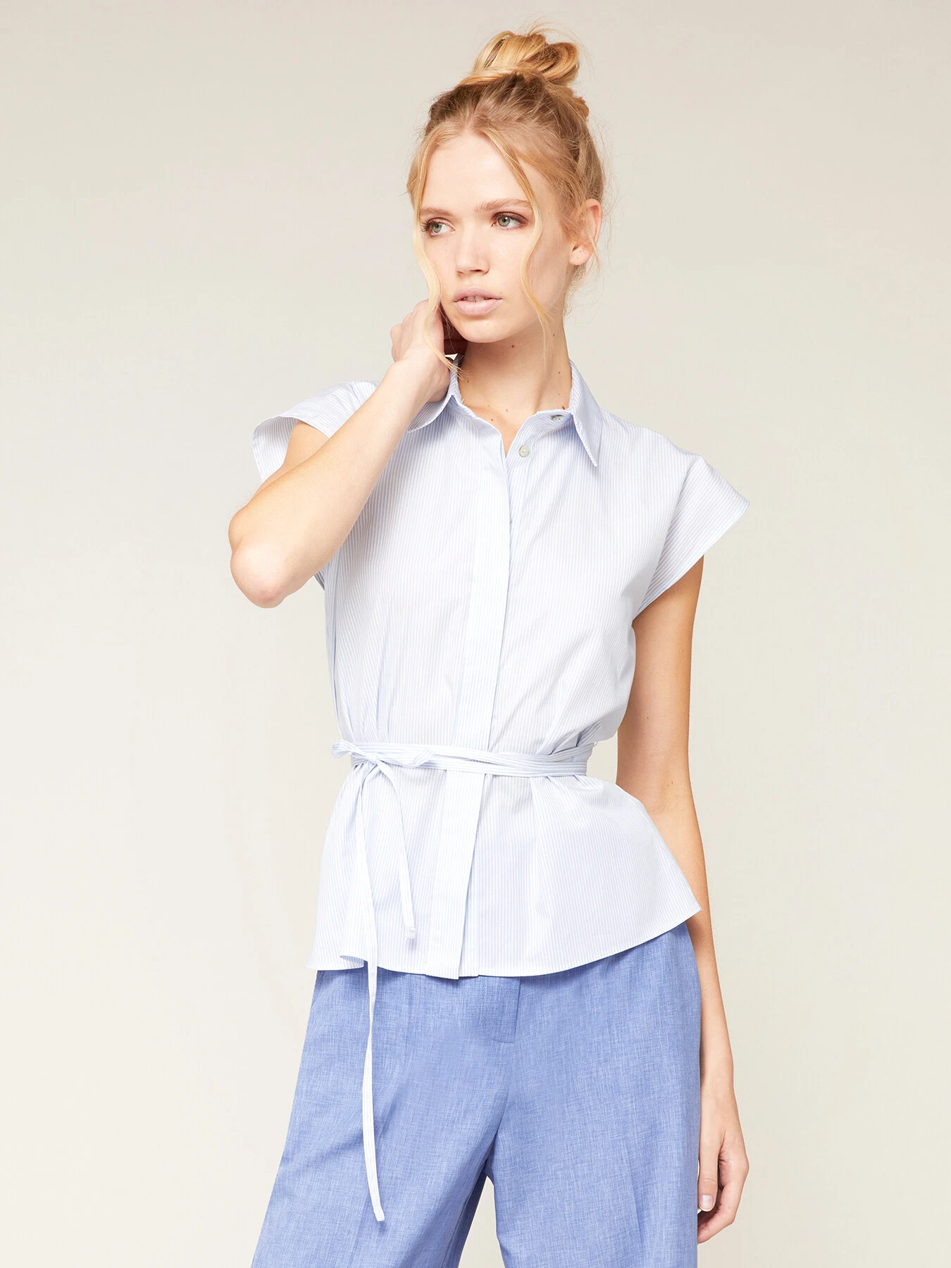 Camicia in popeline di cotone fantasia a righe; apertura frontale con colletto a vela e abbottonatura all’inglese; maniche corte ad aletta, nastro tono su tono da annodare in vita.