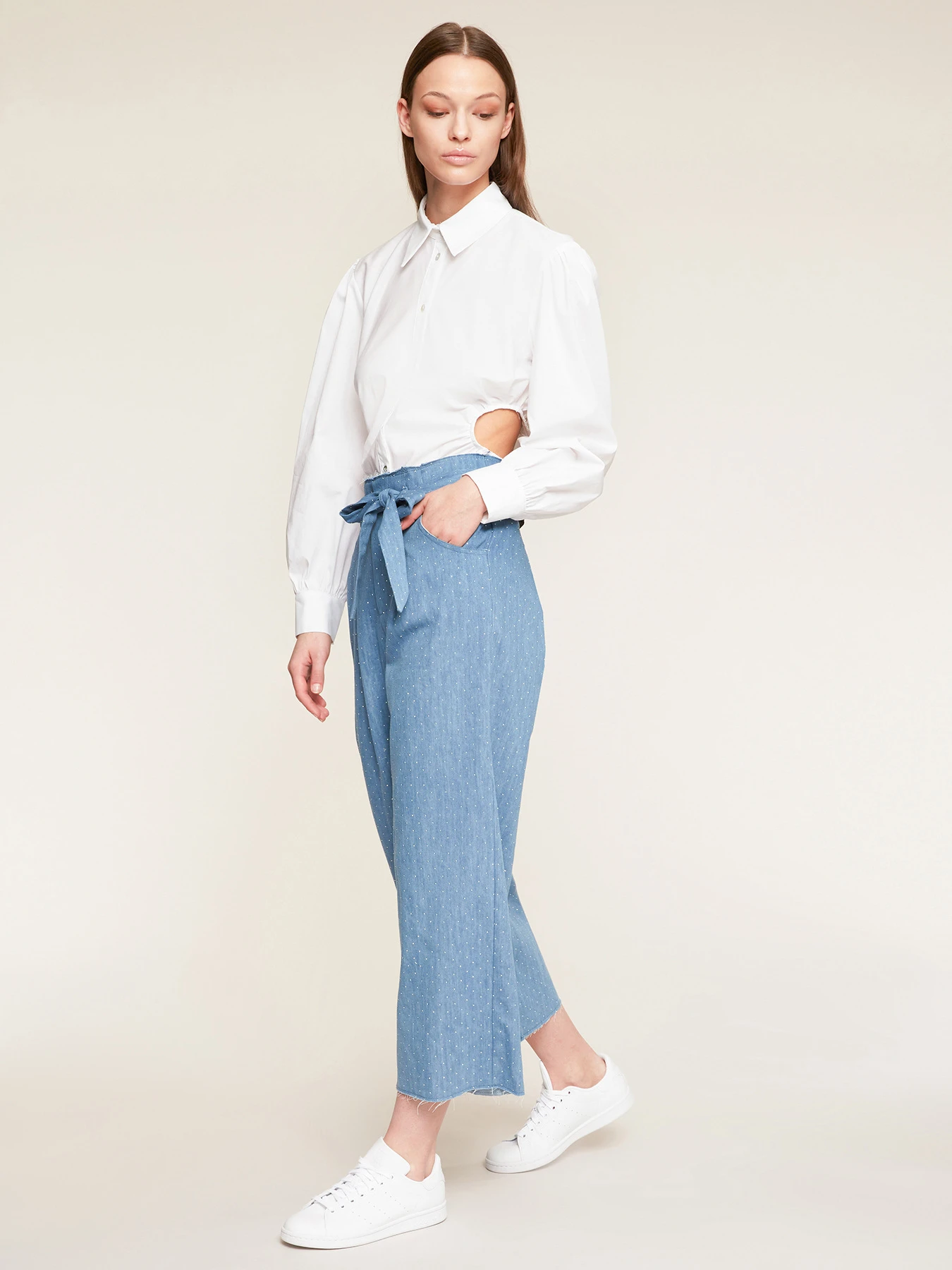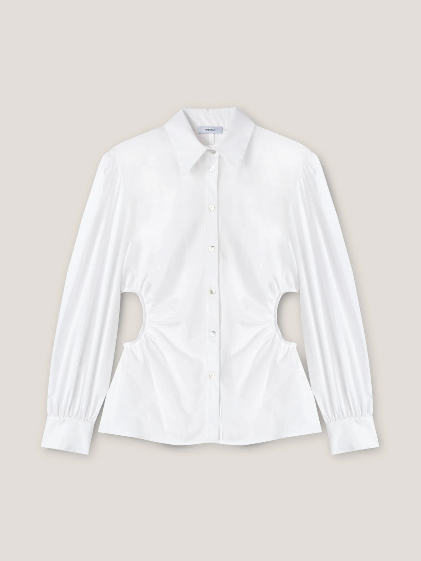 Camicia in popeline di cotone elastane tinta unita; chiusura frontale con colletto a vela e bottoni effetto madreperla, motivo cut-out laterale; maniche lunghe con polsino sul fondo.