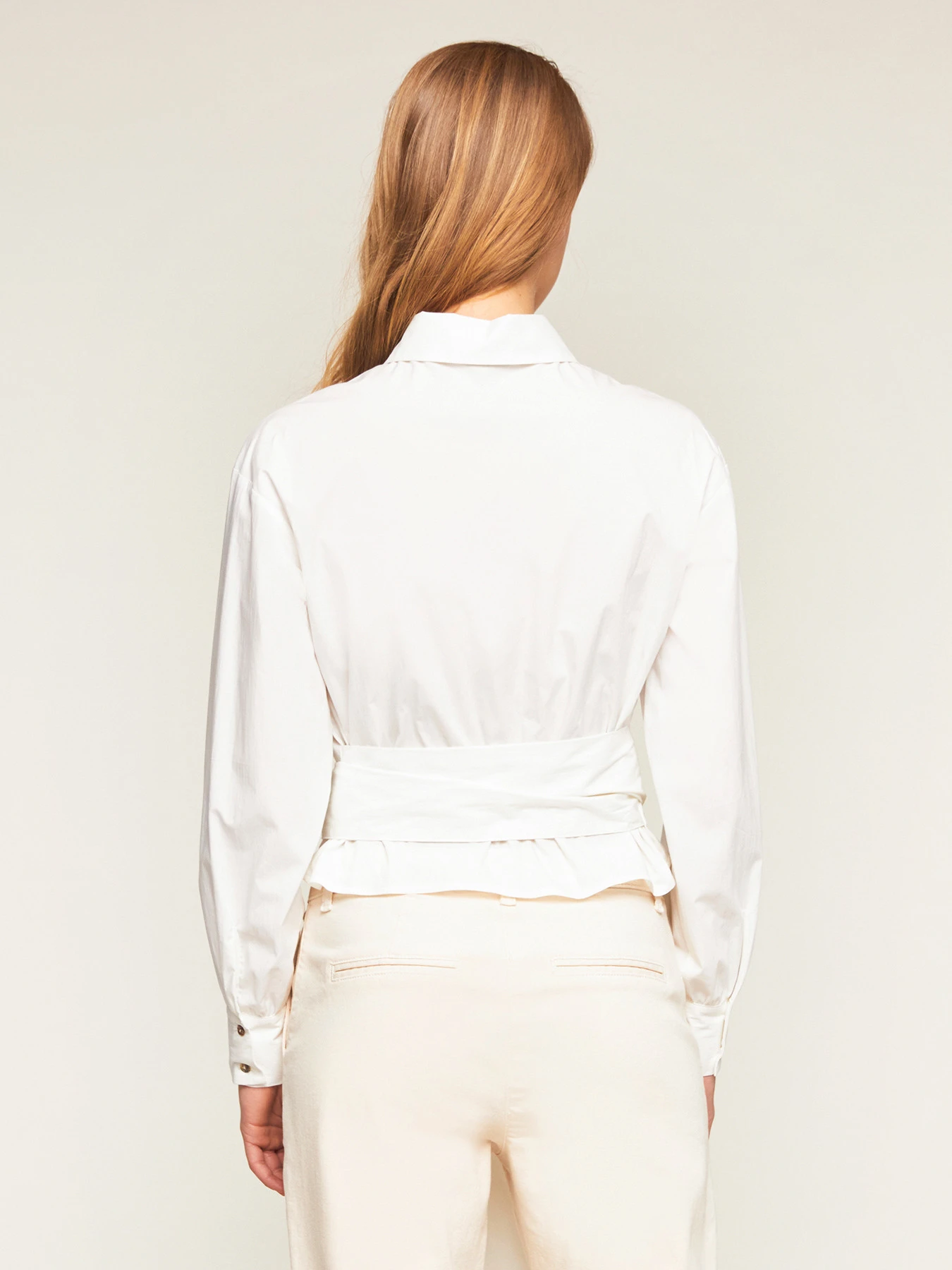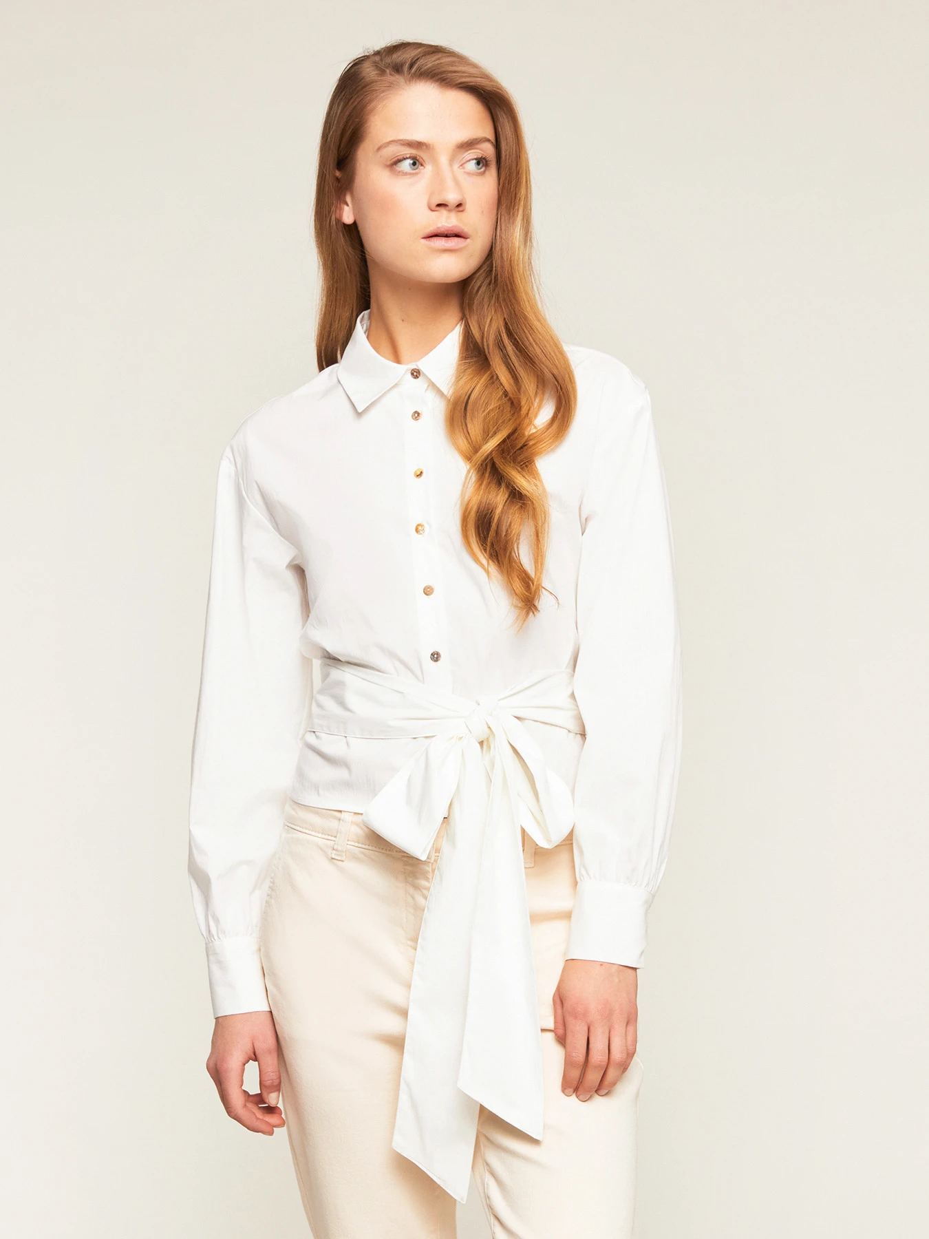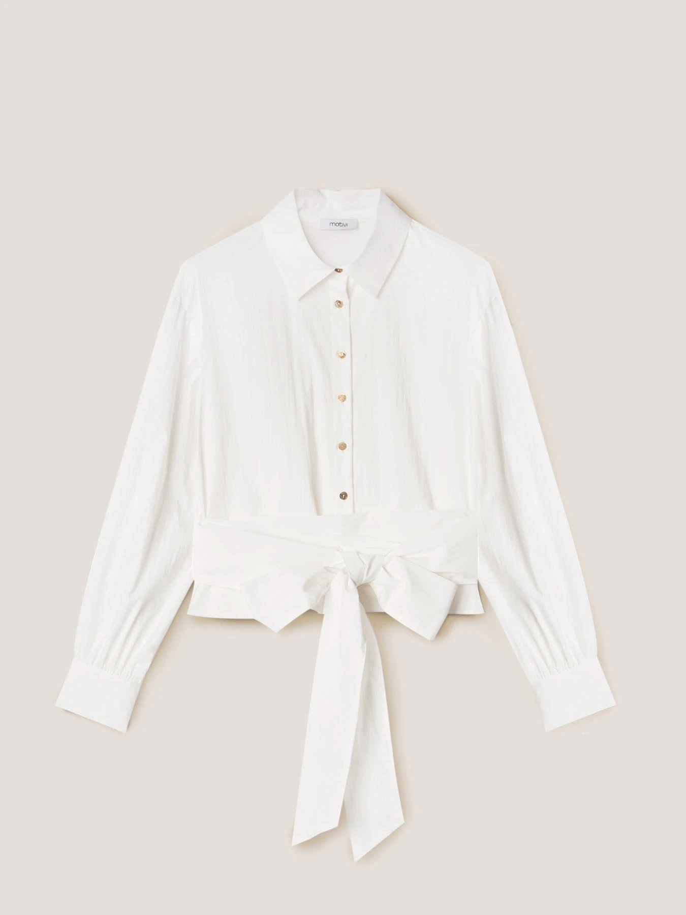 Camicia corta in popeline misto cotone; apertura frontale con colletto classico e bottoni a vista effetto madreperla; maniche lunghe, fascia in vita da annodare a fiocco.