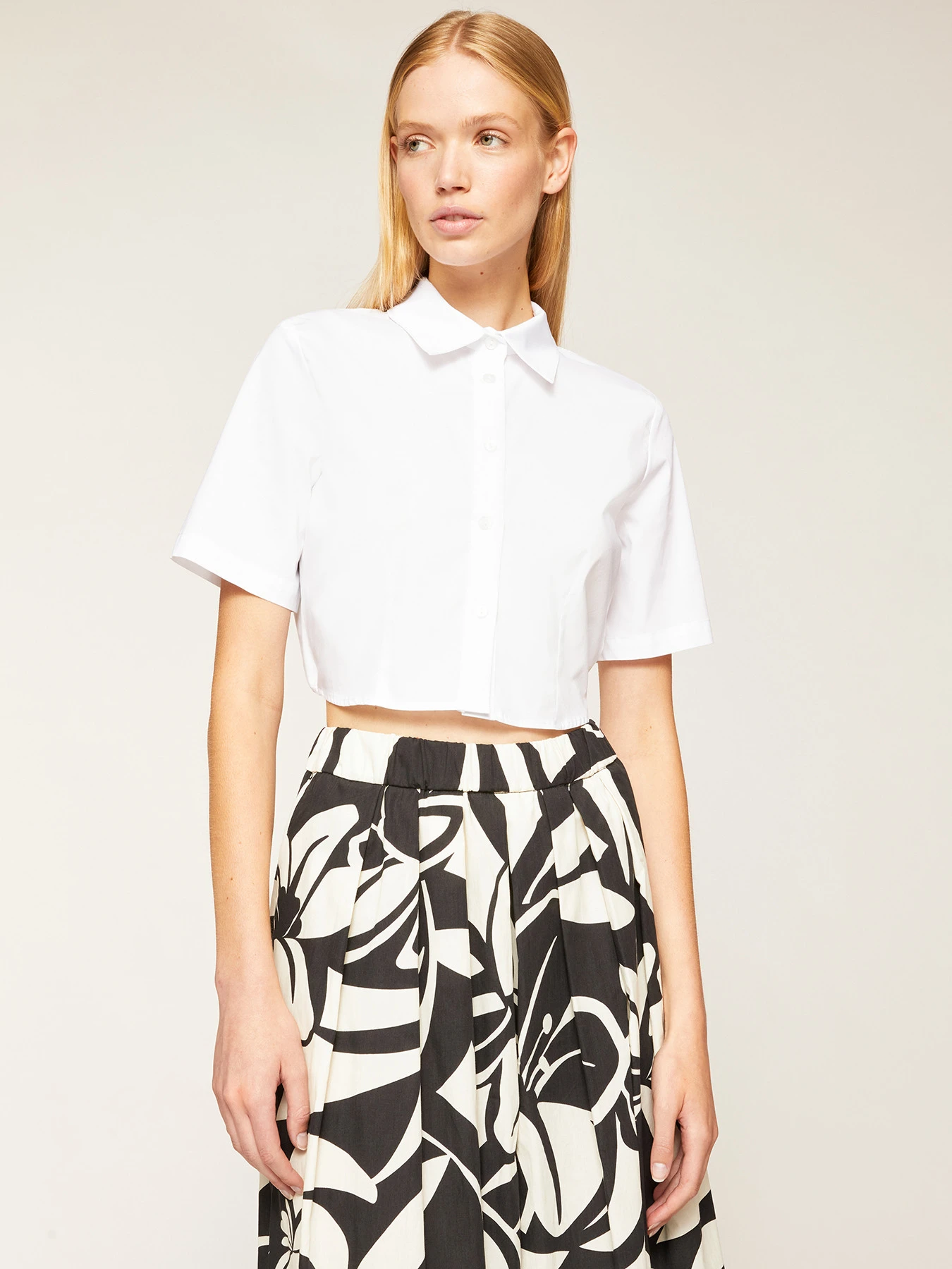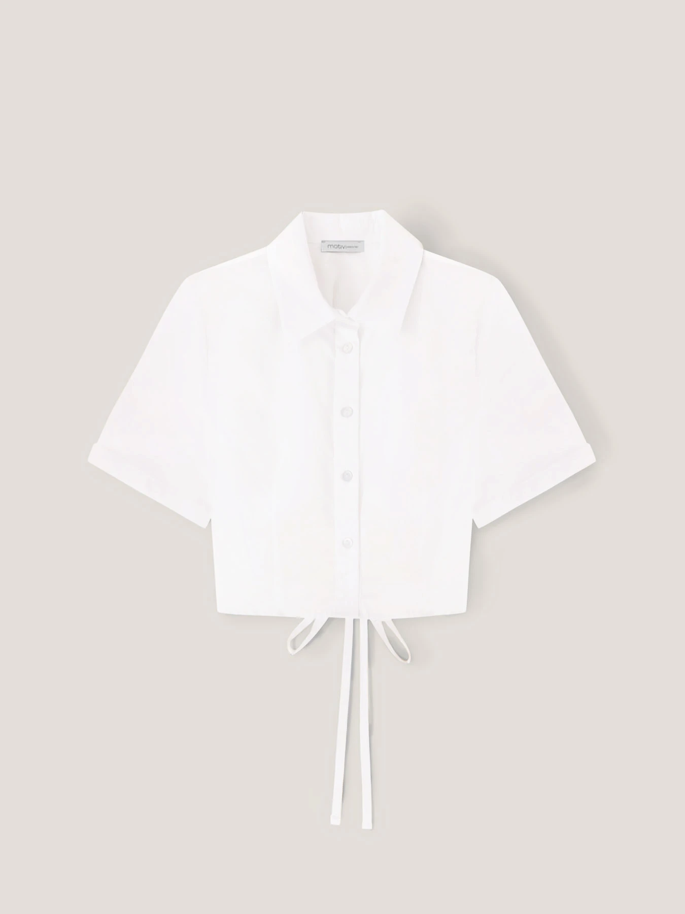 Camicia corta in popeline di cotone stretch; chiusura frontale con colletto a vela e bottoni a vista tono su tono, maniche corte; motivo cut-out con lacci da annodare.