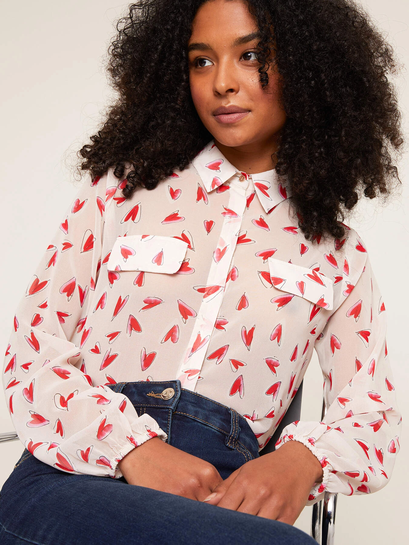 Camicia in georgette fantasia cuori; colletto a vela e abbottonatura all’inglese con primo bottone a vista; maniche lunghe con elastico sul fondo; tasche finte a patta anteriori.