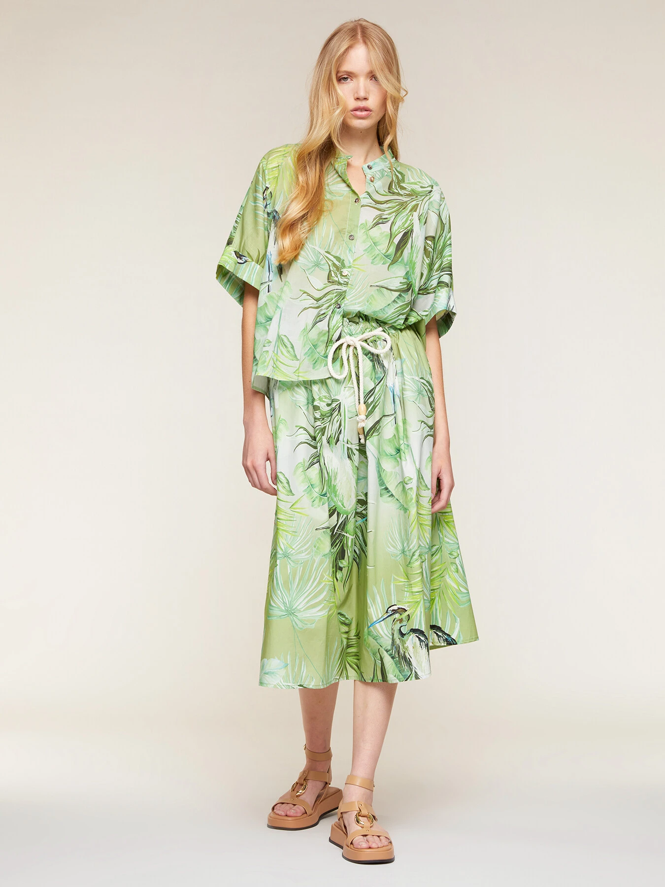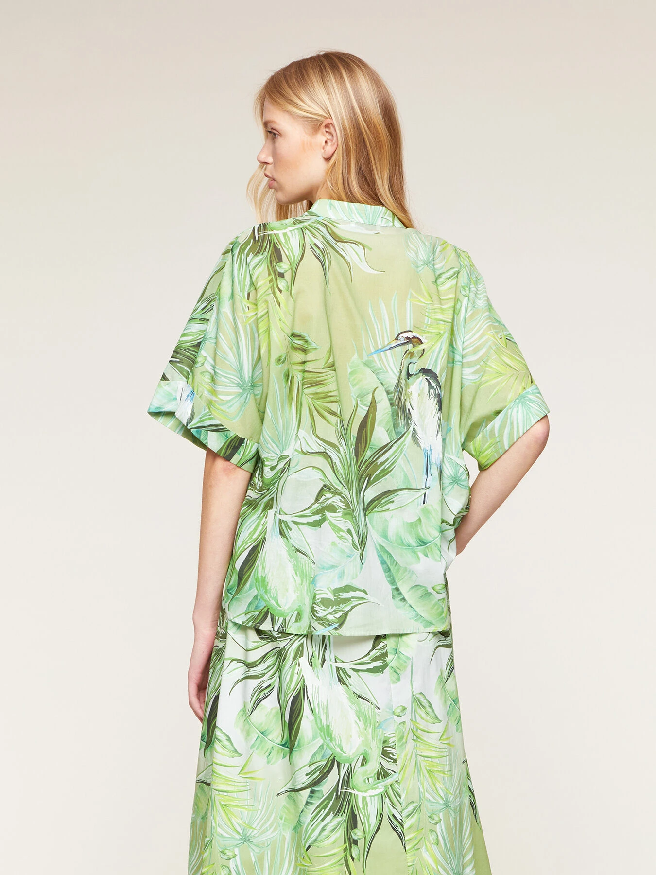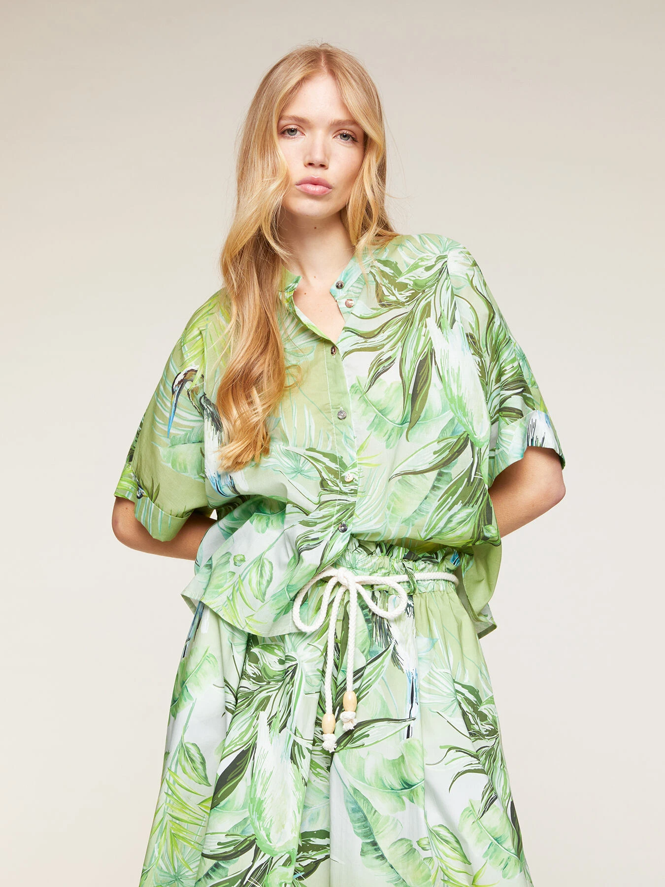 Camicia over fantasia foliage in mussola di cotone; modello a kimono con collo alla coreana e bottoni a vista effetto madreperla; maniche corte con risvolto impunturato.