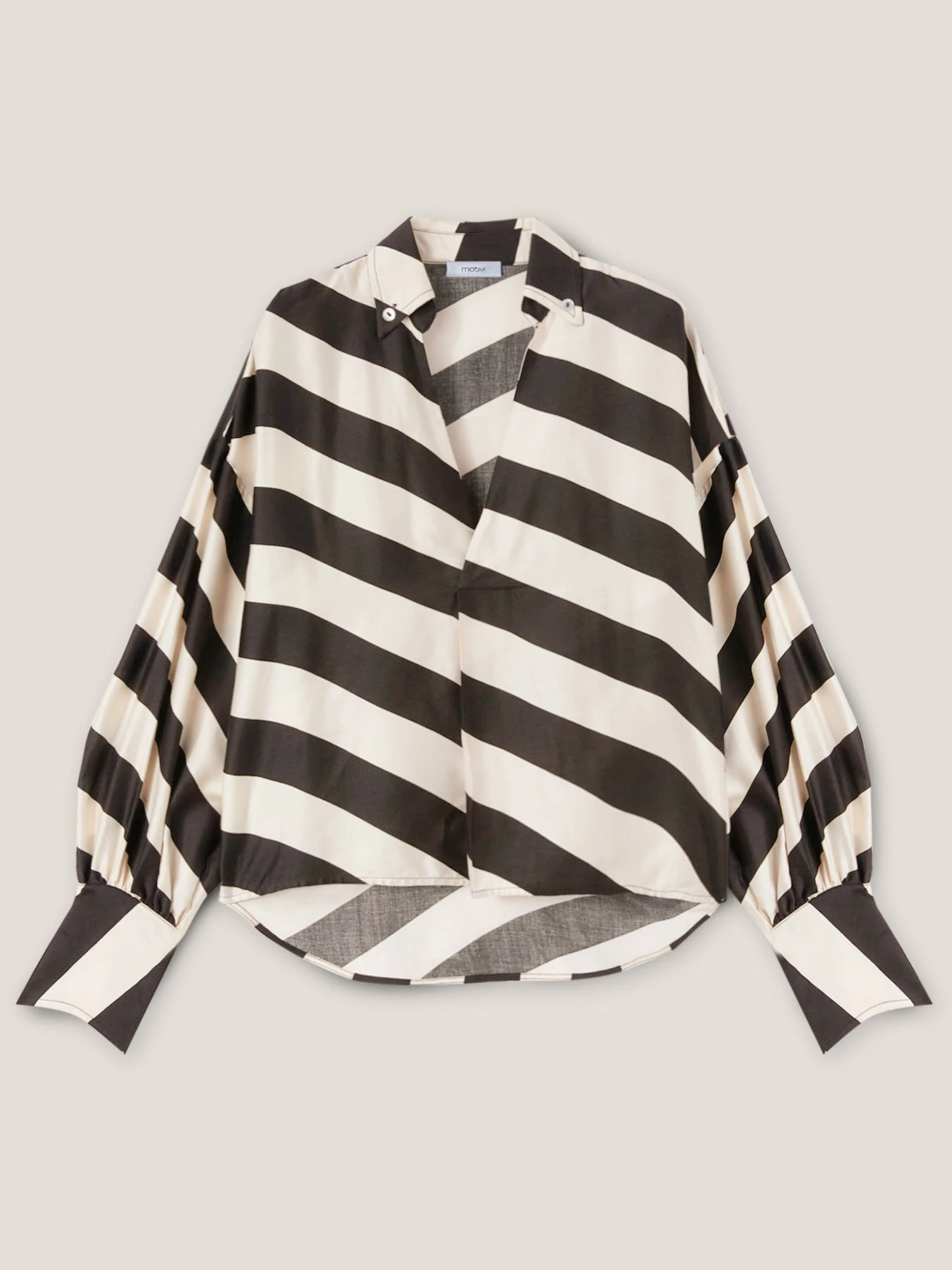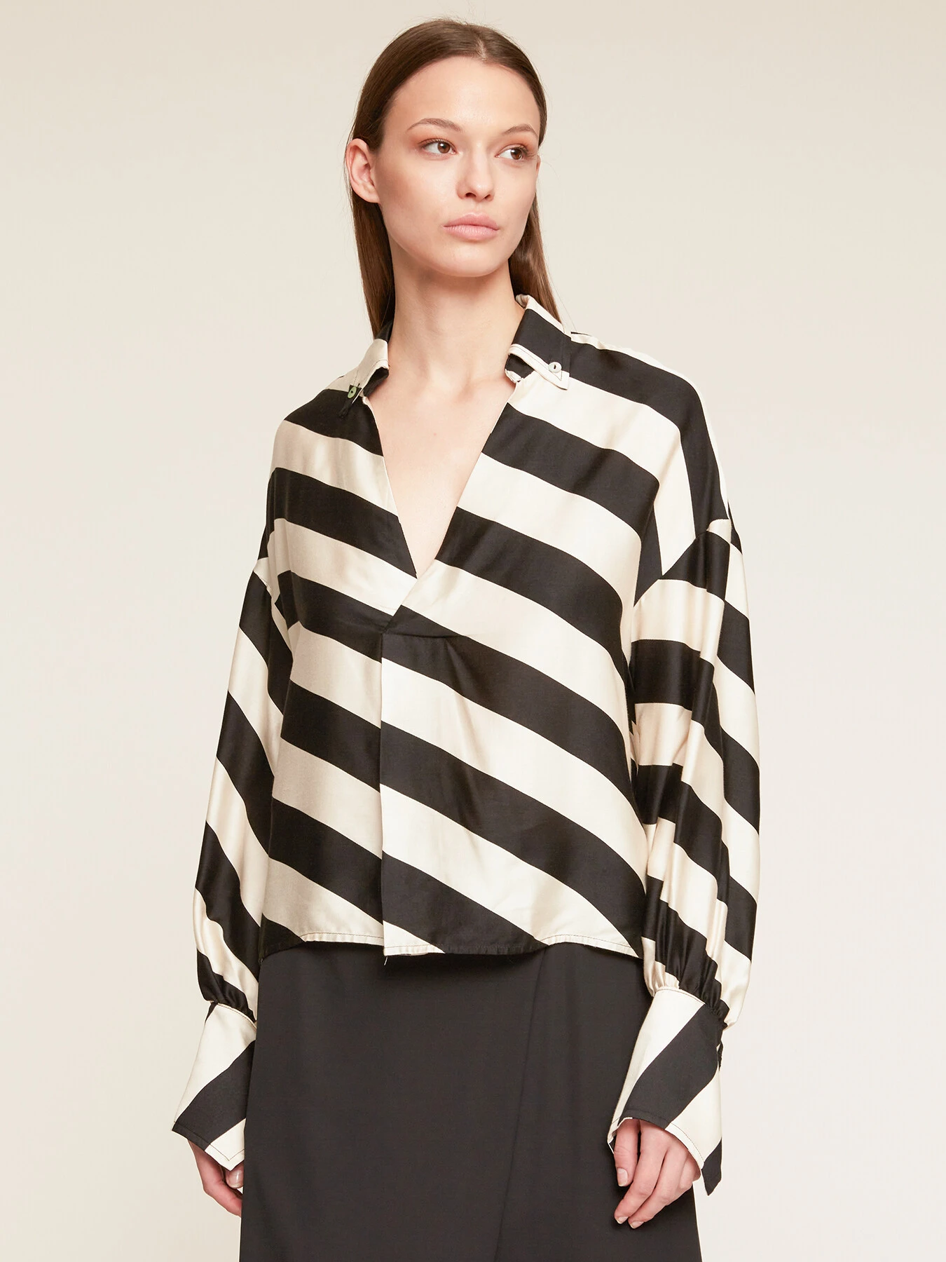 Camicia over in raso a righe; profondo scollo a v frontale e colletto a vela con bottoni; maniche lunghe ampie con polsino sagomato sul fondo.
