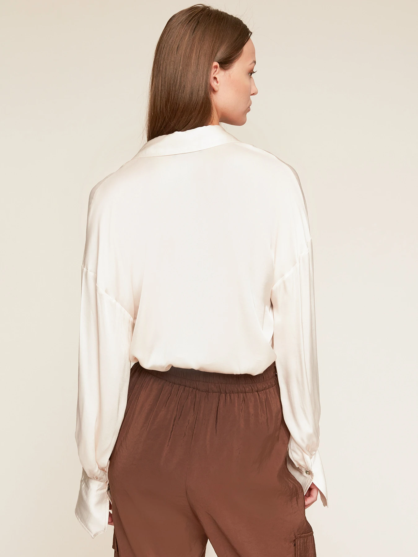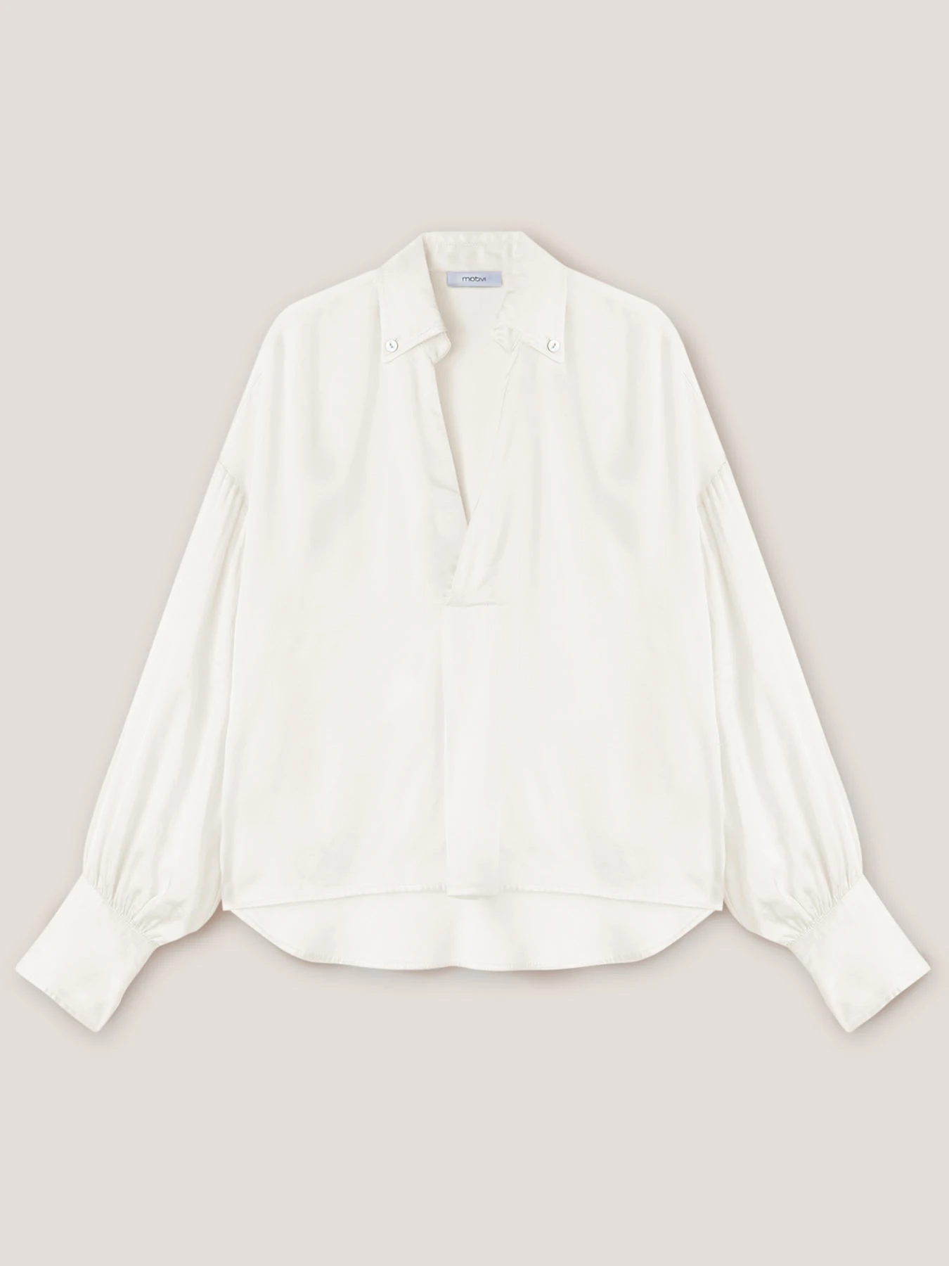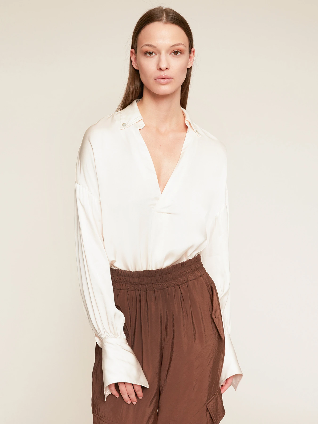 Camicia over in raso di viscosa tinta unita; profondo scollo a v frontale con colletto a vela; maniche ampie con polsino sagomato sul fondo.