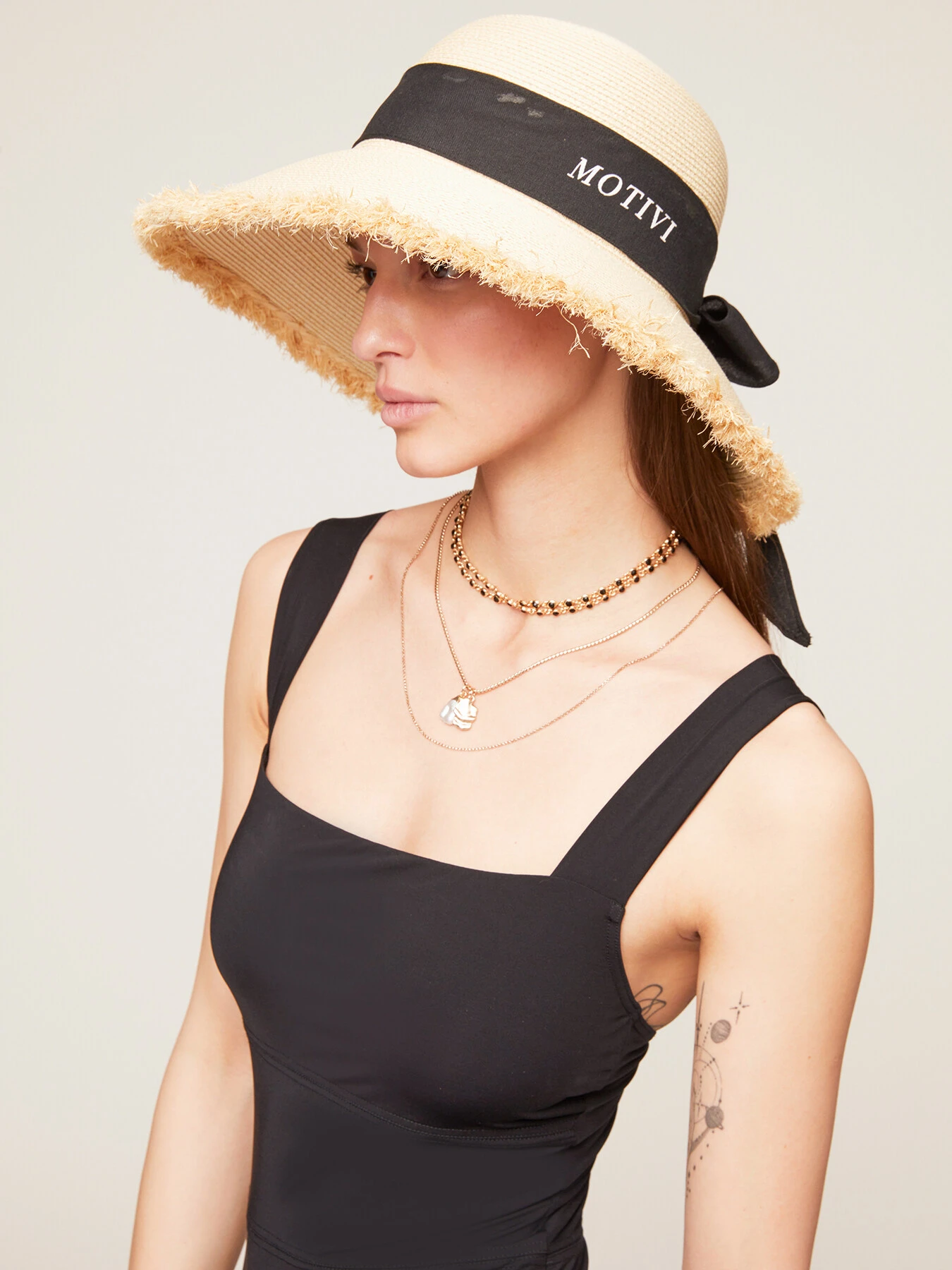 Cappello estivo in paglia; tesa larga con sfrangiatura ai bordi; nastro in contrasto colore con logo.