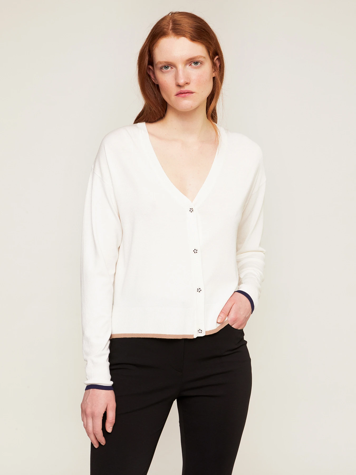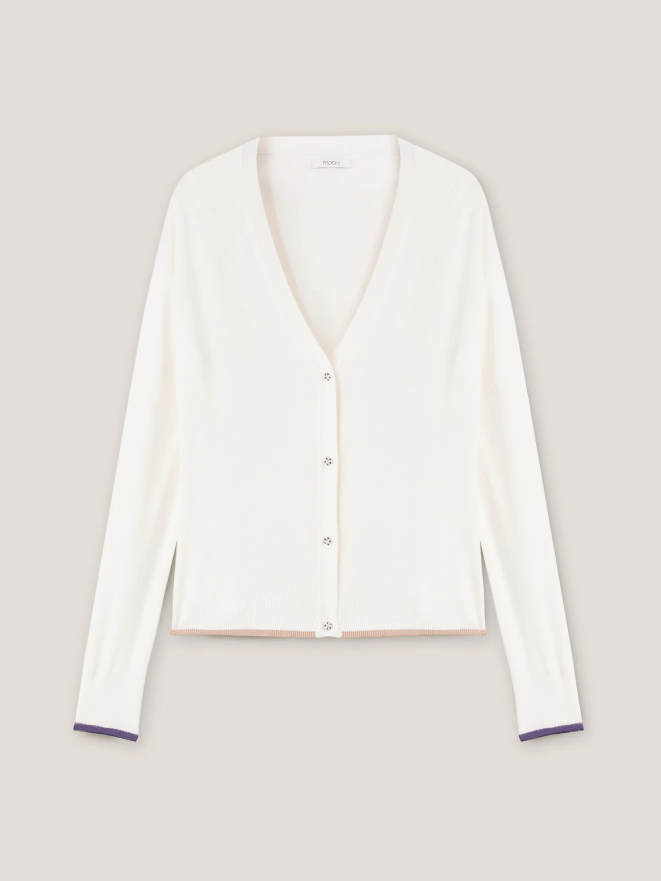 Cardigan corto in filato misto viscosa dalla mano crêpe con bordi colorati; chiusura frontale a v con bottoni a vista gioiello; maniche lunghe, spacchi laterali e fondo asimmetrico.