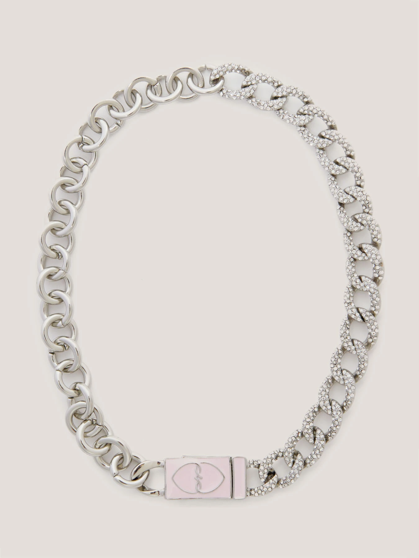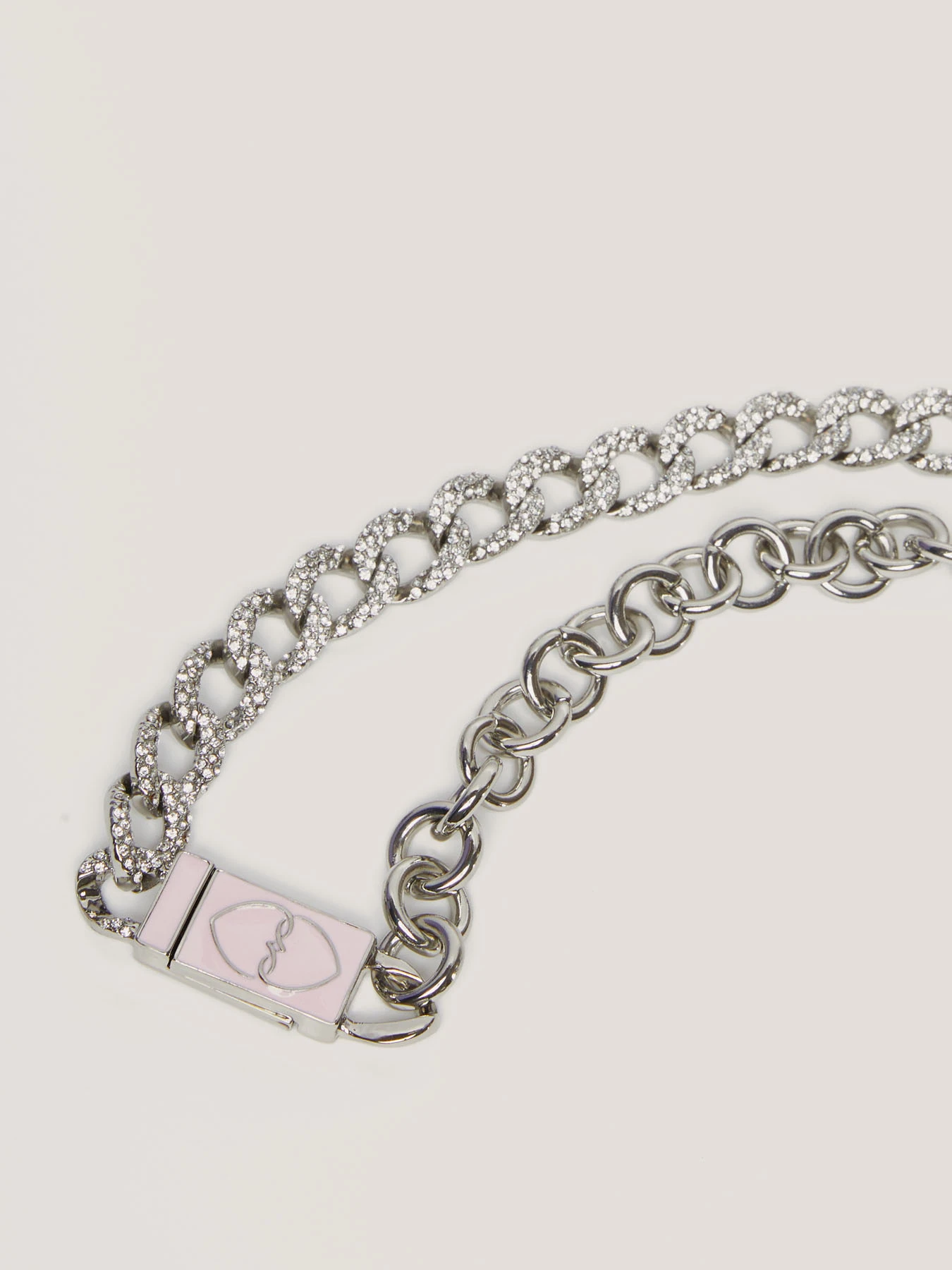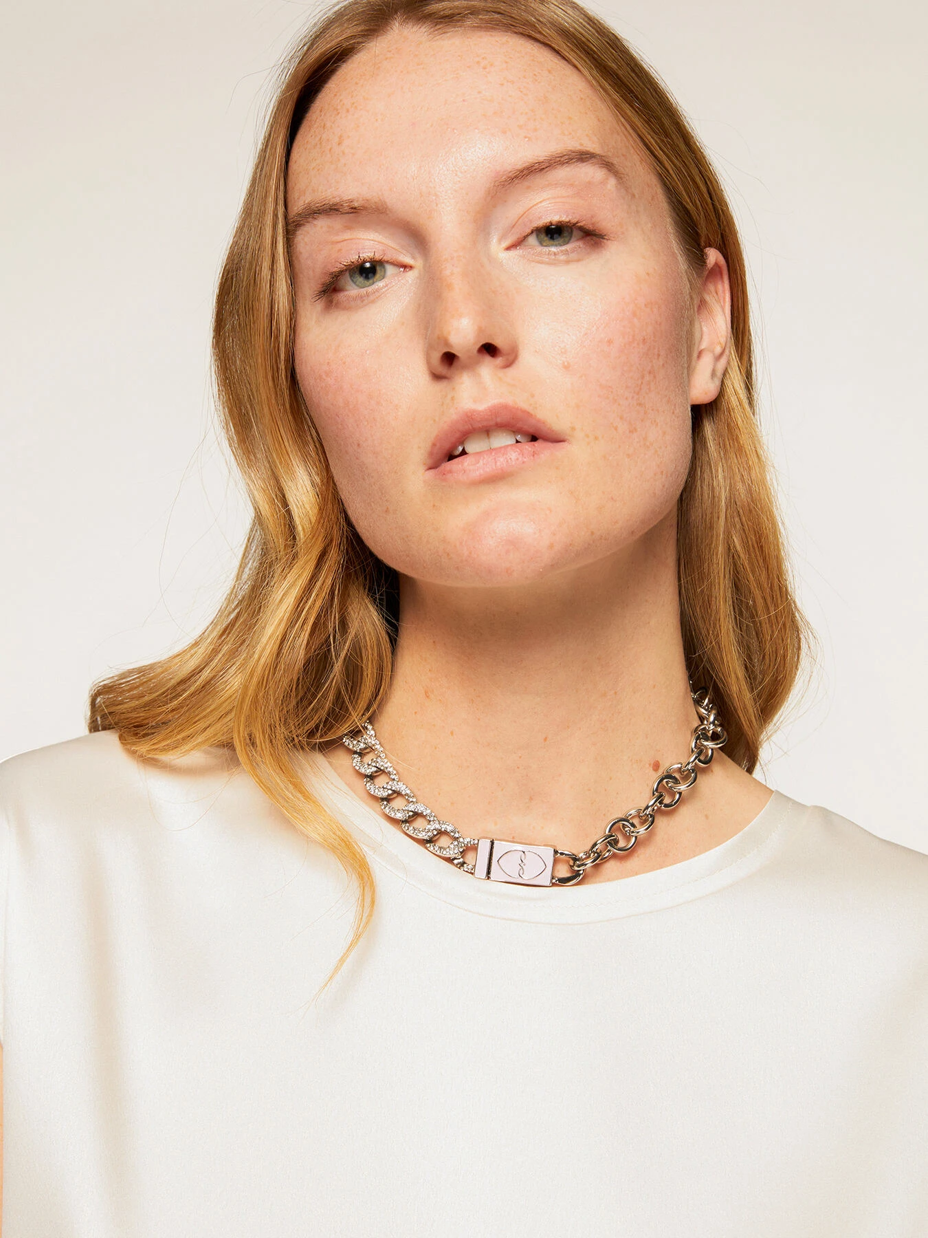 Collana girocollo a catena metallica color argento e strass crystal; chiusura ad aggancio; tutti i bijoux della collezione sono nikel free.