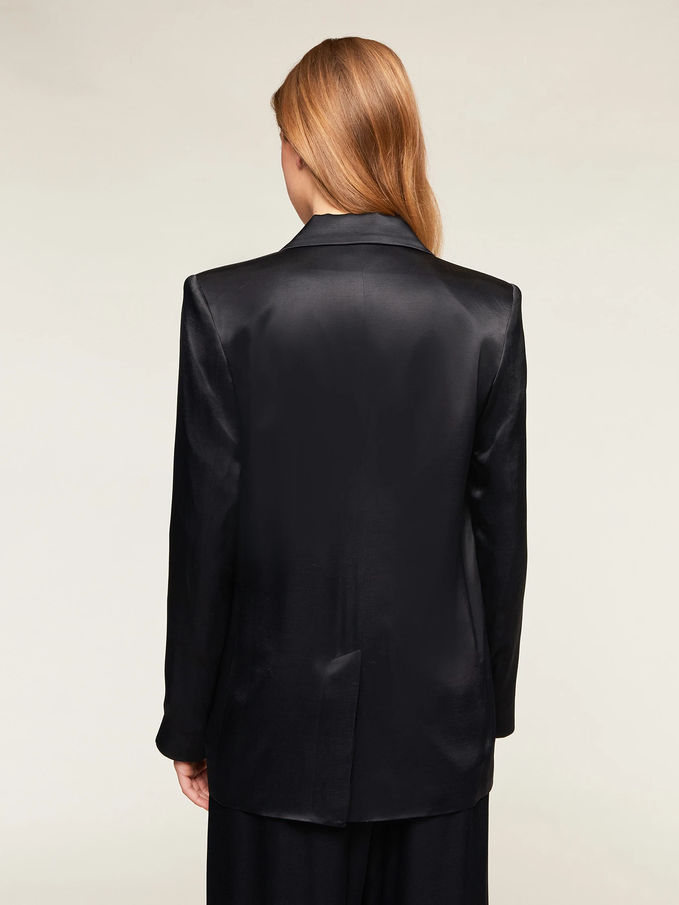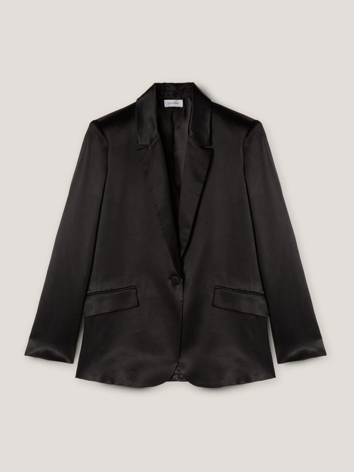 Giacca blazer over in raso tinta unita; chiusura frontale con colletto a revers e chiusura monopetto; tasche a patta anteriori, maniche lunghe.