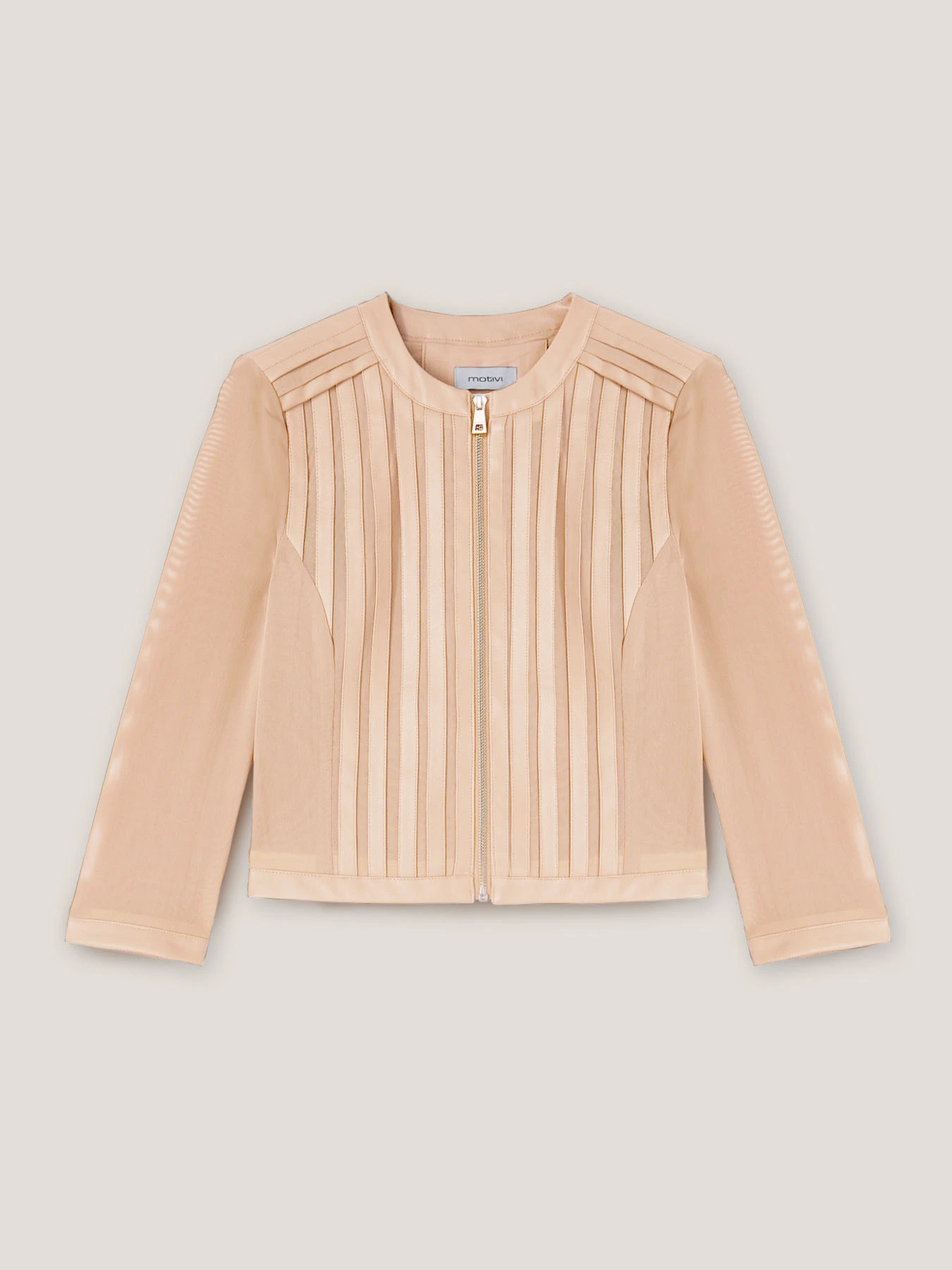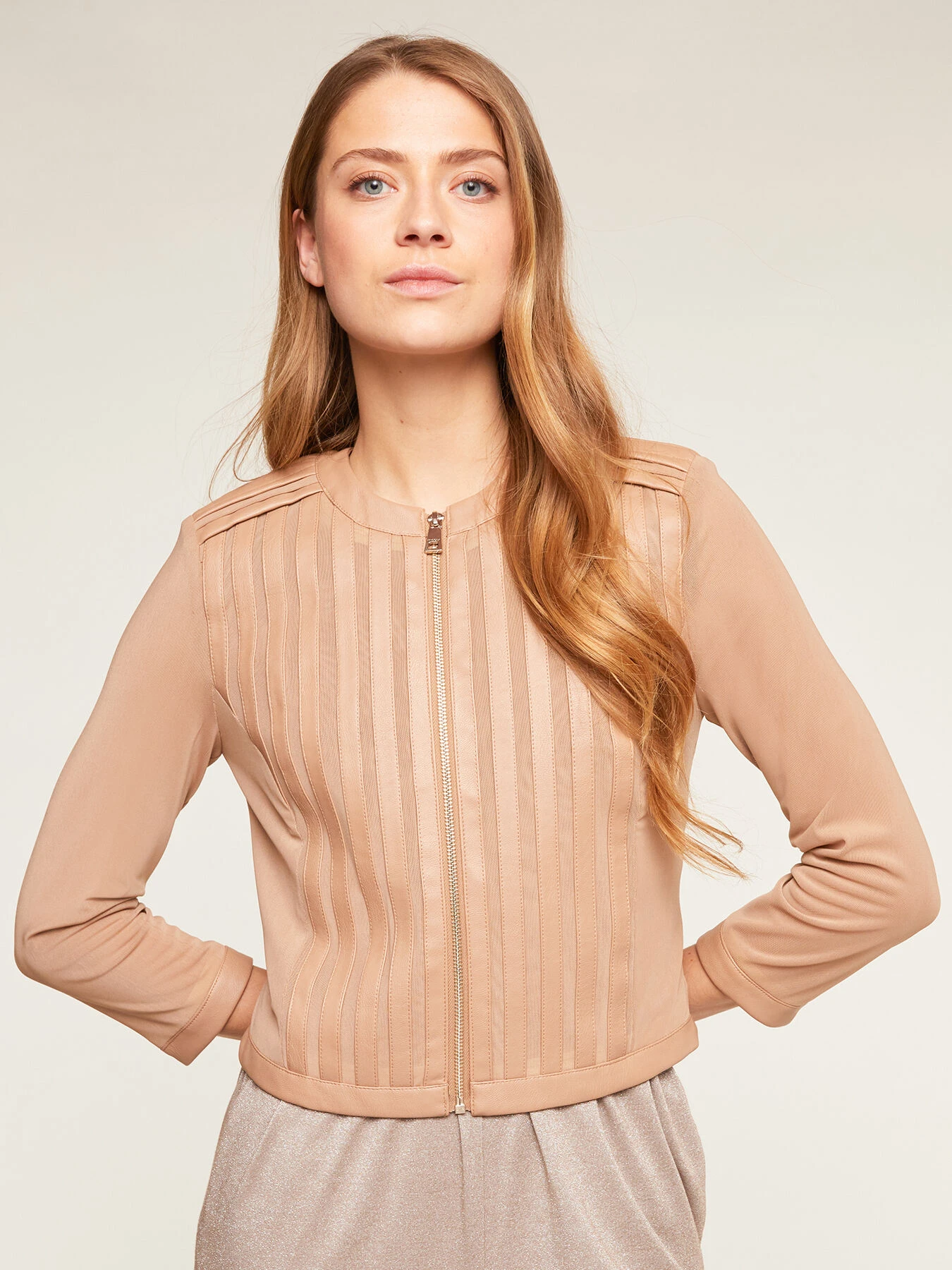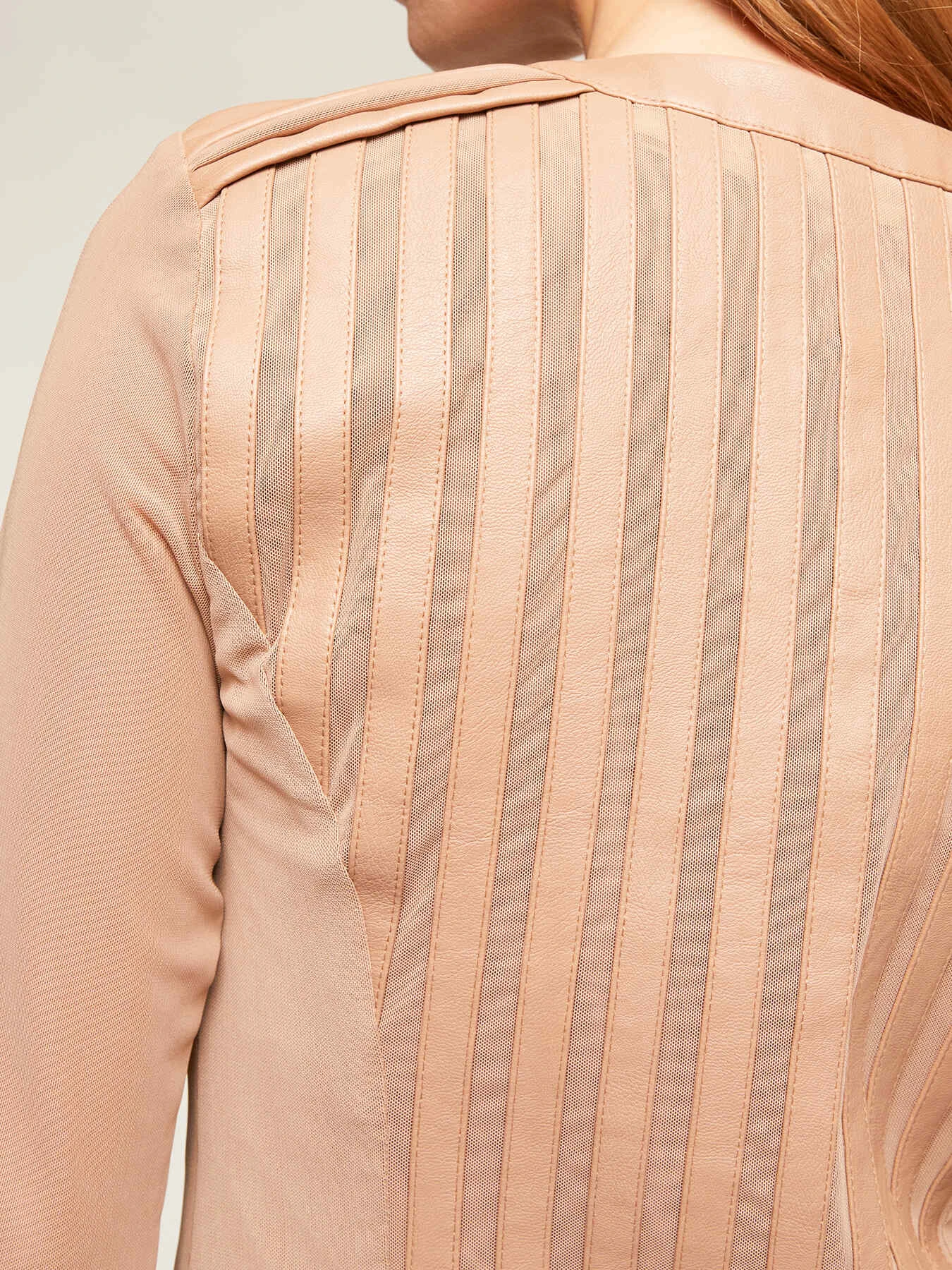 Giacca corta effetto pelle con inserti in tulle rigido; chiusura frontale con scollo tondo e zip; maniche lunghezza tre quarti.
