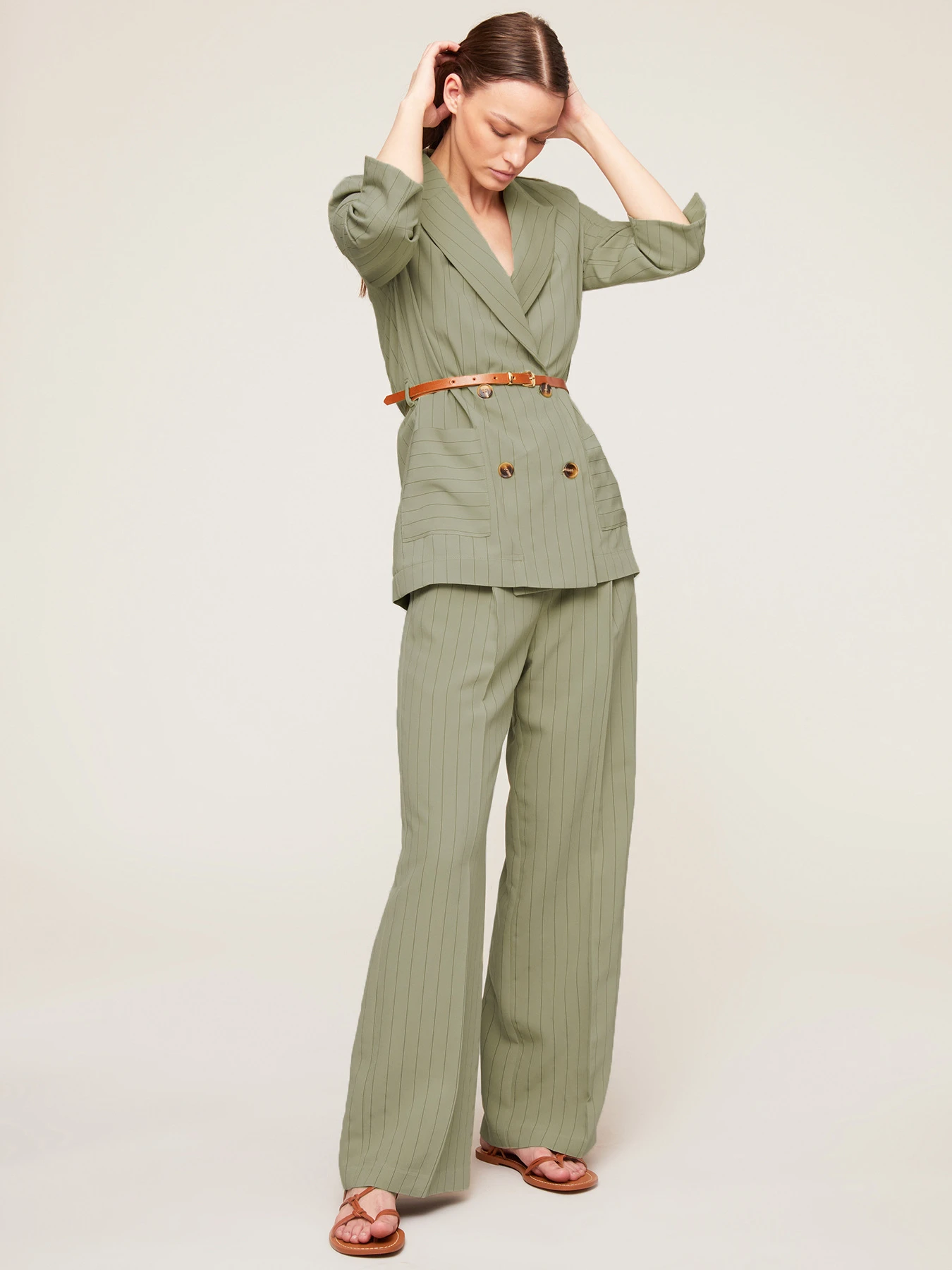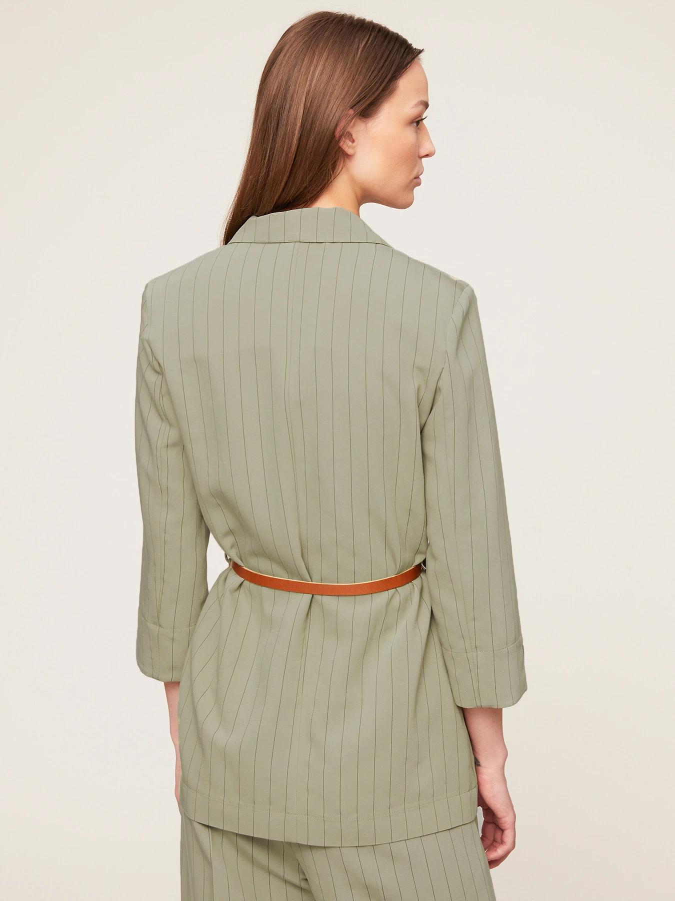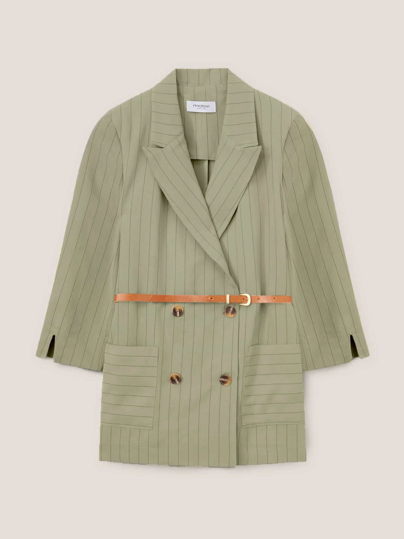 Giacca doppiopetto gessata in tessuto misto viscosa senza fodera interna; colletto a lancia e chiusura doppiopetto, cinturino in vita in similpelle; maniche lunghezza tre quarti con spacchi al fondo e spallina imbottita all’interno; tasche applicate frontali. MADE IN ITALY
