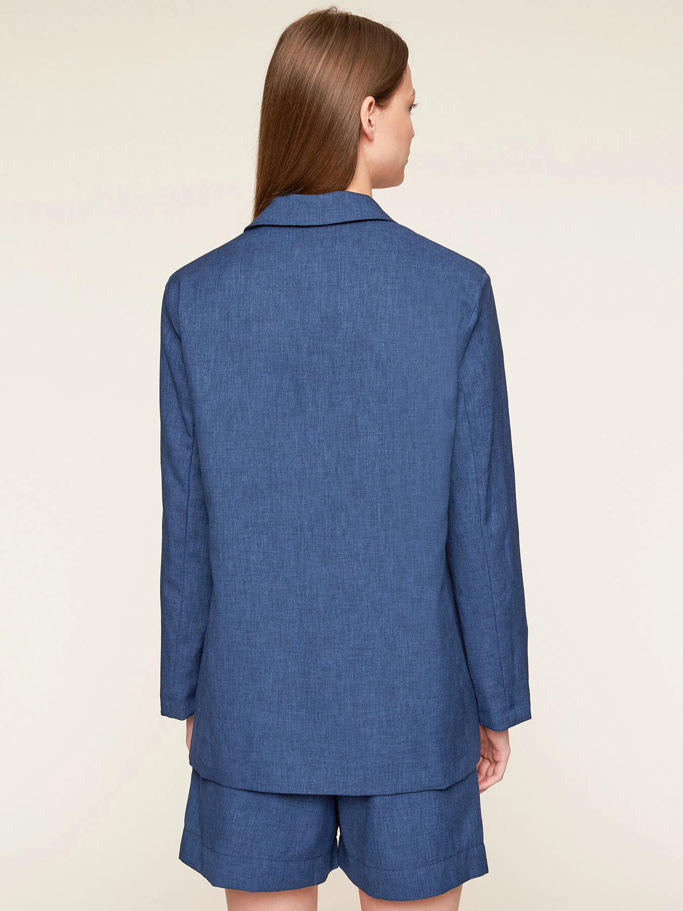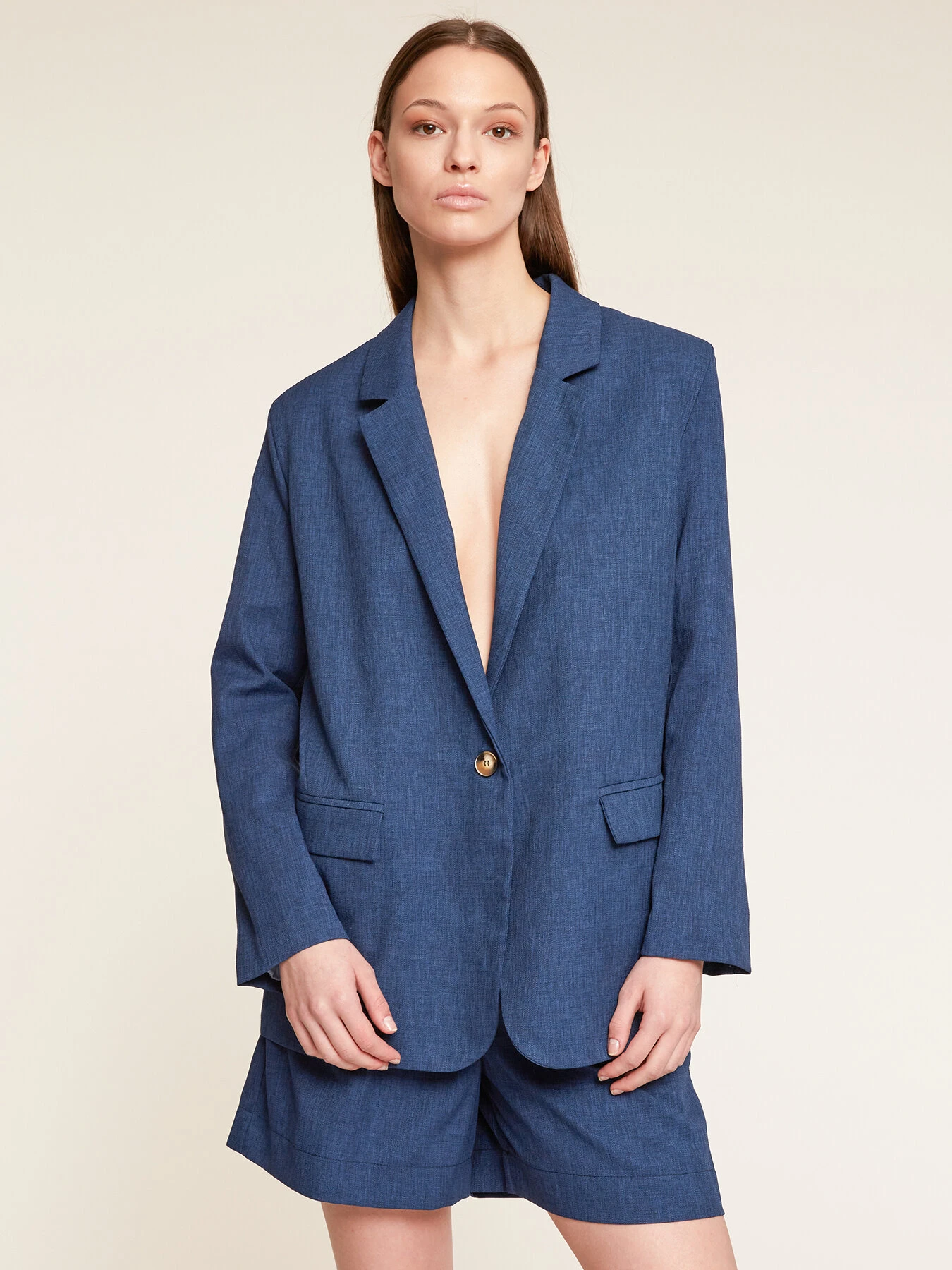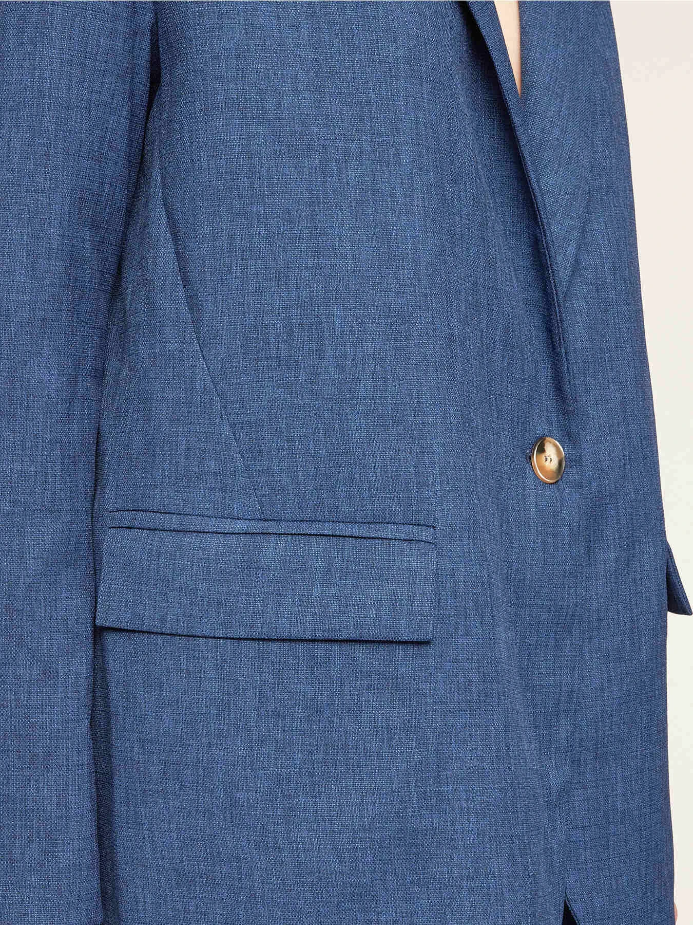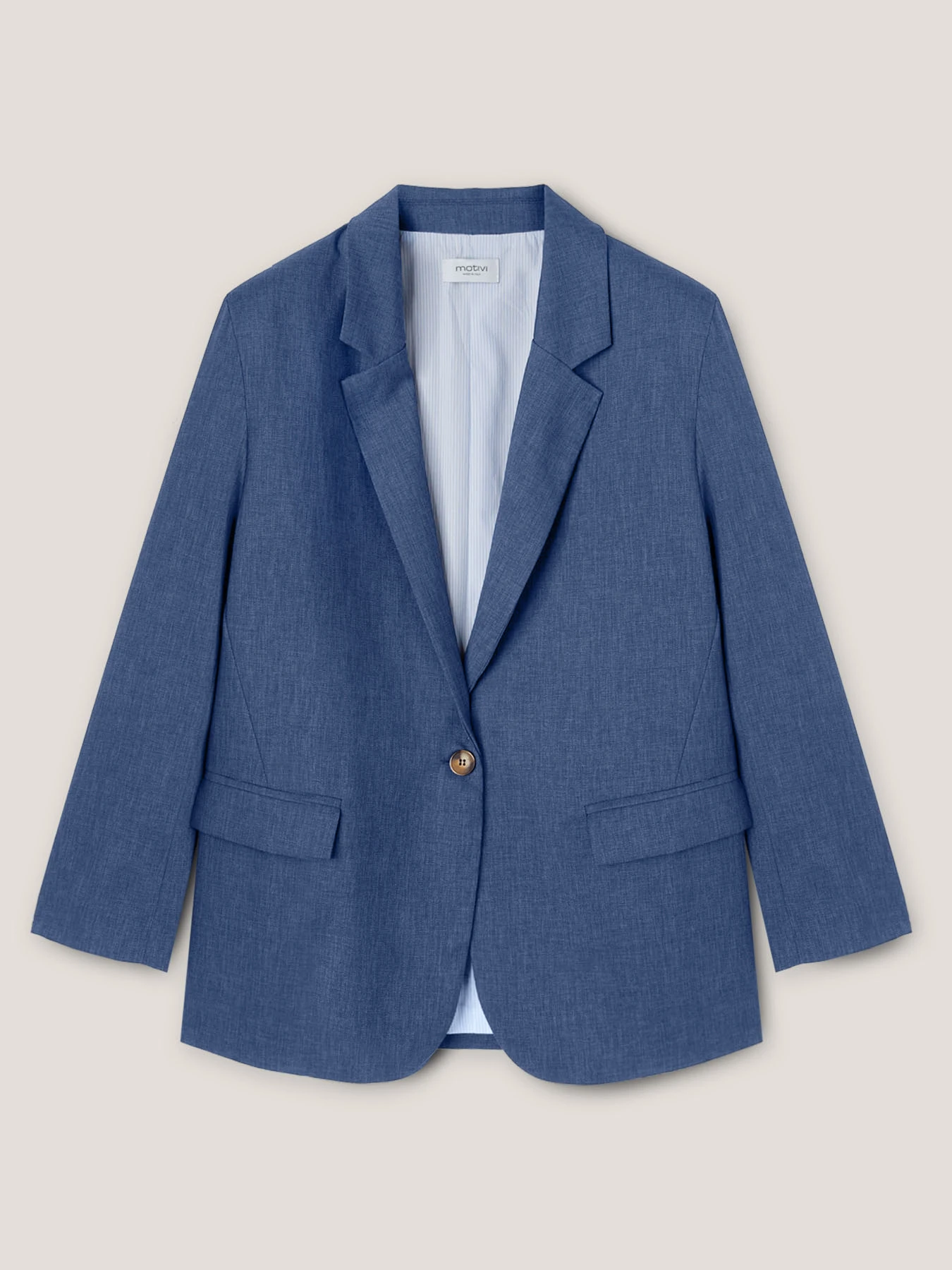 Giacca blazer over in tela con fodera interna a righe; chiusura frontale monopetto ad un bottone e colletto a revers; tasche anteriori a patta, maniche lunghe. MADE IN ITALY