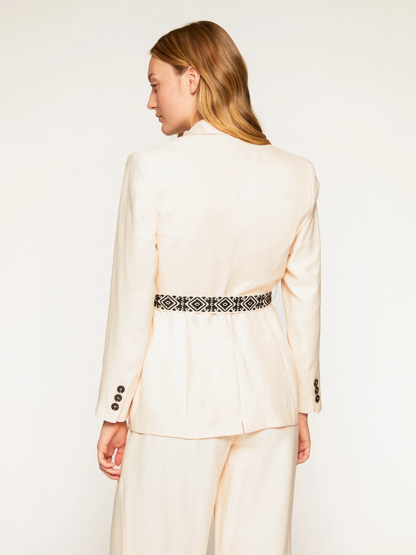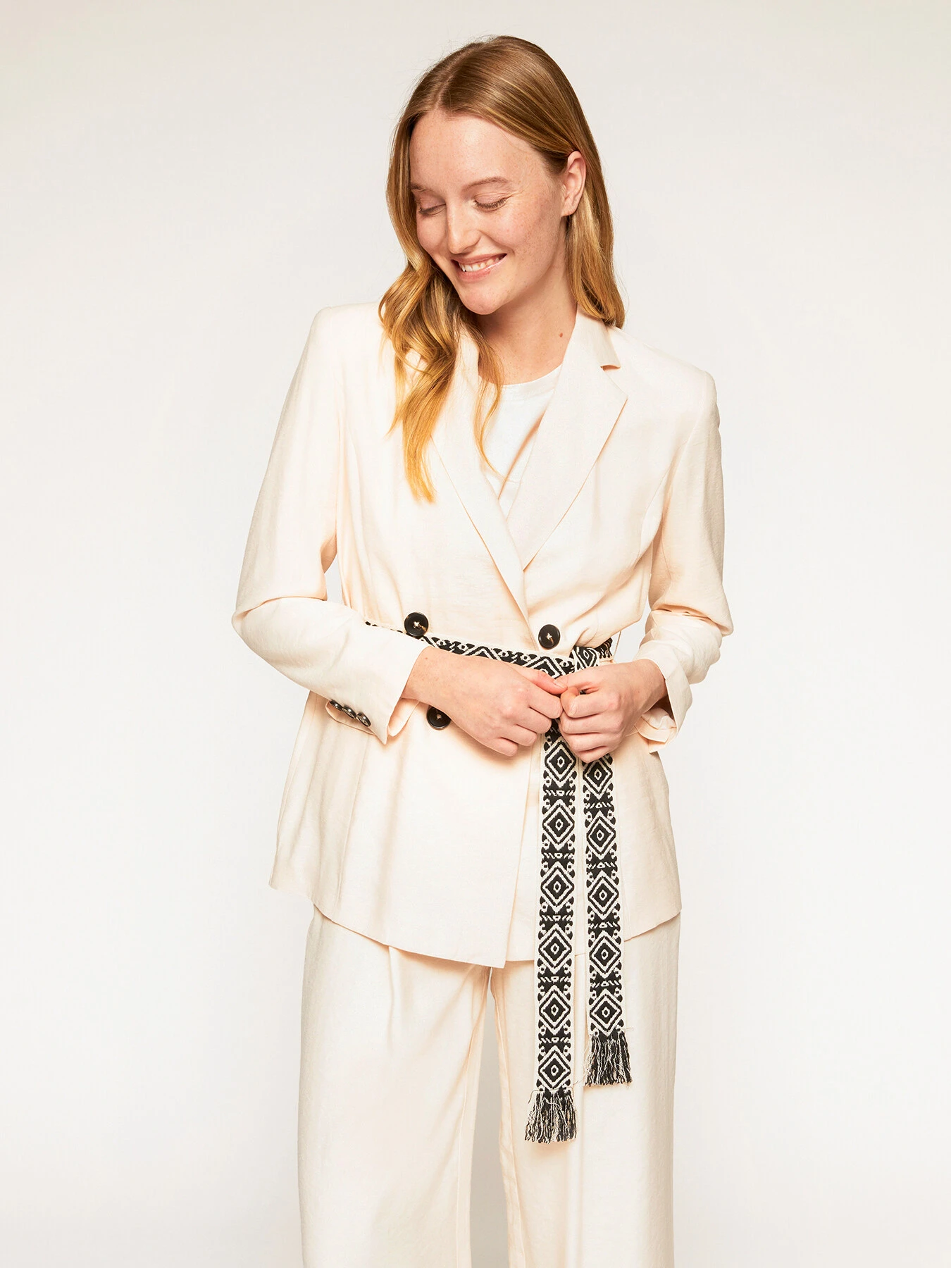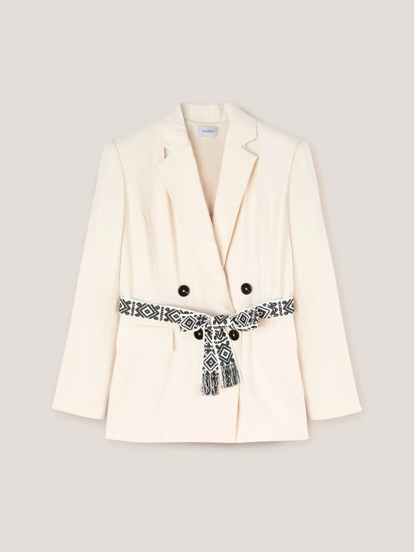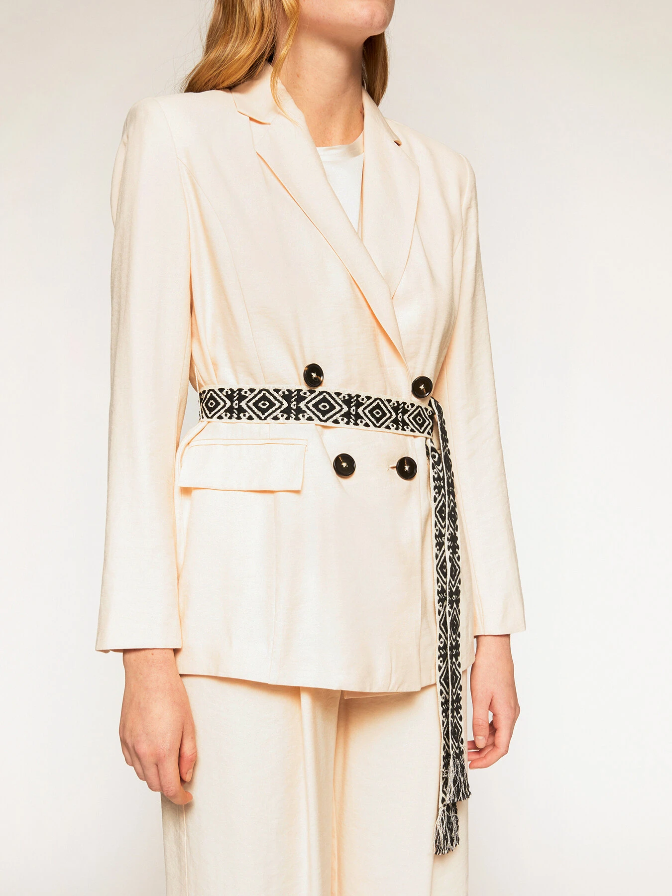Giacca sfoderata in raso debacato; chiusura frontale con colletto a revers e chiusura doppiopetto con bottoni a vista; tasche anteriori con patta, maniche lunghe, cintura in gros grain fantasia etnica.