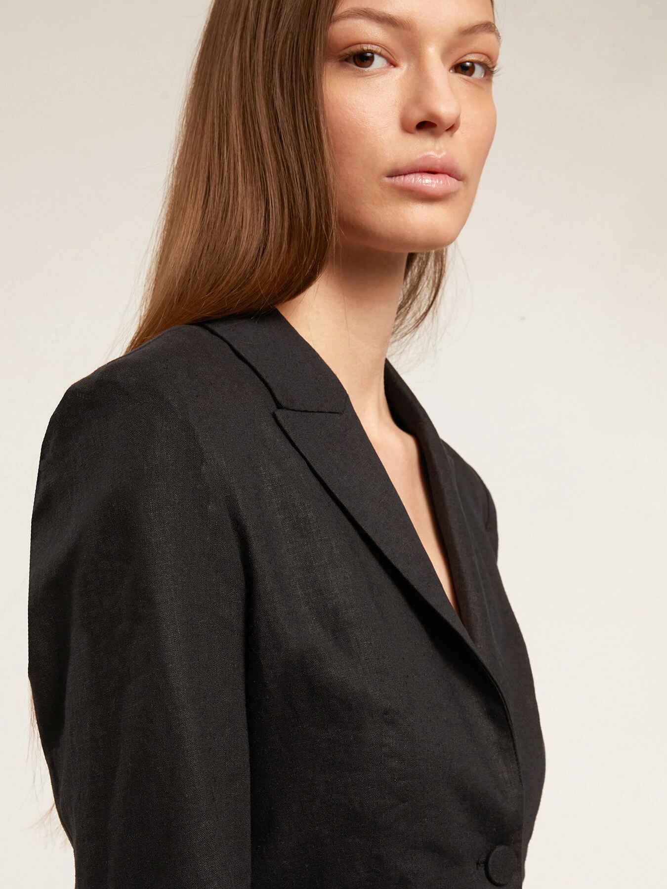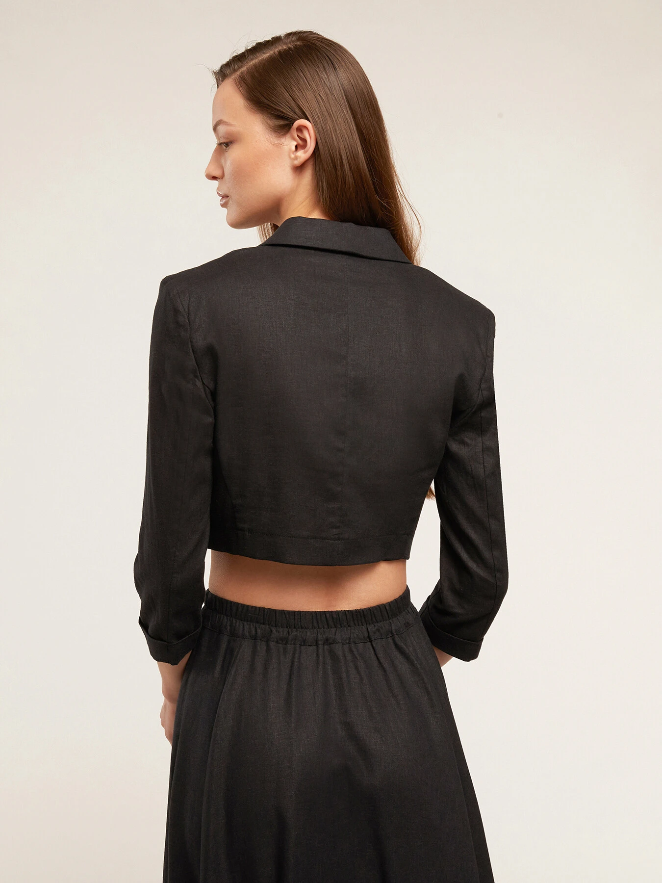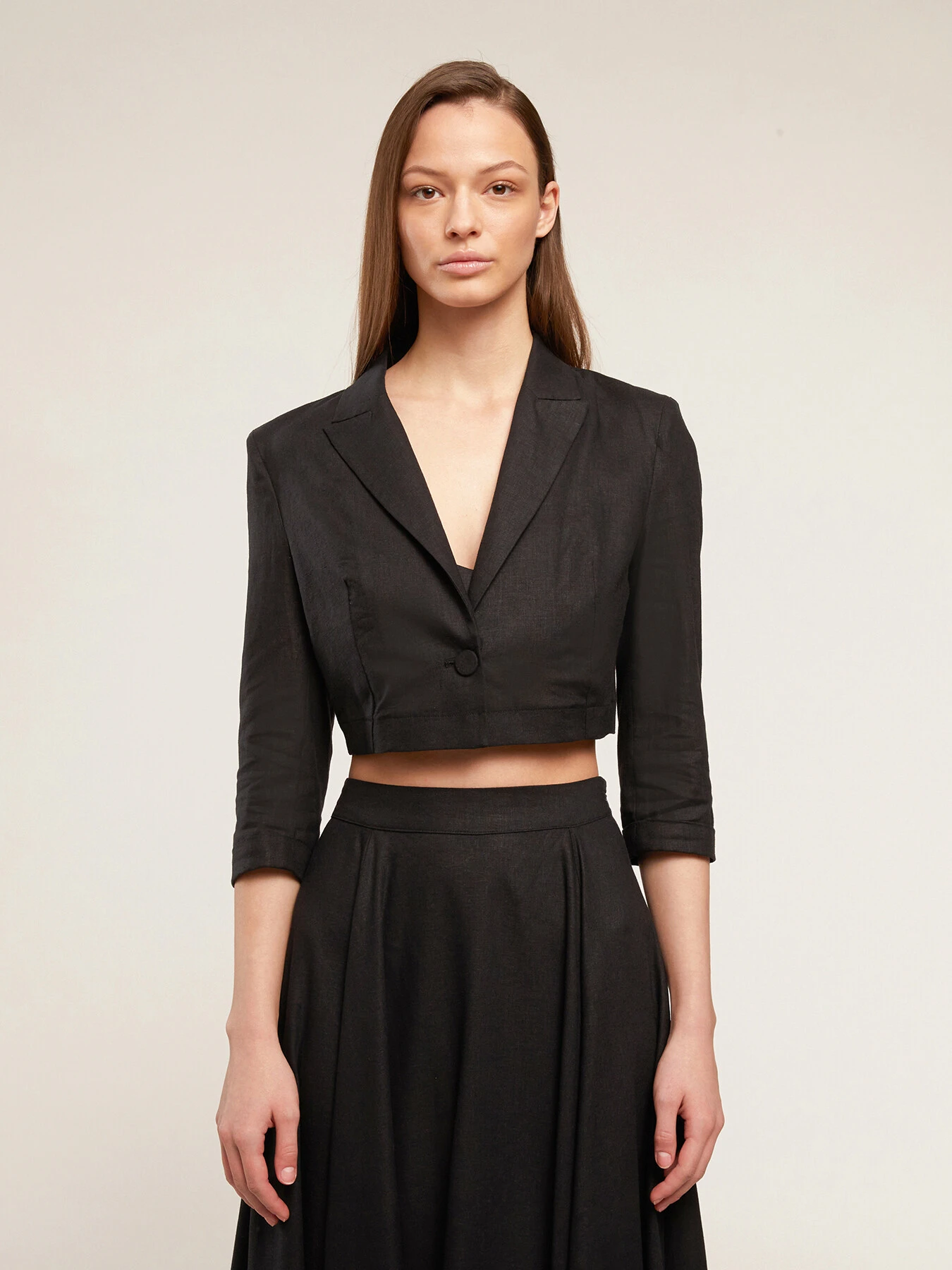 Giacca spencer in tela di lino misto viscosa tinta unita; chiusura frontale monopetto con colletto a revers e bottoni a vista; maniche lunghezza tre quarti.