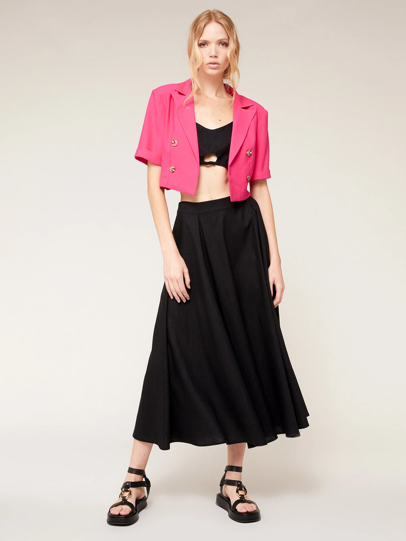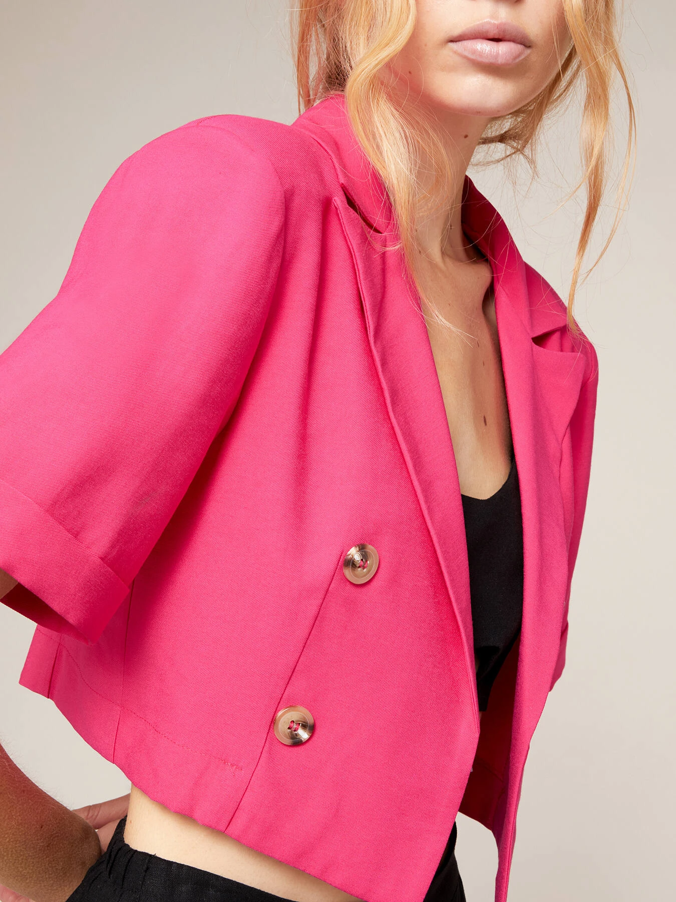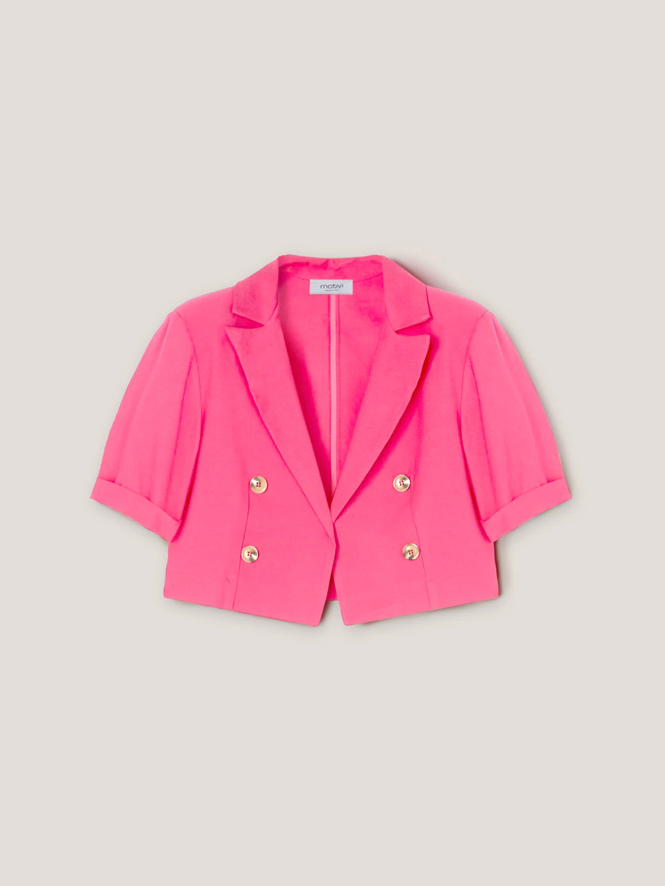 Giacca spencer in poliviscosa tinta unita; apertura frontale con finta abbottonatura doppiopetto e colletto a revers; maniche corte con risvolto sul fondo.