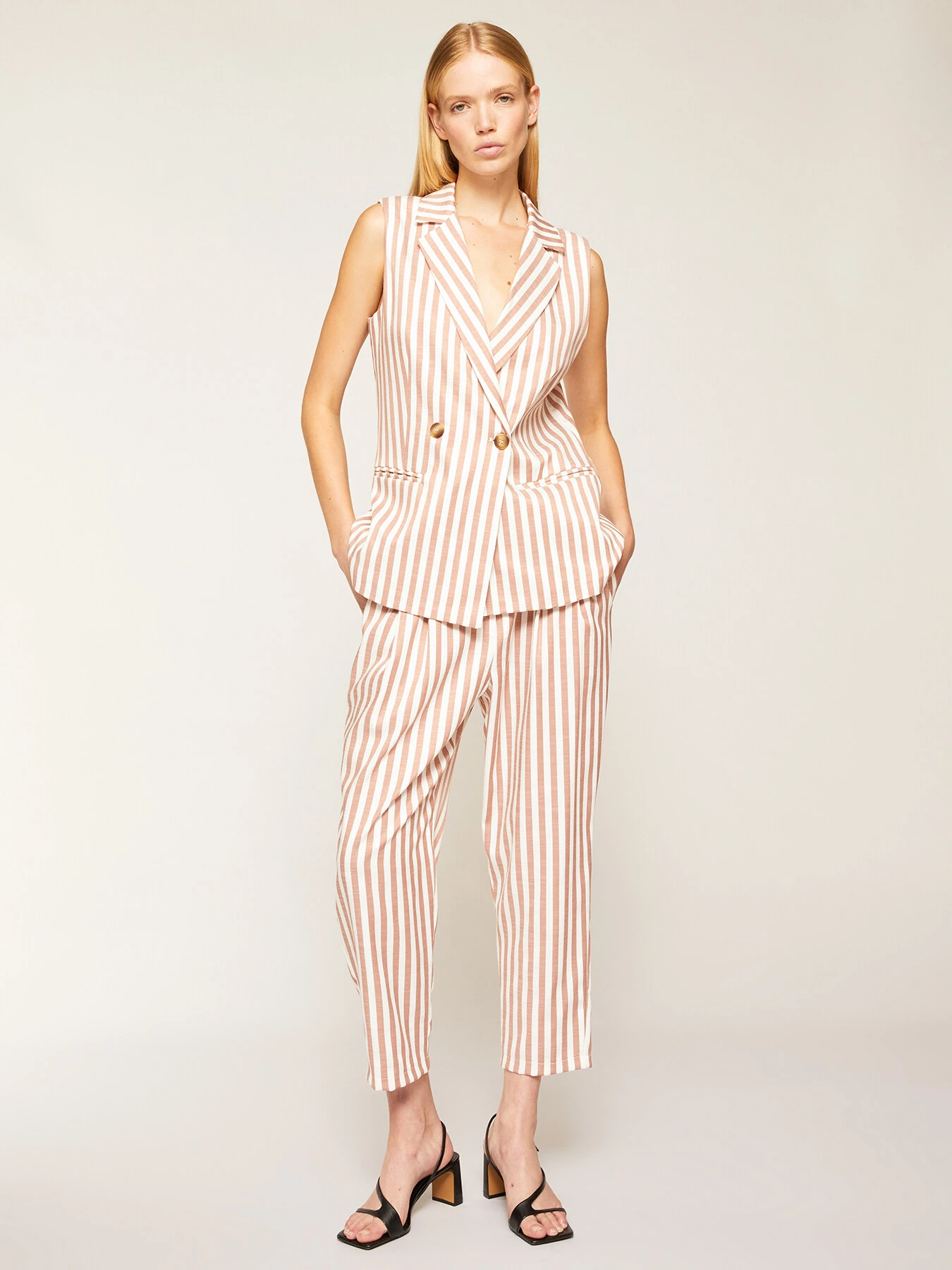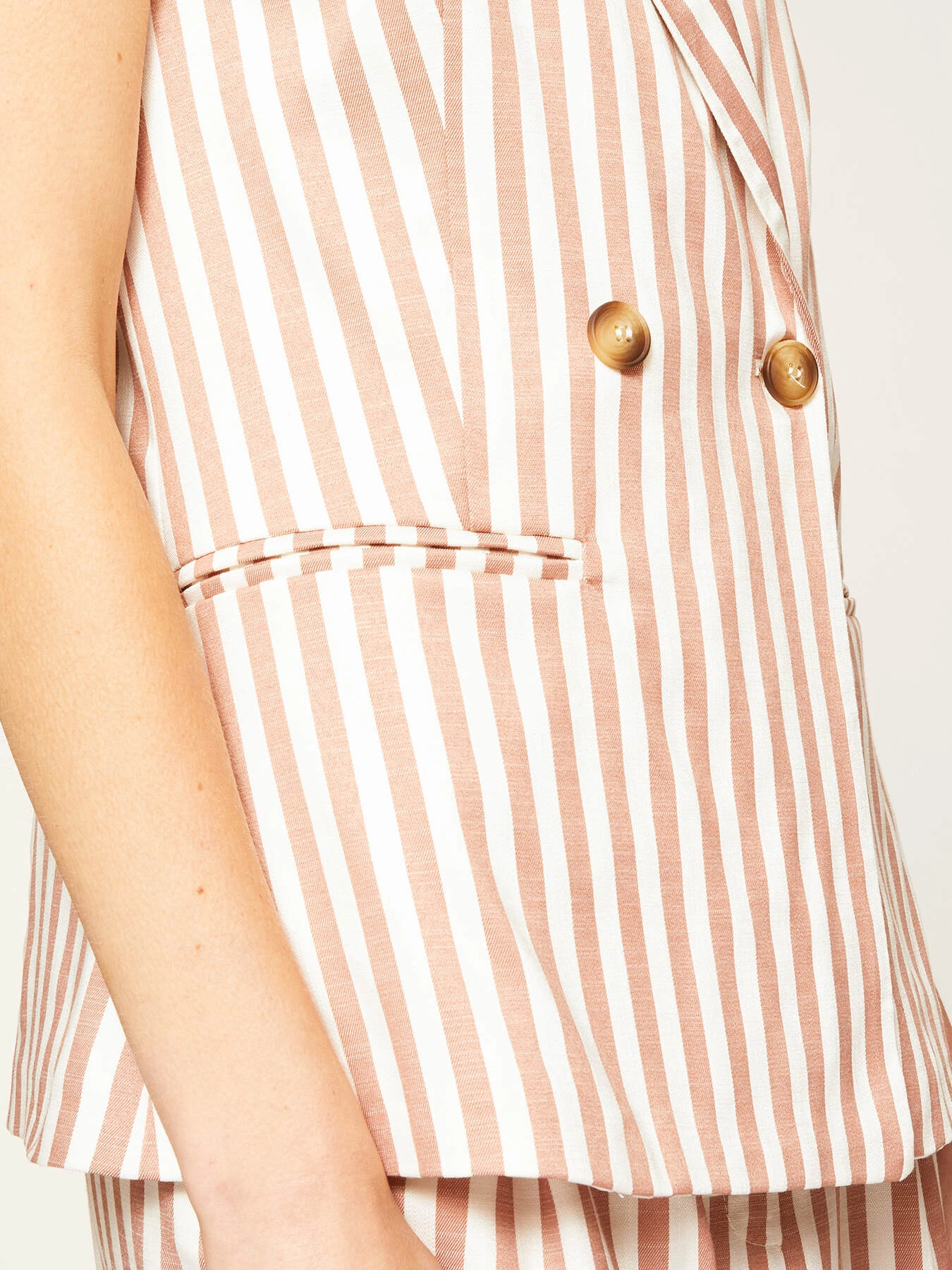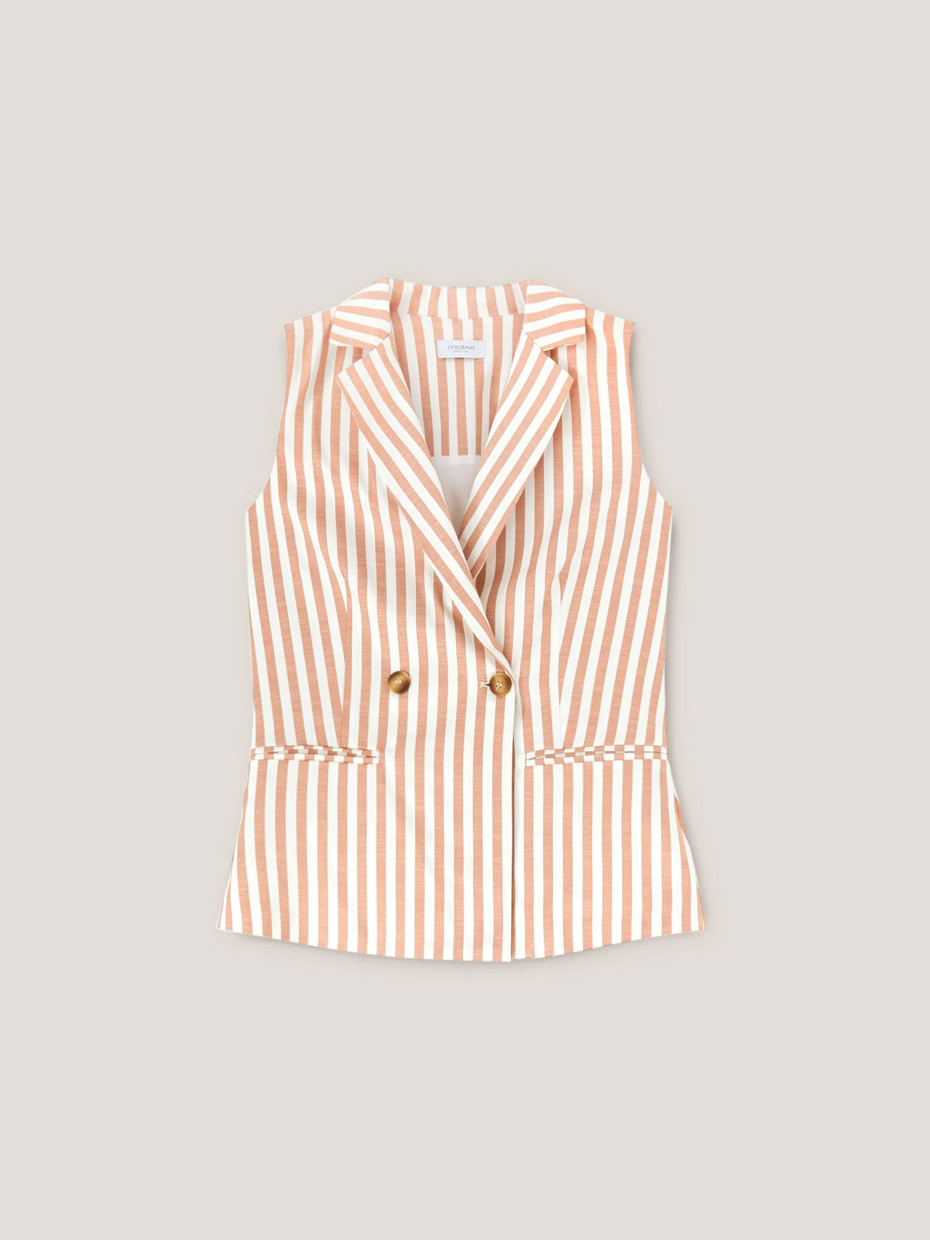 Gilet lungo in tela misto viscosa fantasia a righe foderato internamente; chiusura frontale doppiopetto e colletto a revers; tasche frontali a doppio filetto.