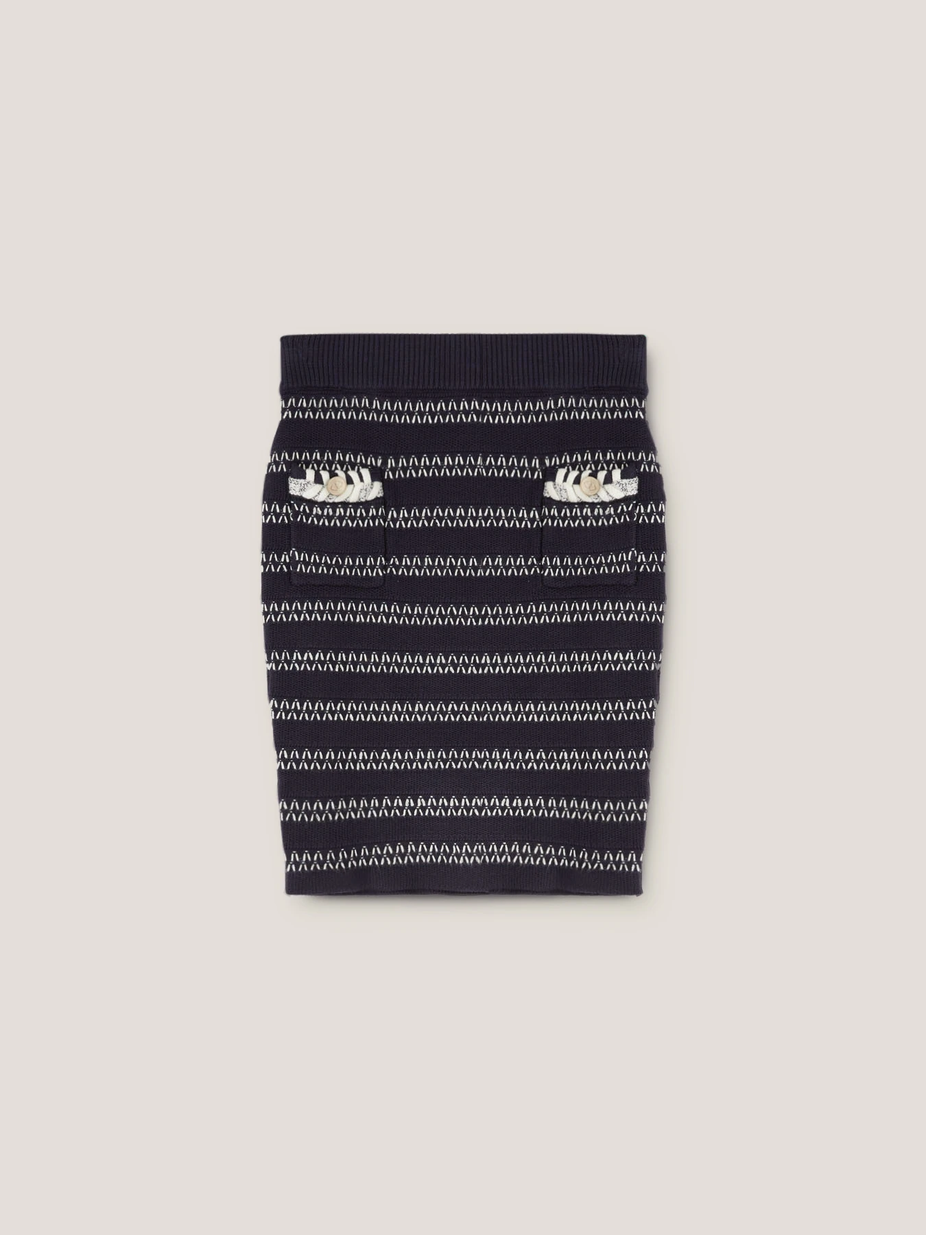 Gonna a tubino in maglia ricamata in filato misto viscosa; vita elastica con bordo a coste; tasche frontali applicate con bottone metallico.
