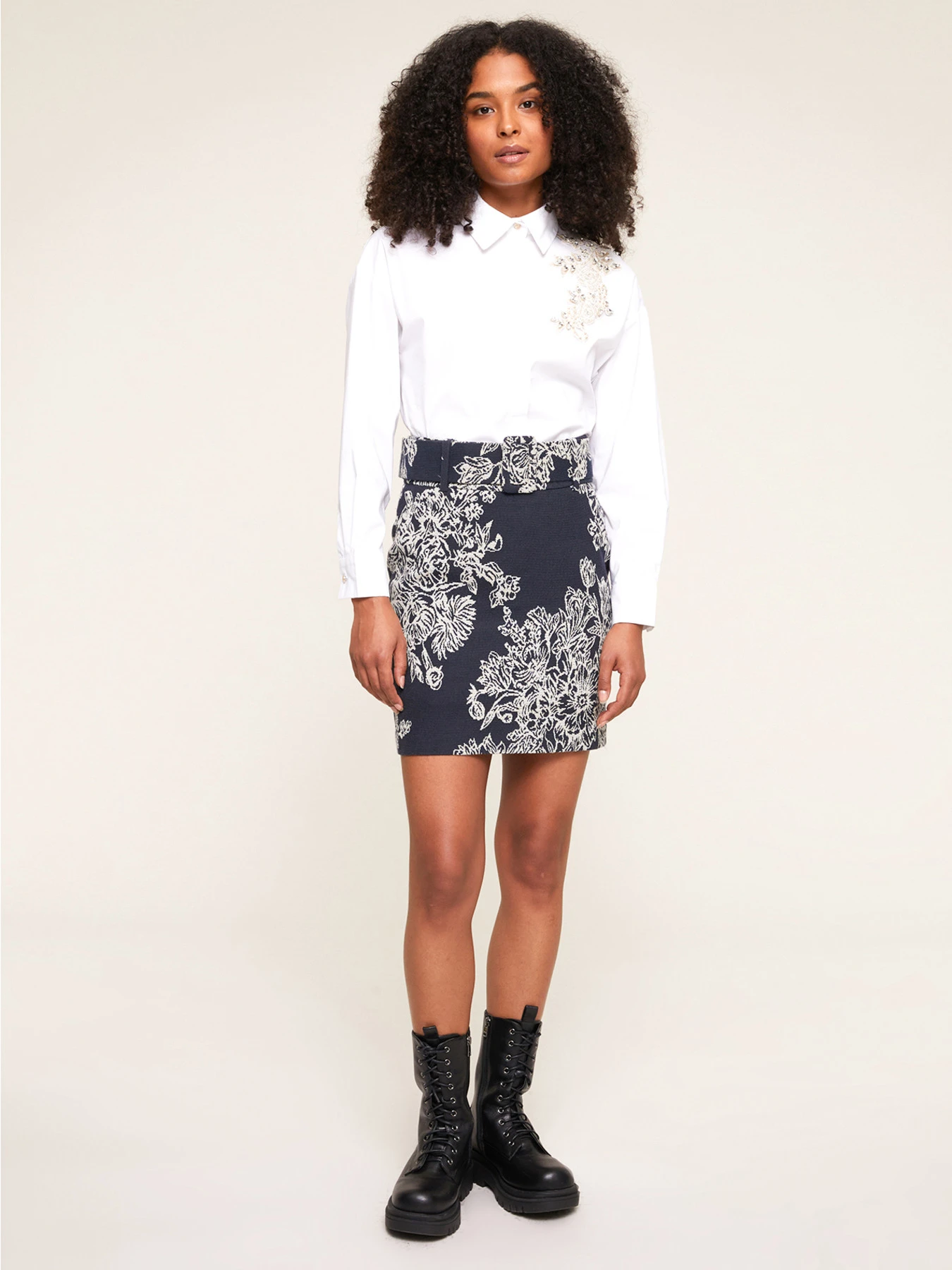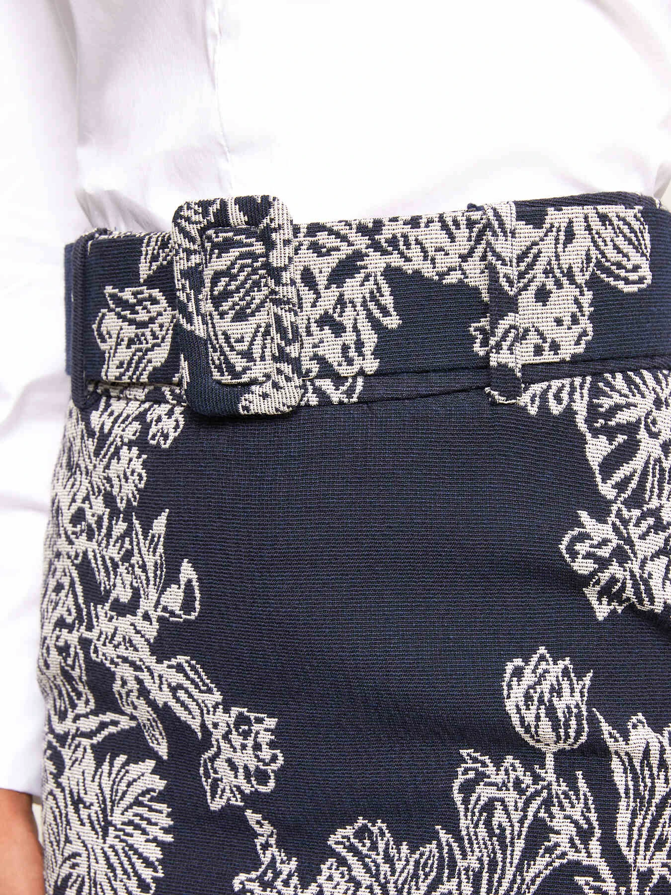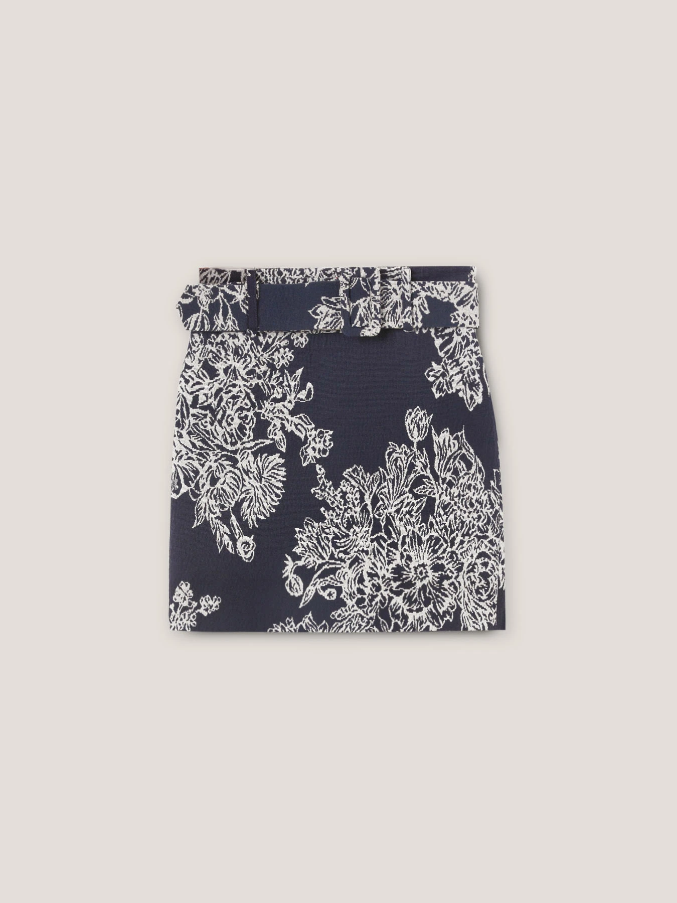 Gonna corta in tessuto jacquard; chiusura nel centro dietro con zip; cintura in vita con fibbia tono su tono.