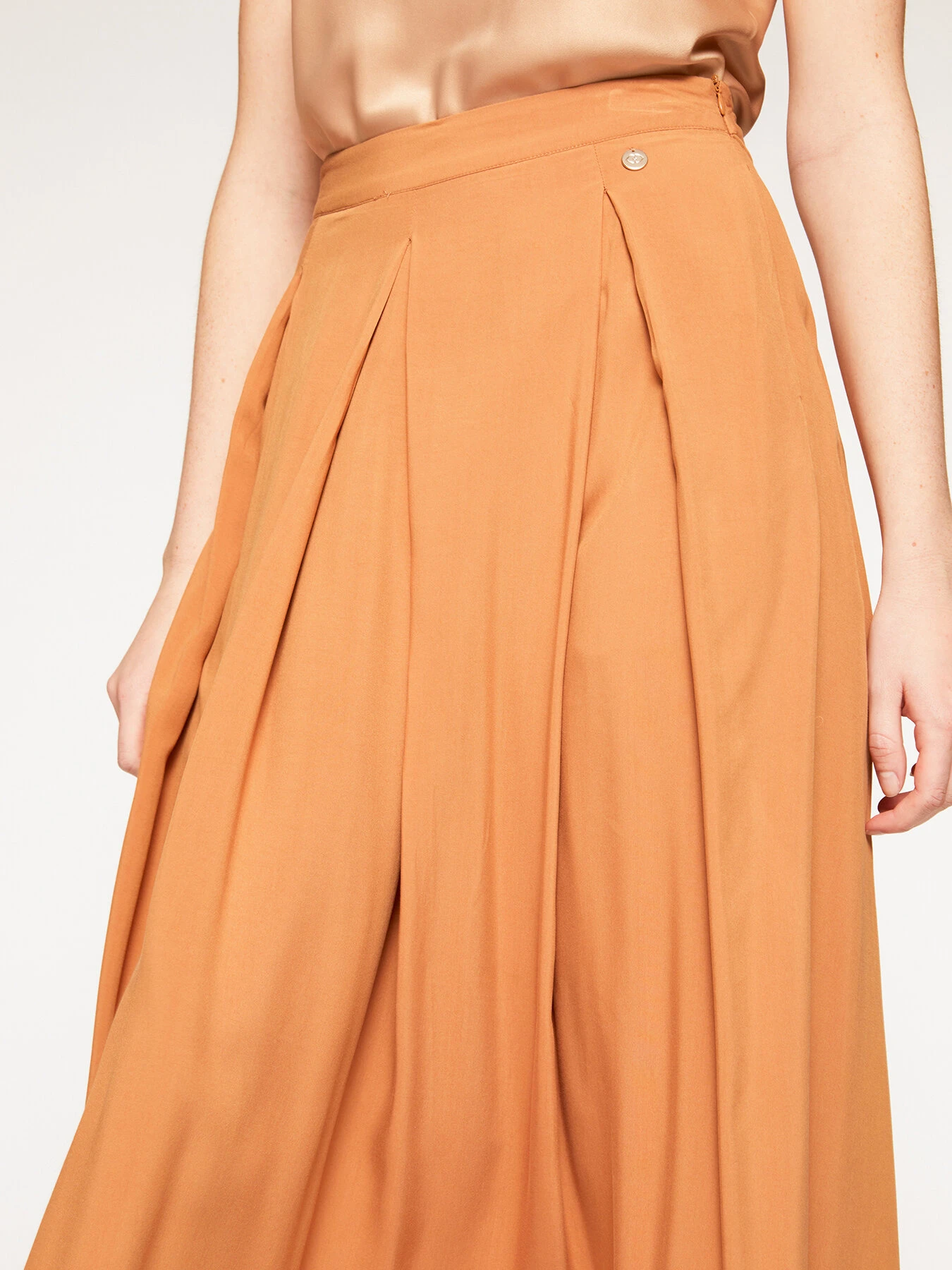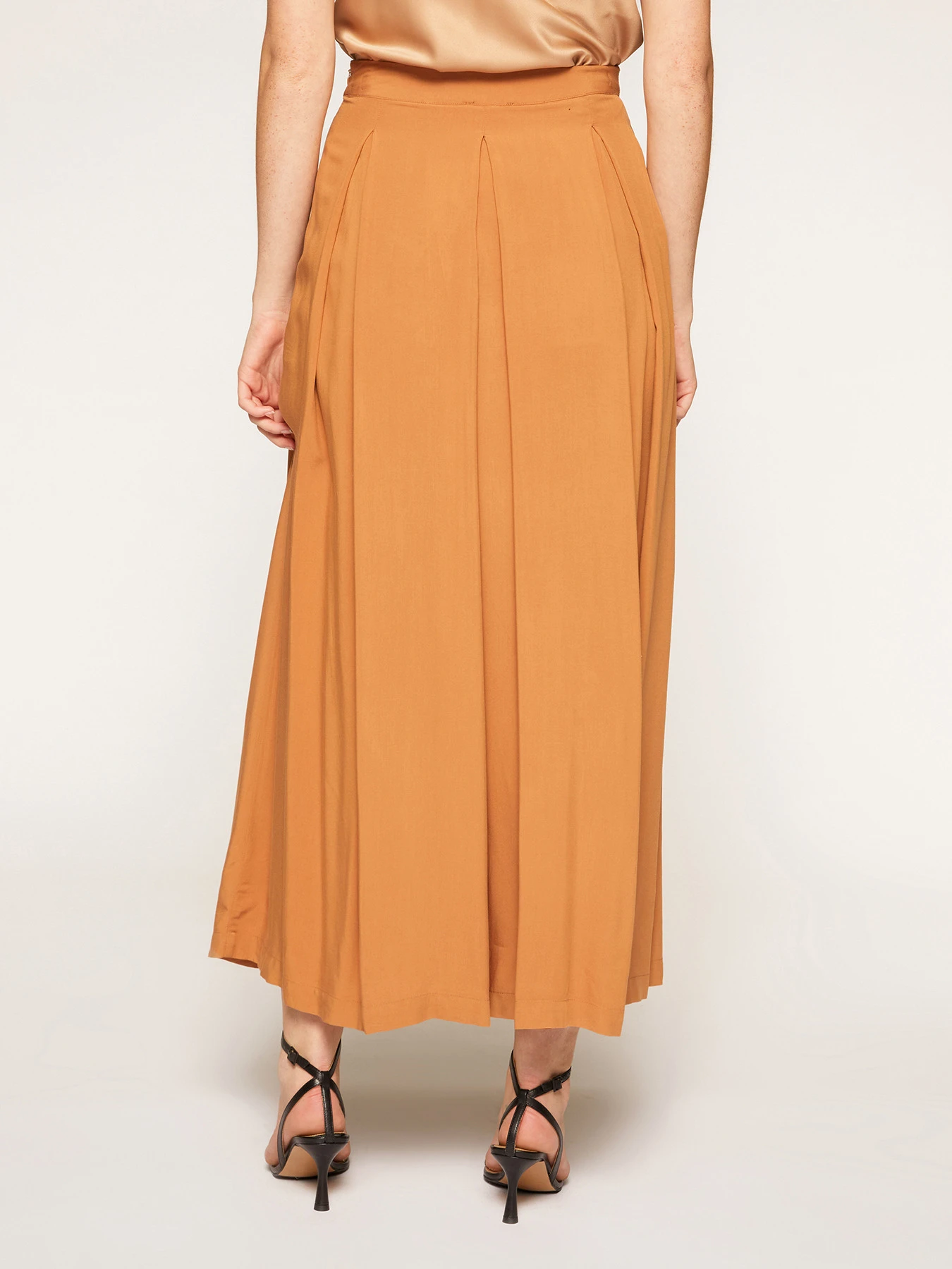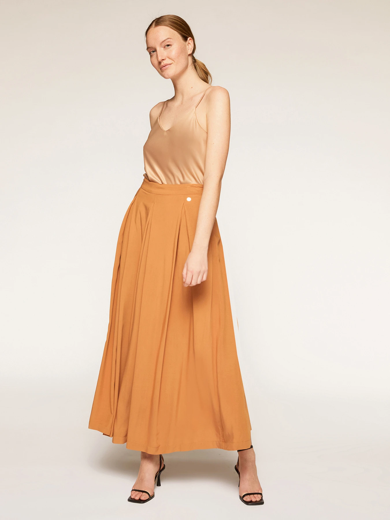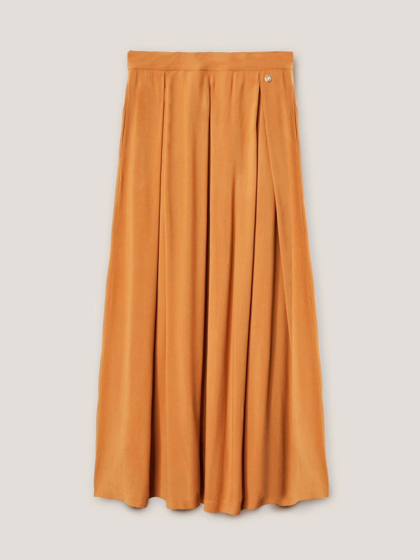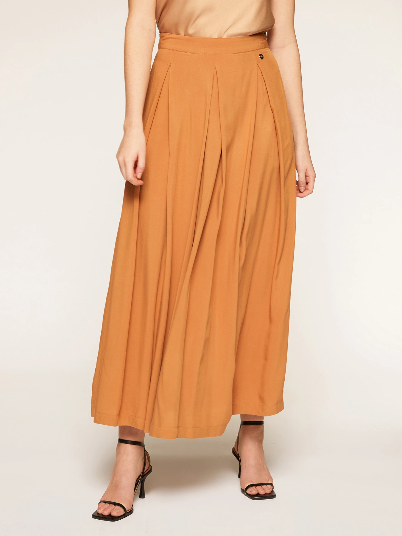 Gonna lunga in tessuto fluido 100% viscosa; pieghe a soffietto frontali; chiusura con zip sul fianco.