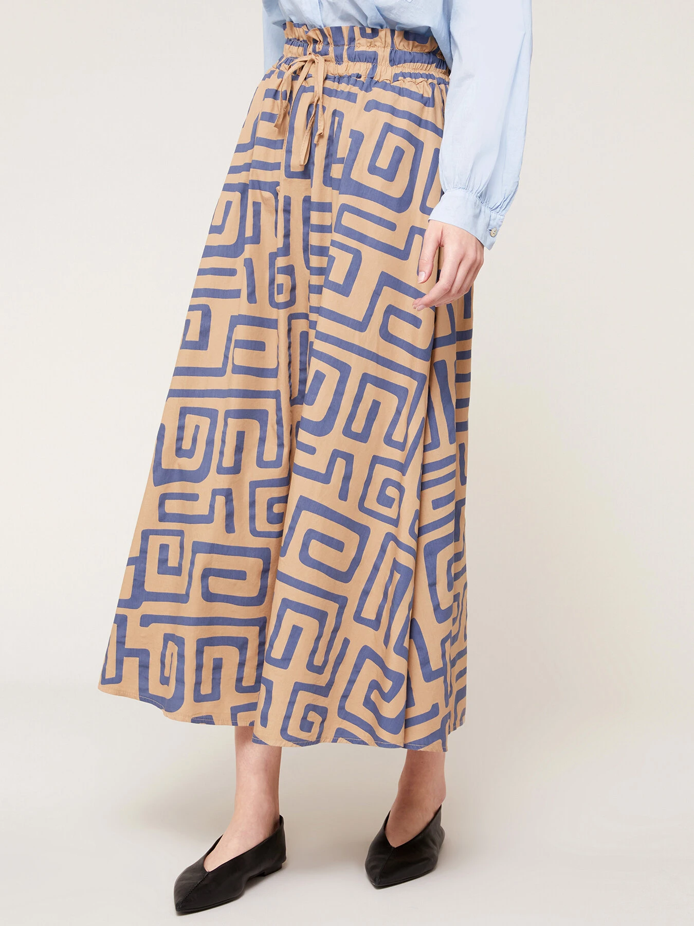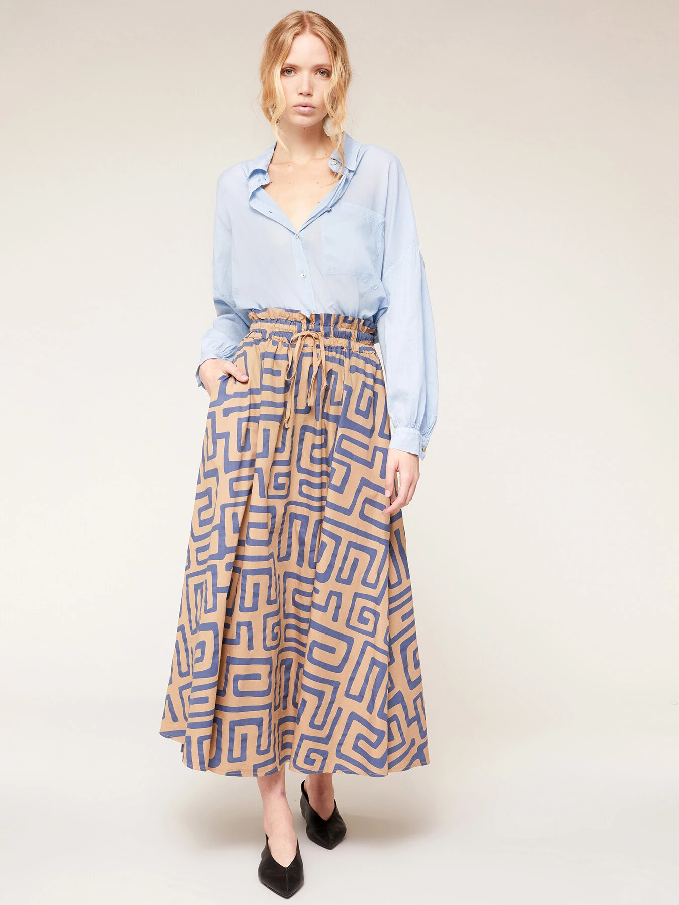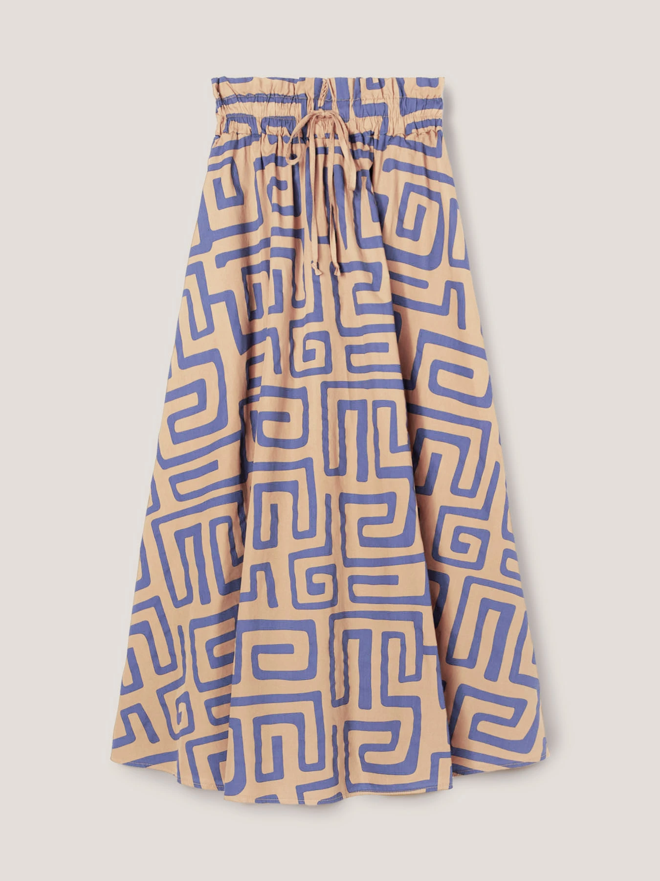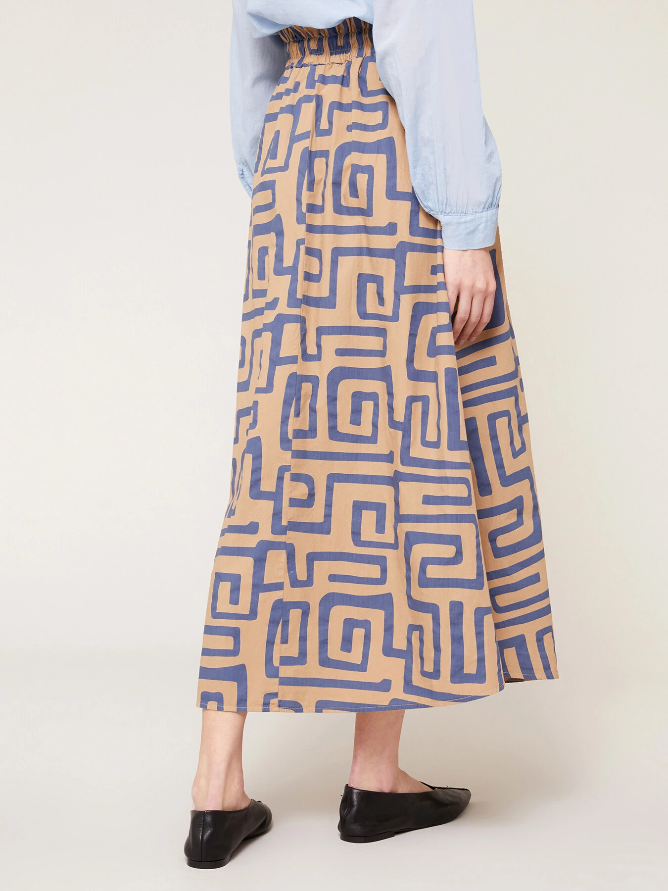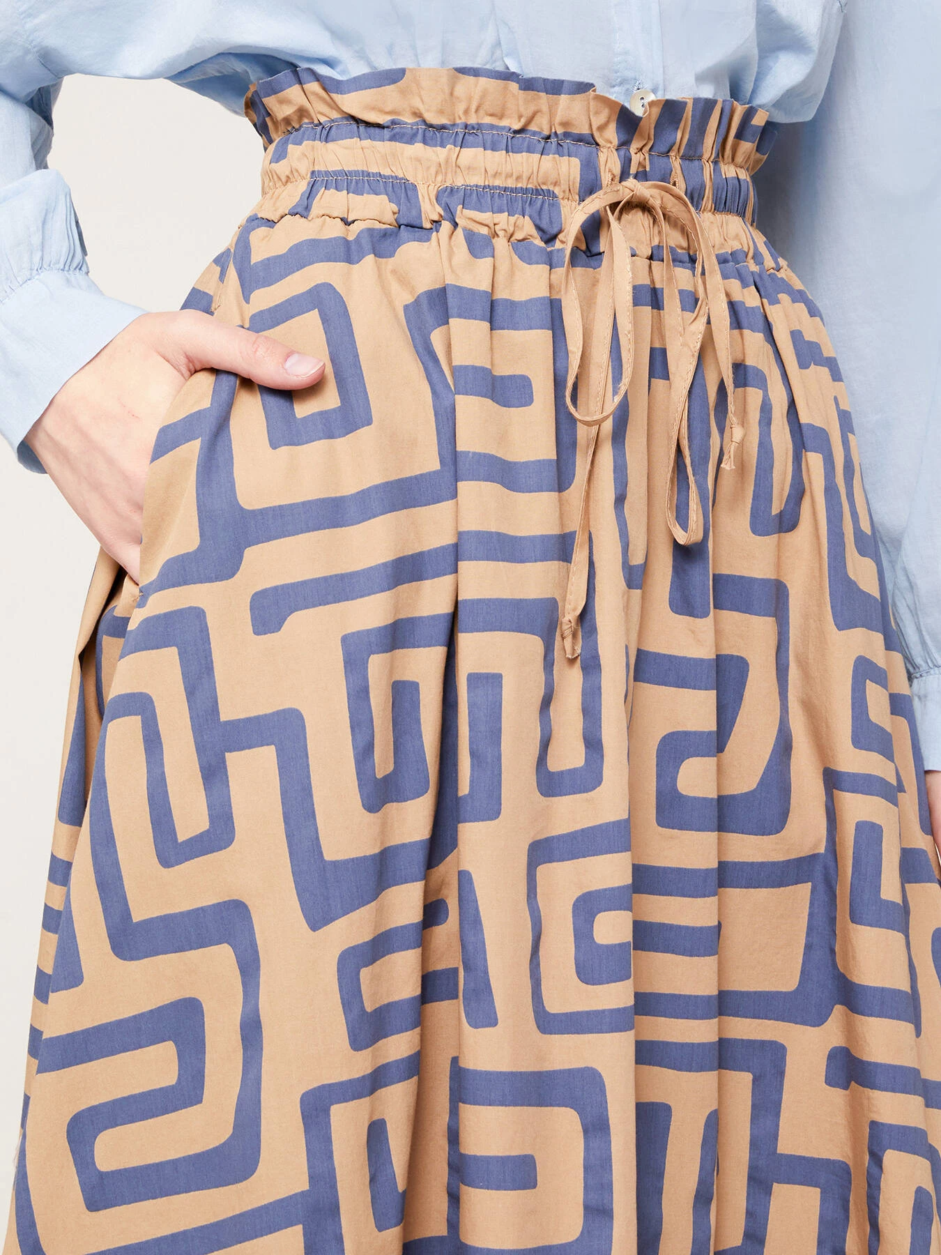 Gonna midi a ruota fantasia geometrica in popeline di cotone; vita alta con impunture elastiche e coulisse; tasche verticali inserite nel fianco.