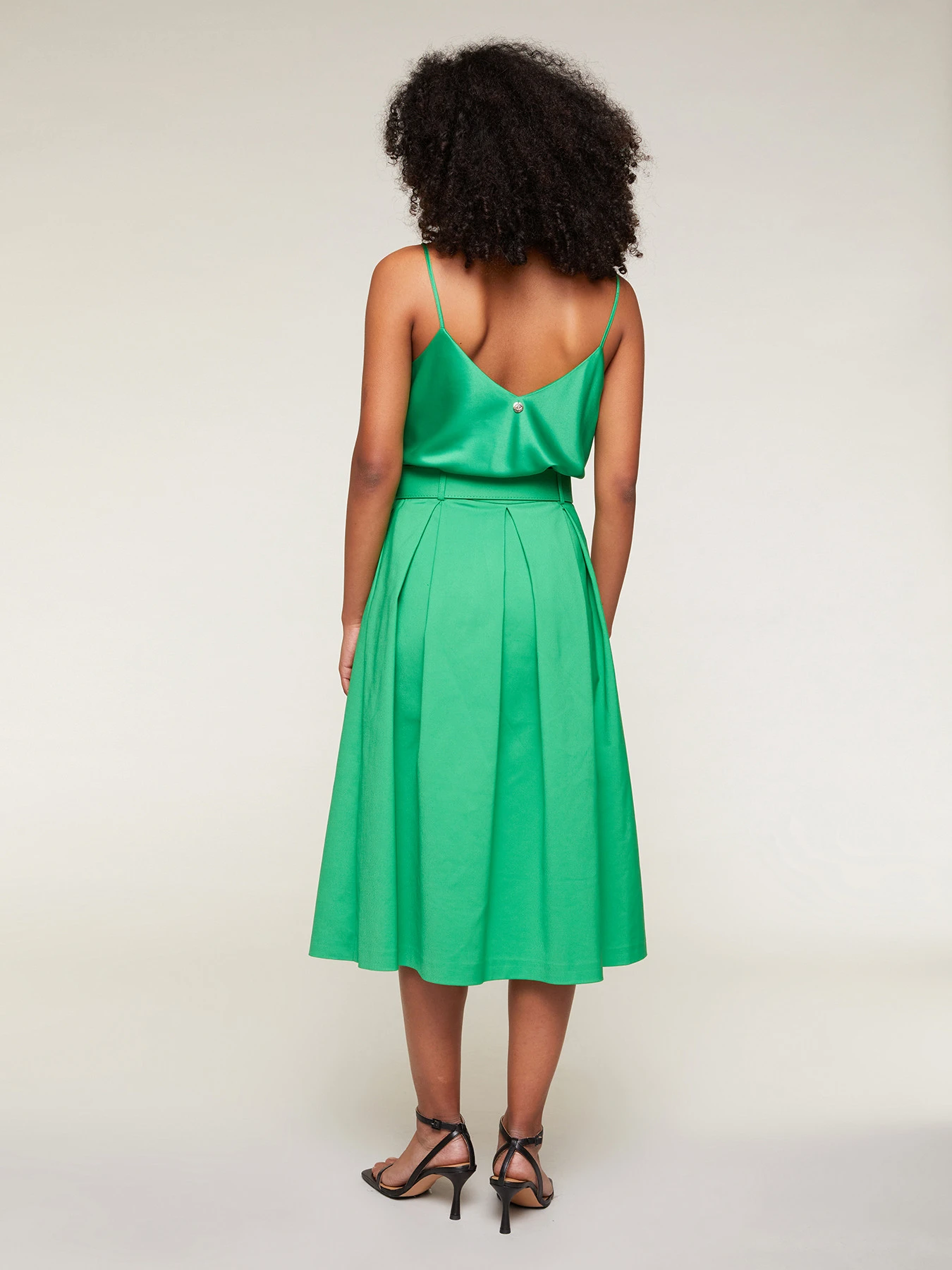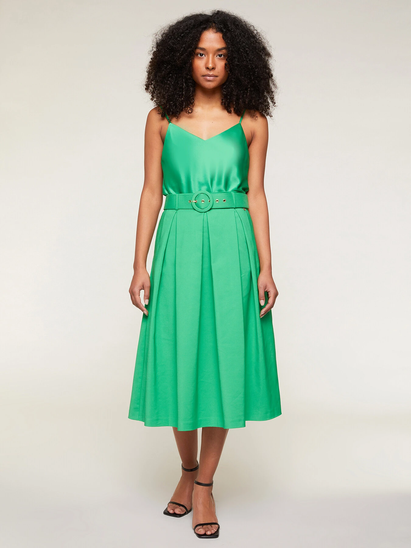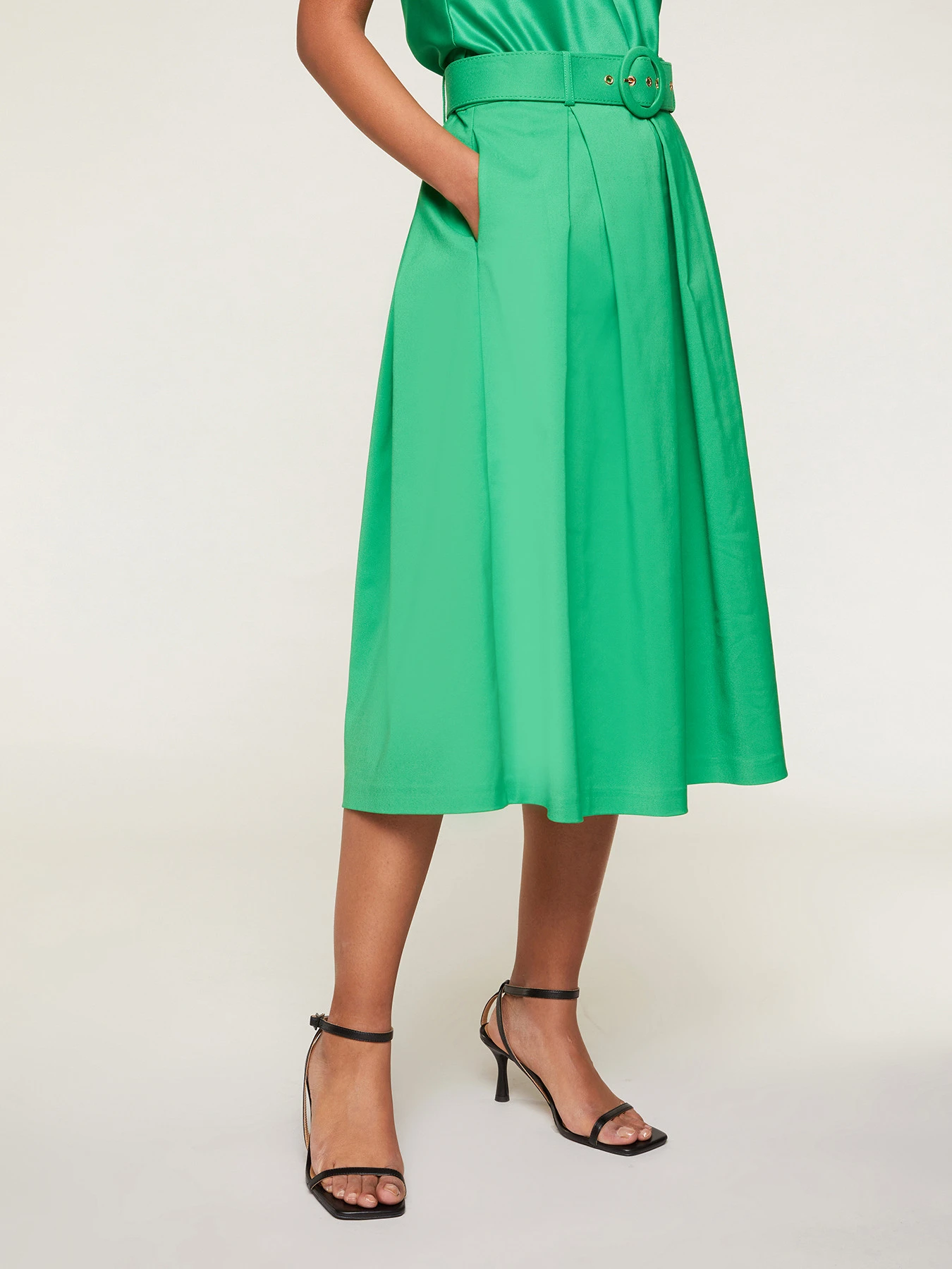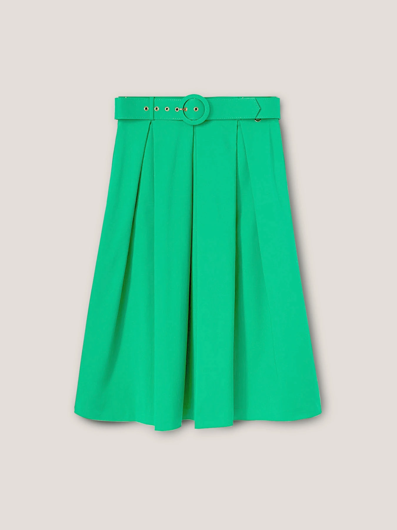 Gonna a pieghe in tessuto tecnico misto cotone; lunghezza midi; vita alta con cintura tono su tono, tasche laterali all’americana.