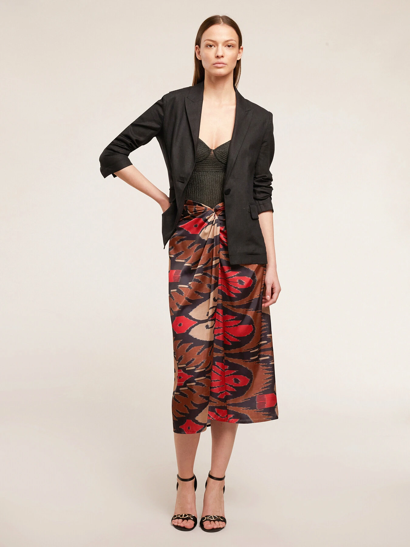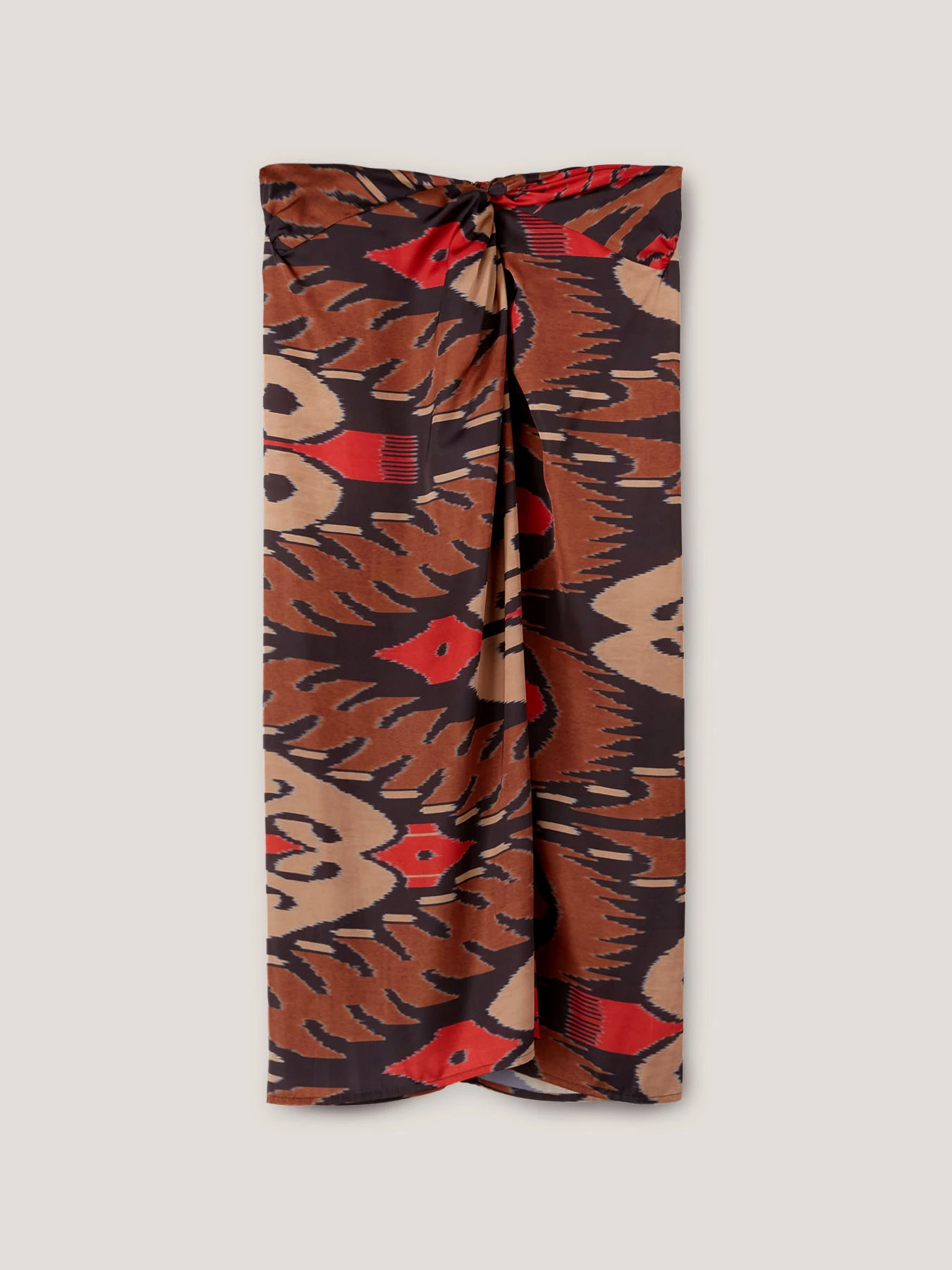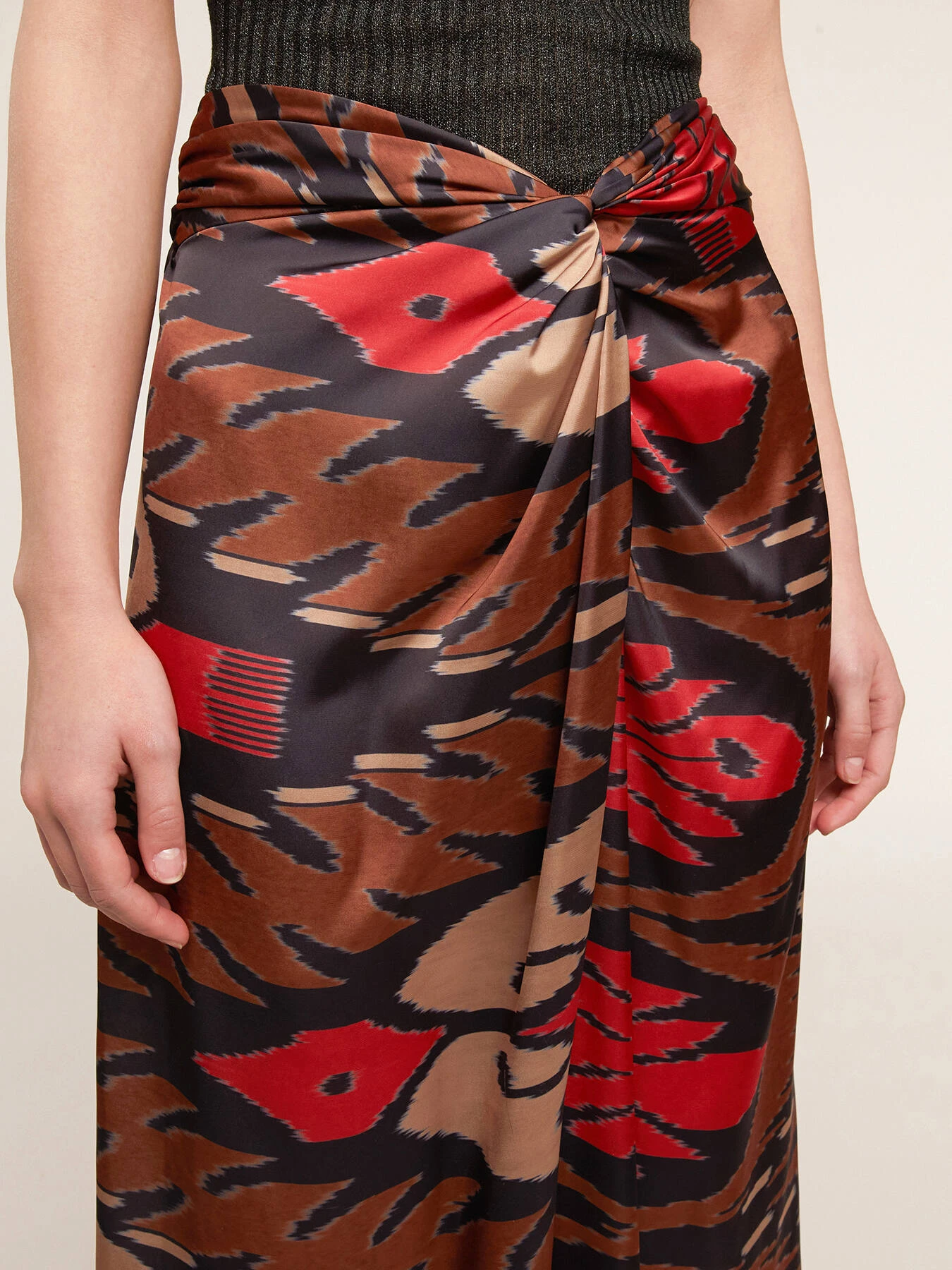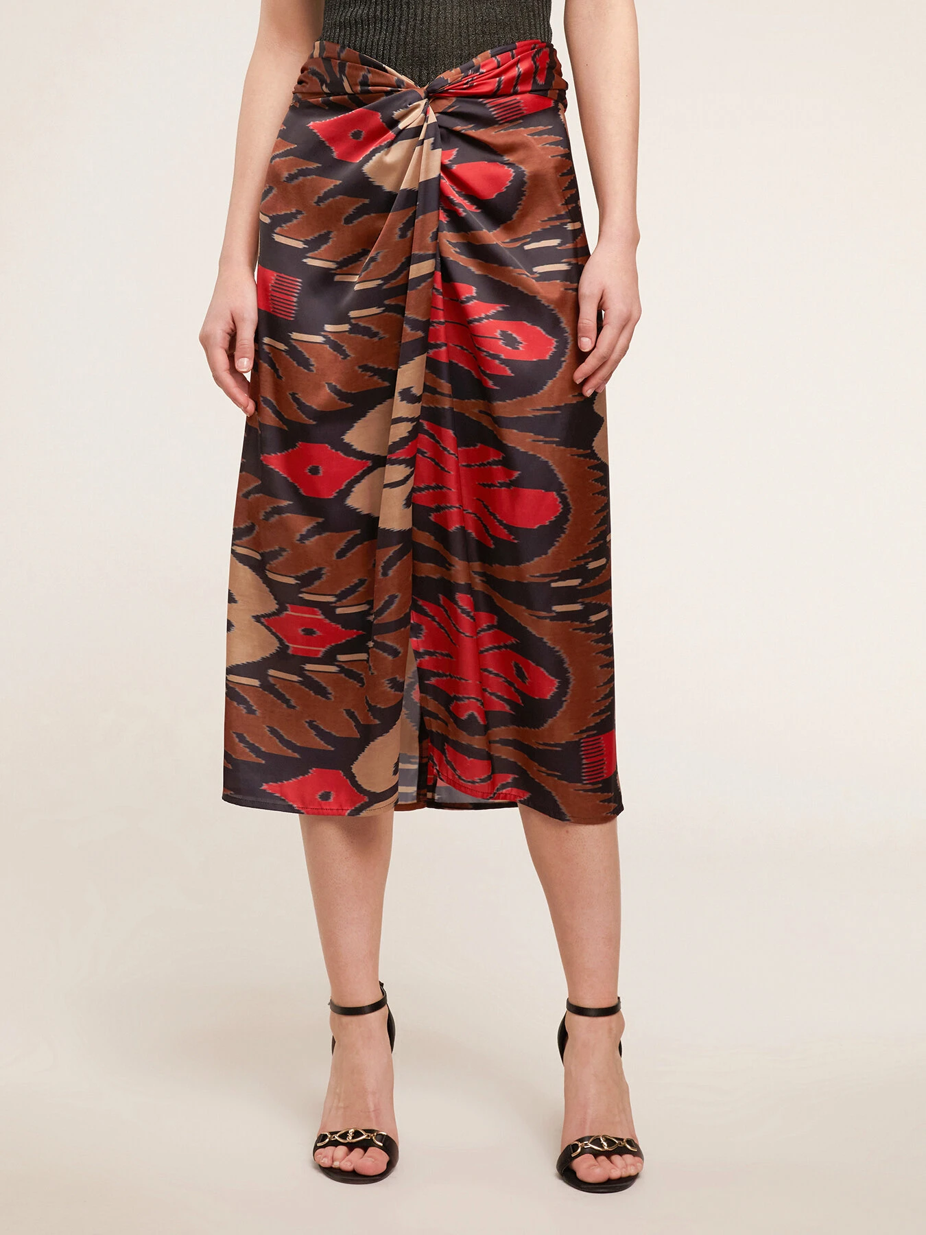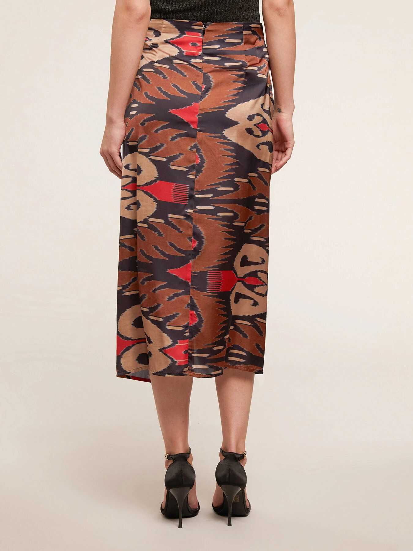 Gonna midi in raso fantasia etnica; motivo a torchon frontale; chiusura con zip invisibile nel centro dietro.