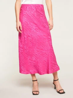Gonna midi in raso jacquard fantasia zebrata; vita stretch con elastico interno; spacco laterale sul fondo.
