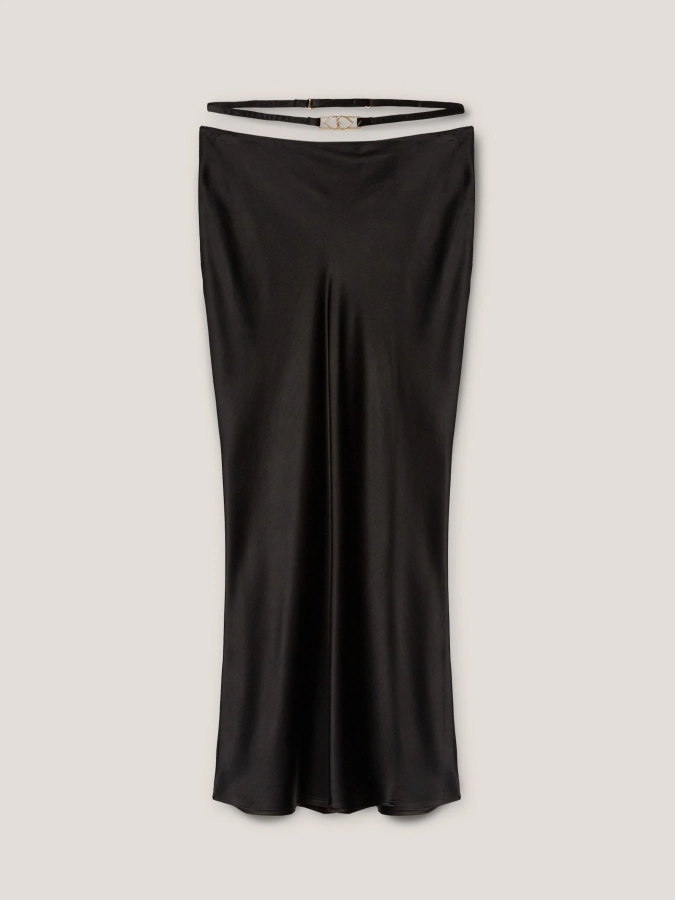 Gonna midi in raso tinta unita; chiusura laterale con zip invisibile; cinturino con placca in metallo Double Love; spacco sul fianco.