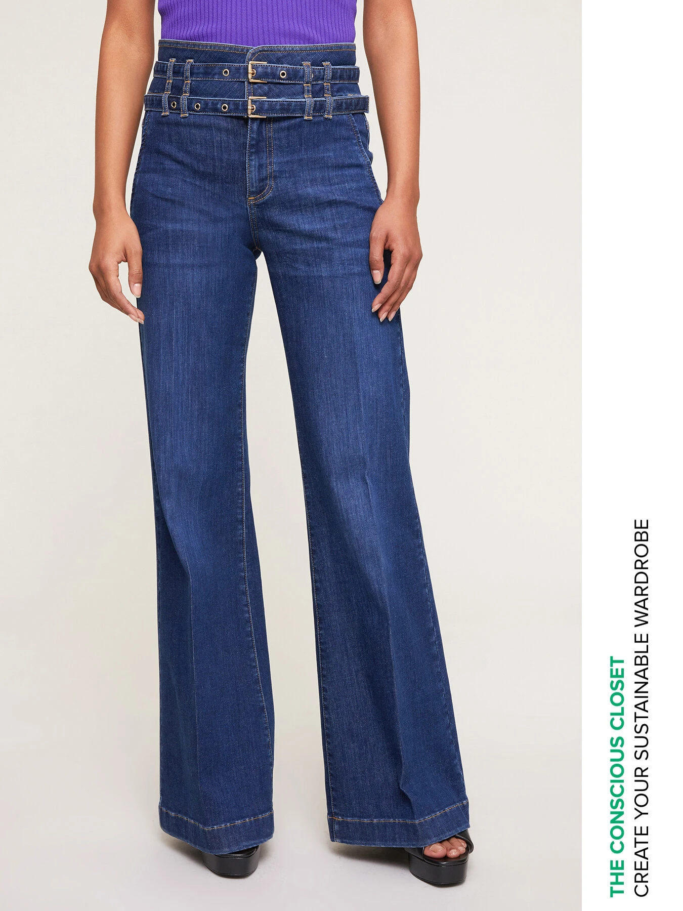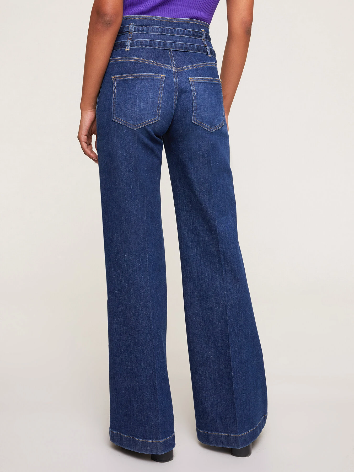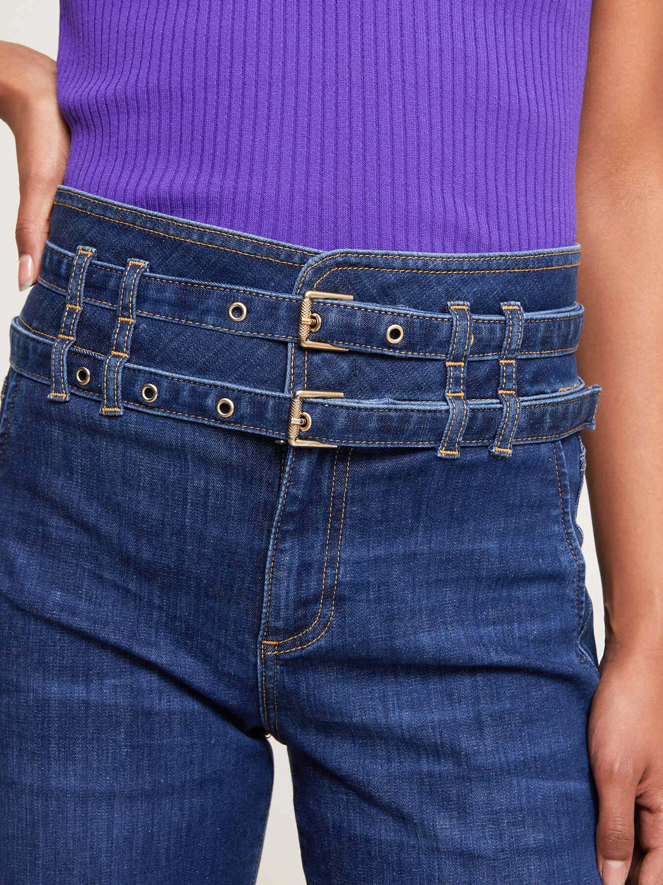 Jeans flare in denim di cotone medium blue wash; vita alta con motivo cinture tono su tono; piega stirata nel centro gamba.; Questo prodotto supporta il nostro contributo alla missione di Better Cotton promuovendo una produzione più responsabile del cotone; in più, grazie all’uso di avanzate tecnologie produttive, garantisce un risparmio di acqua fino al 60%.