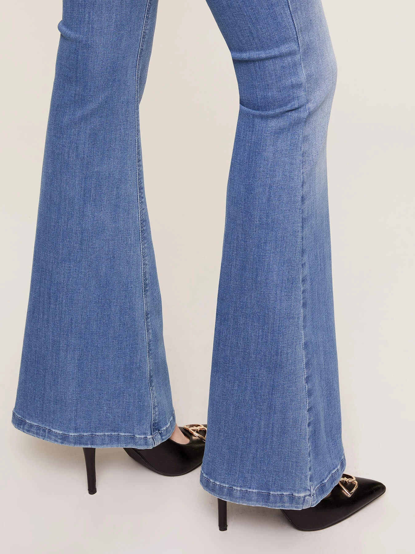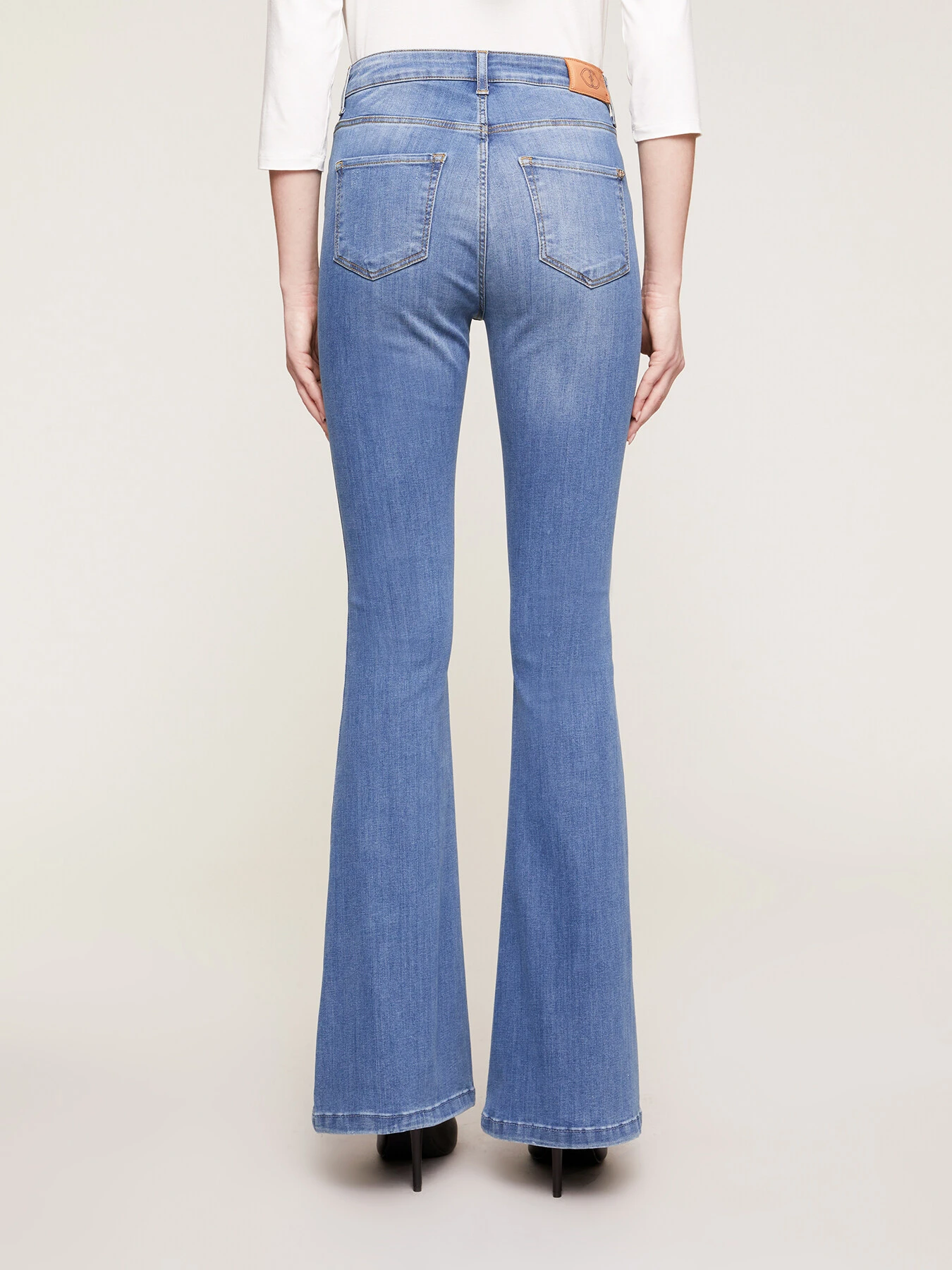 Jeans flare modello Elle in denim di cotone stretch; lavaggio blu chiaro con sabbiature; modello cinque tasche con accessori in metallo.; Questo prodotto supporta il nostro contributo alla missione di Better Cotton promuovendo una produzione più responsabile del cotone; in più, grazie all’uso di avanzate tecnologie produttive, garantisce un risparmio di acqua fino al 60%.