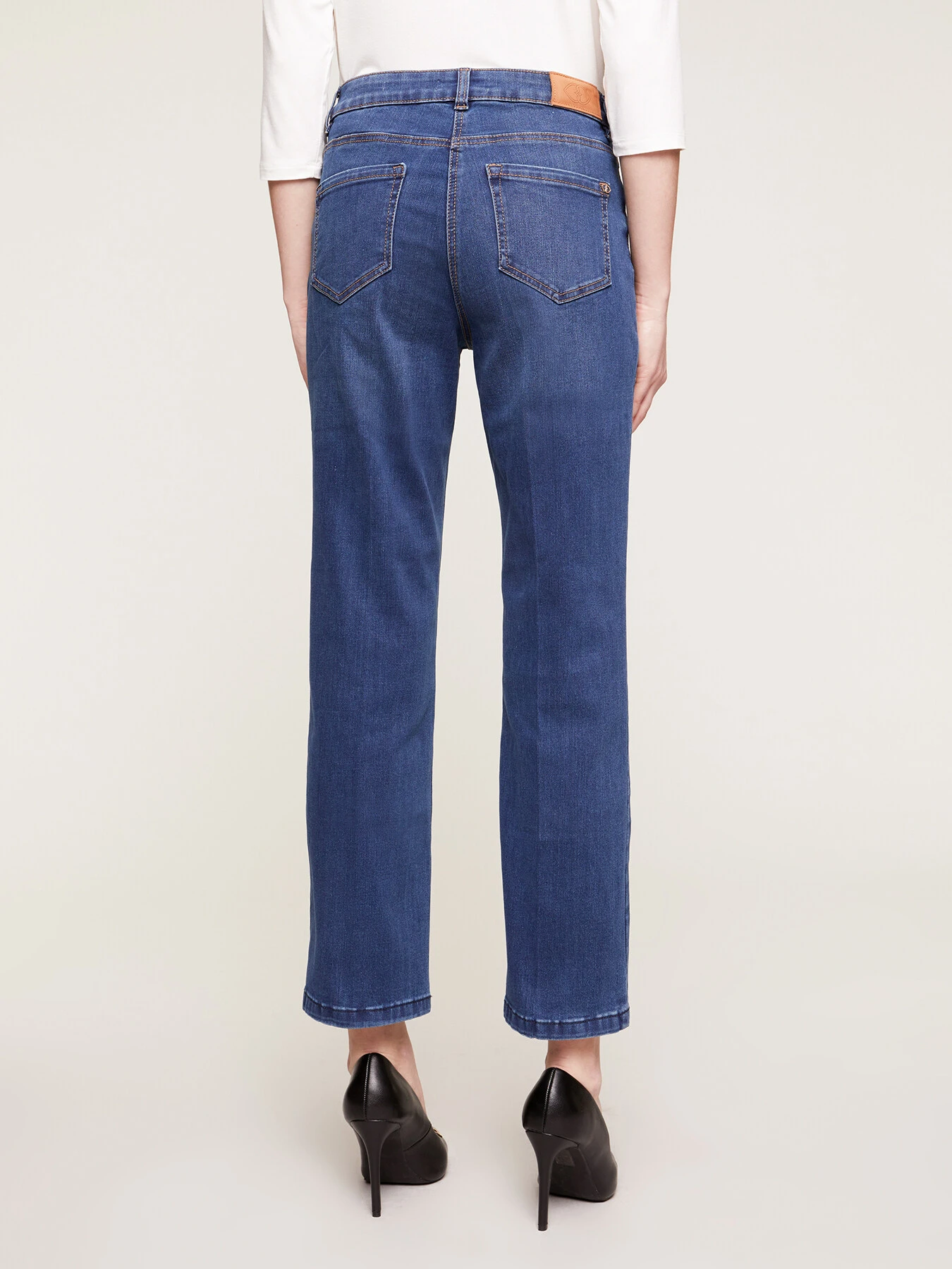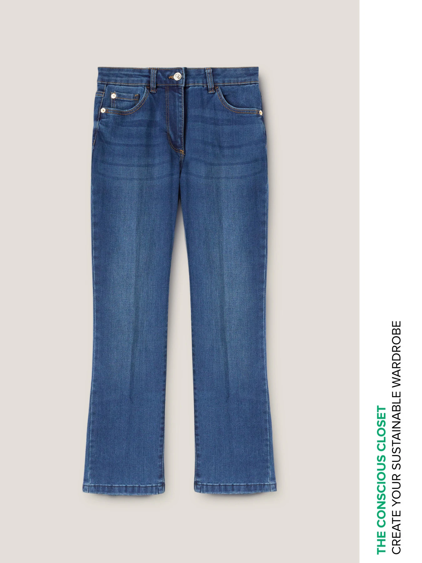 Jeans regular in tela misto cotone stretch; lavaggio mid blue; modello cinque tasche a vita alta con accessori in metallo.; Capo lavato con un processo sostenibile che grazie all’uso di avanzate tecnologie produttive, garantisce un risparmio di acqua fino al 60%.
