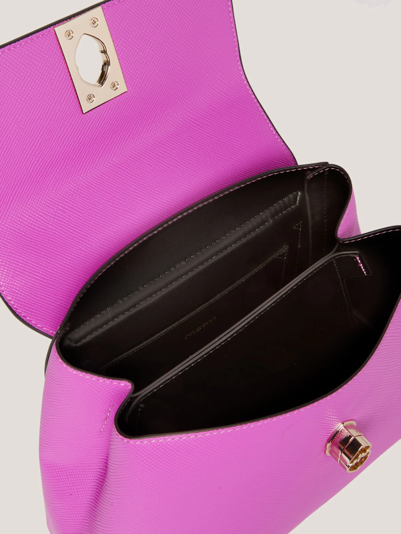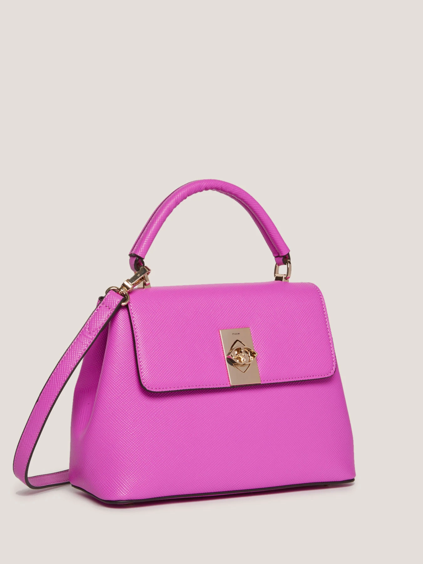 Just Bag in similpelle effetto saffiano; manico e tracolla regolabile tono su tono, chiusura con nottolino Double Love; doppio vano interno; dimensioni: altezza 19 cm, larghezza 25 cm, ampiezza 11 cm.