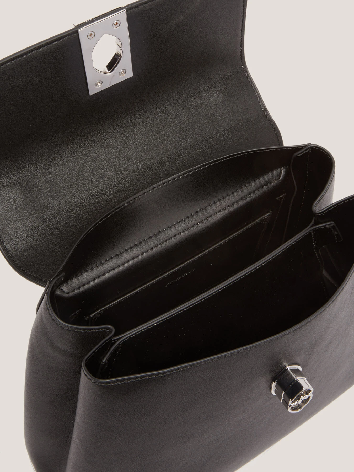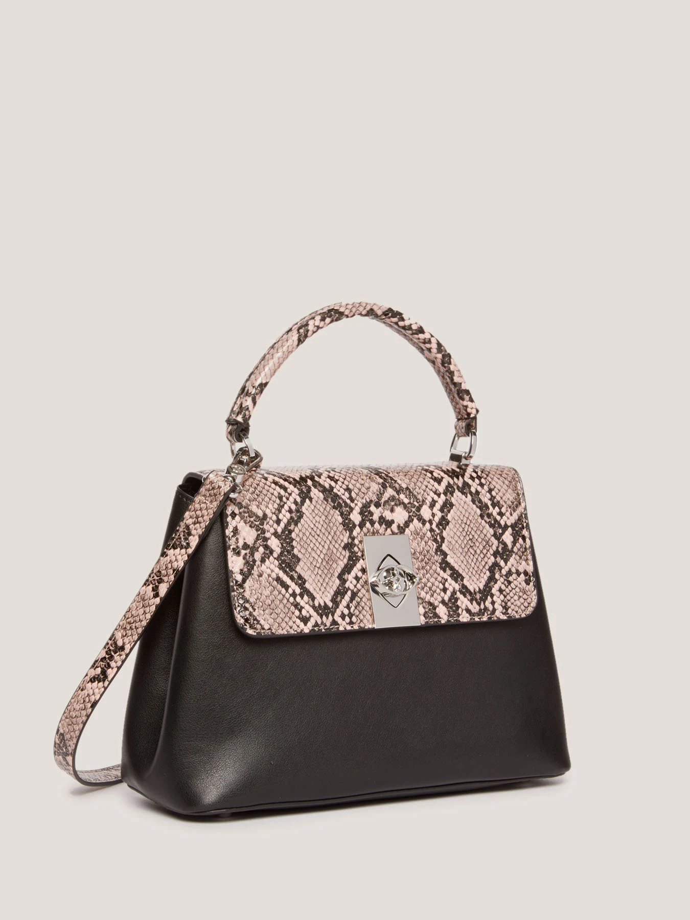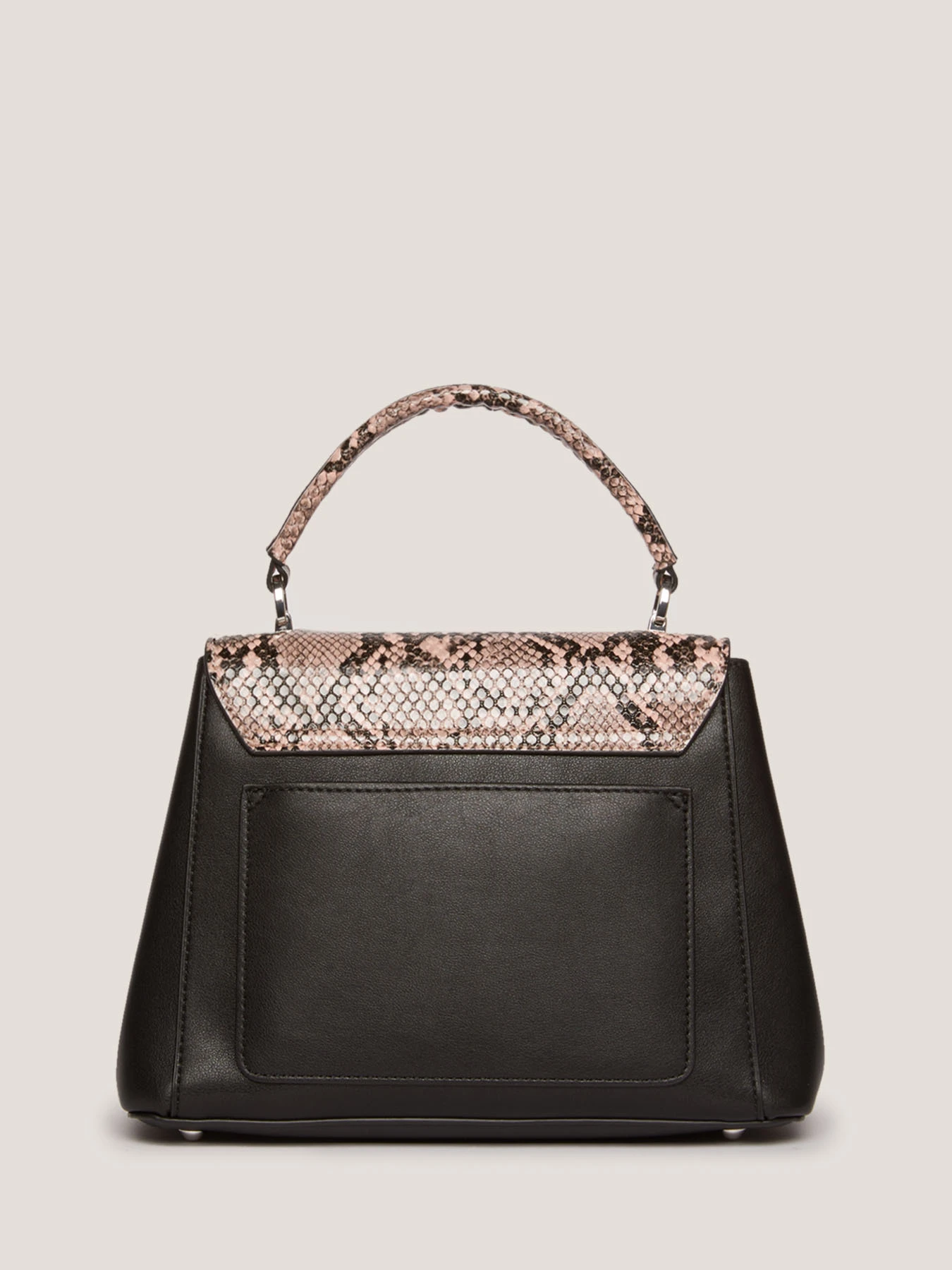 Just Bag in similpelle stampa pitone; manico e tracolla regolabile tono su tono, chiusura con nottolino Double Love; doppio vano interno; dimensioni: altezza 19 cm, larghezza 25 cm, ampiezza 11 cm.