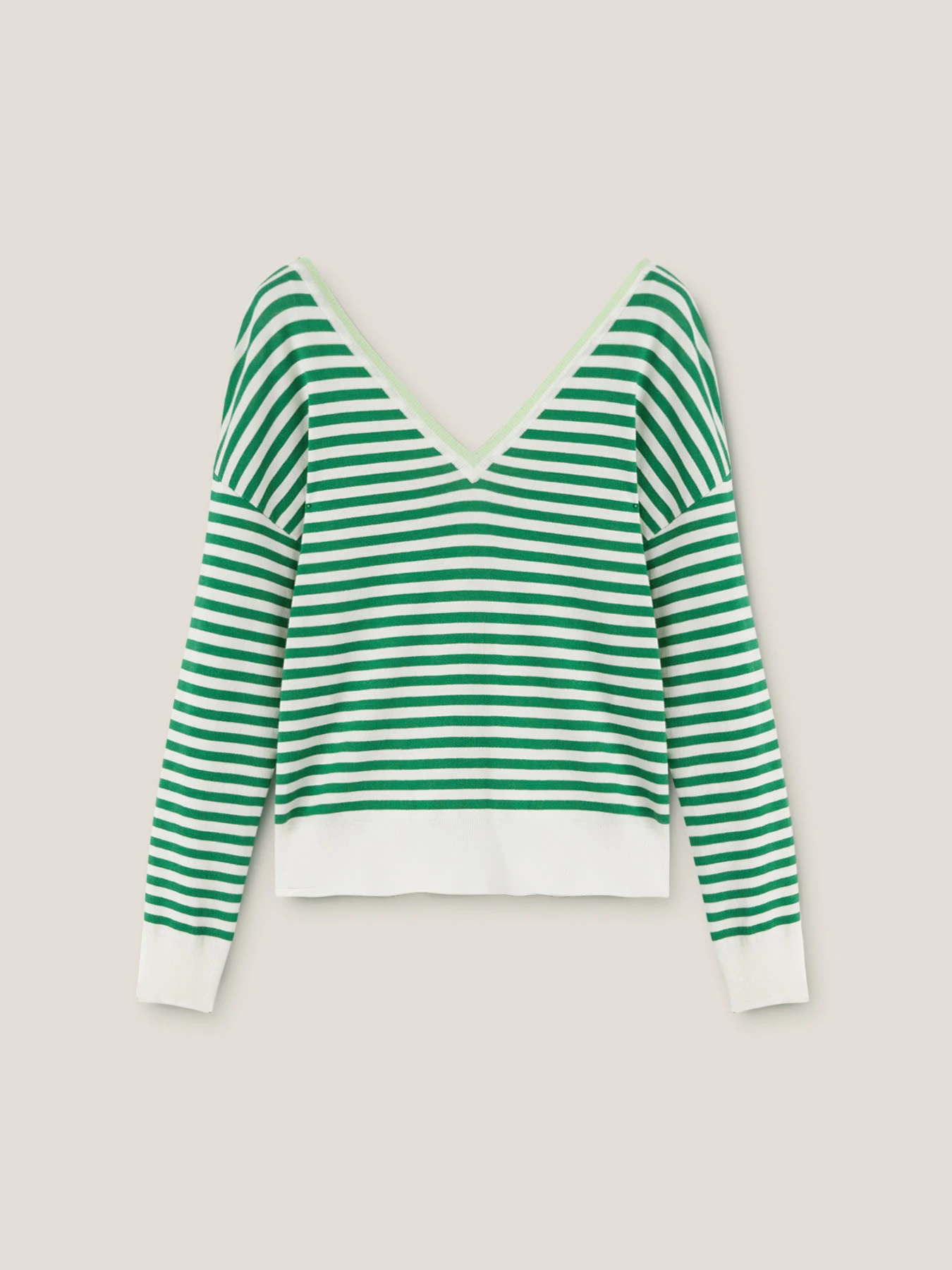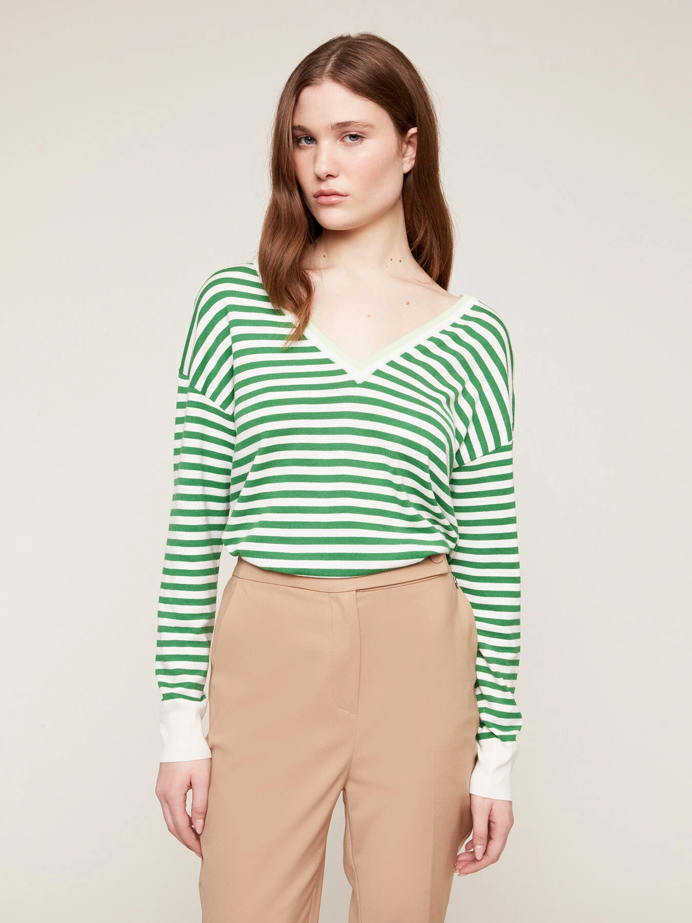 Maglia in filato misto viscosa fantasia a righe e bordi tinta unita; scollo a v, motivo abbottonatura posteriore con bottoni gioiello; maniche lunghe con taglio spalla sceso.