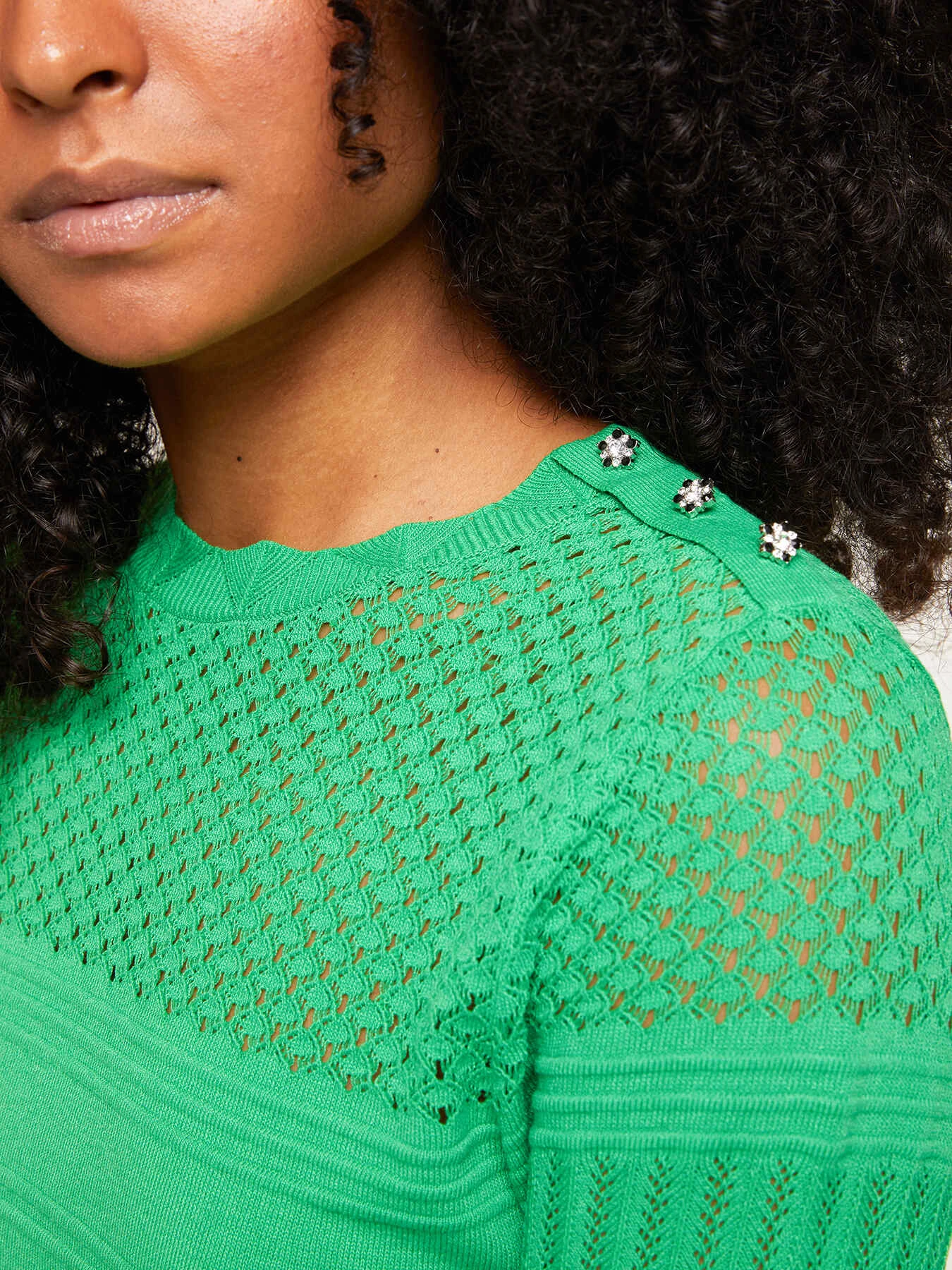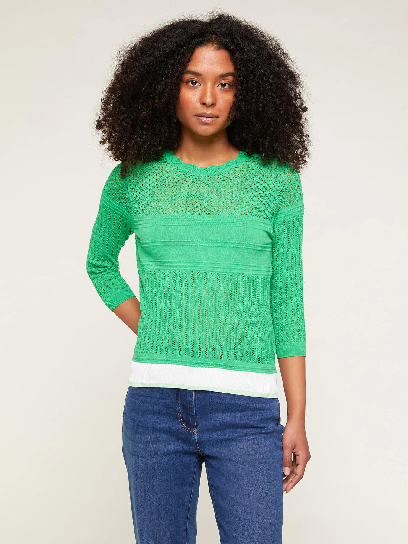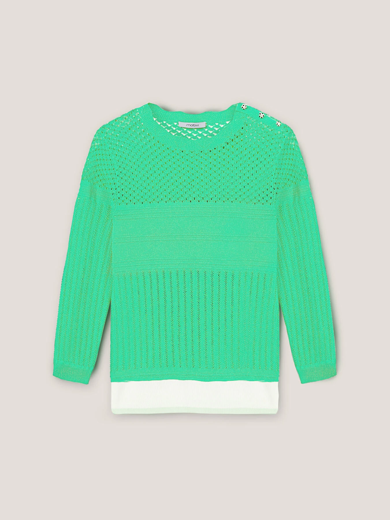 Maglia traforata in filato misto viscosa; scollo tondo, maniche lunghe; bordo al fondo in contrasto colore.