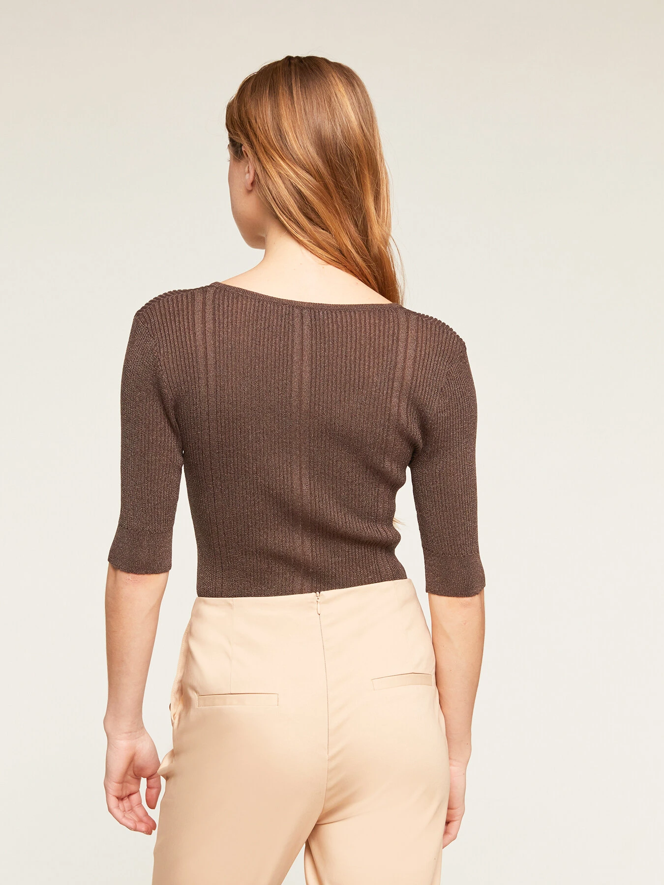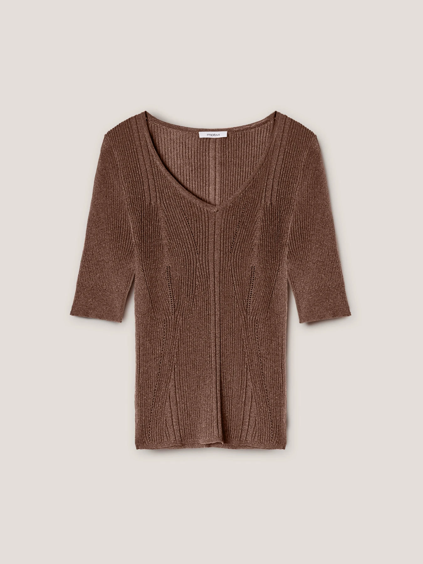 Maglia a coste in filato misto viscosa lurex; scollo frontale a v; maniche corte, vestibilità slim.