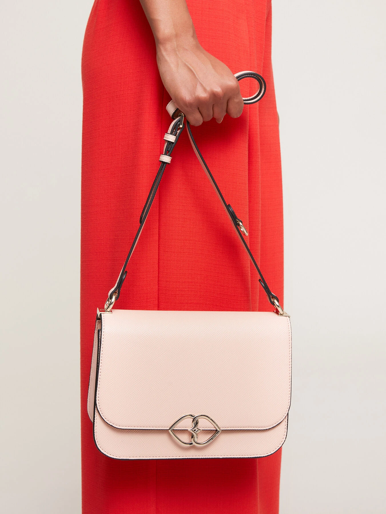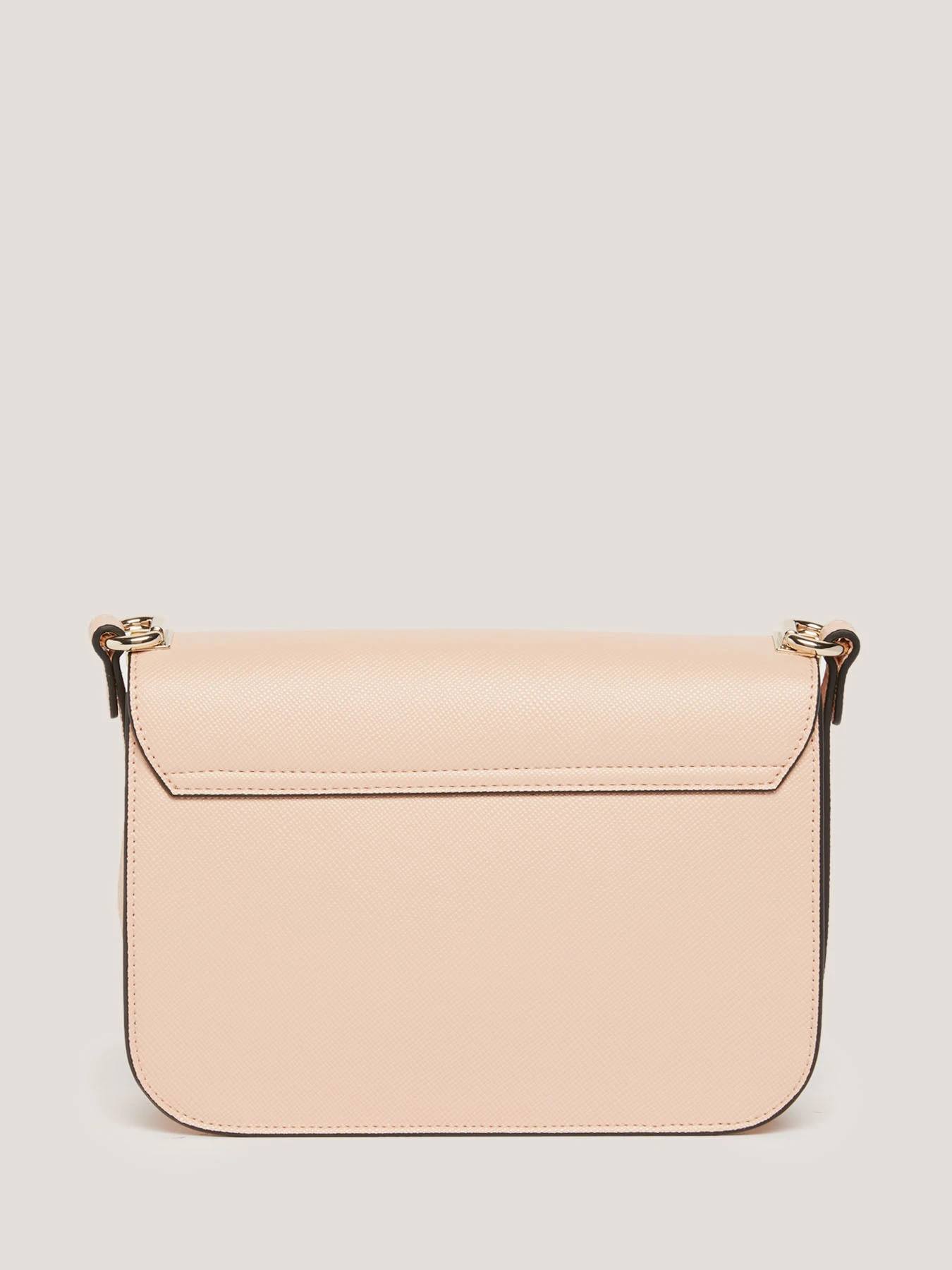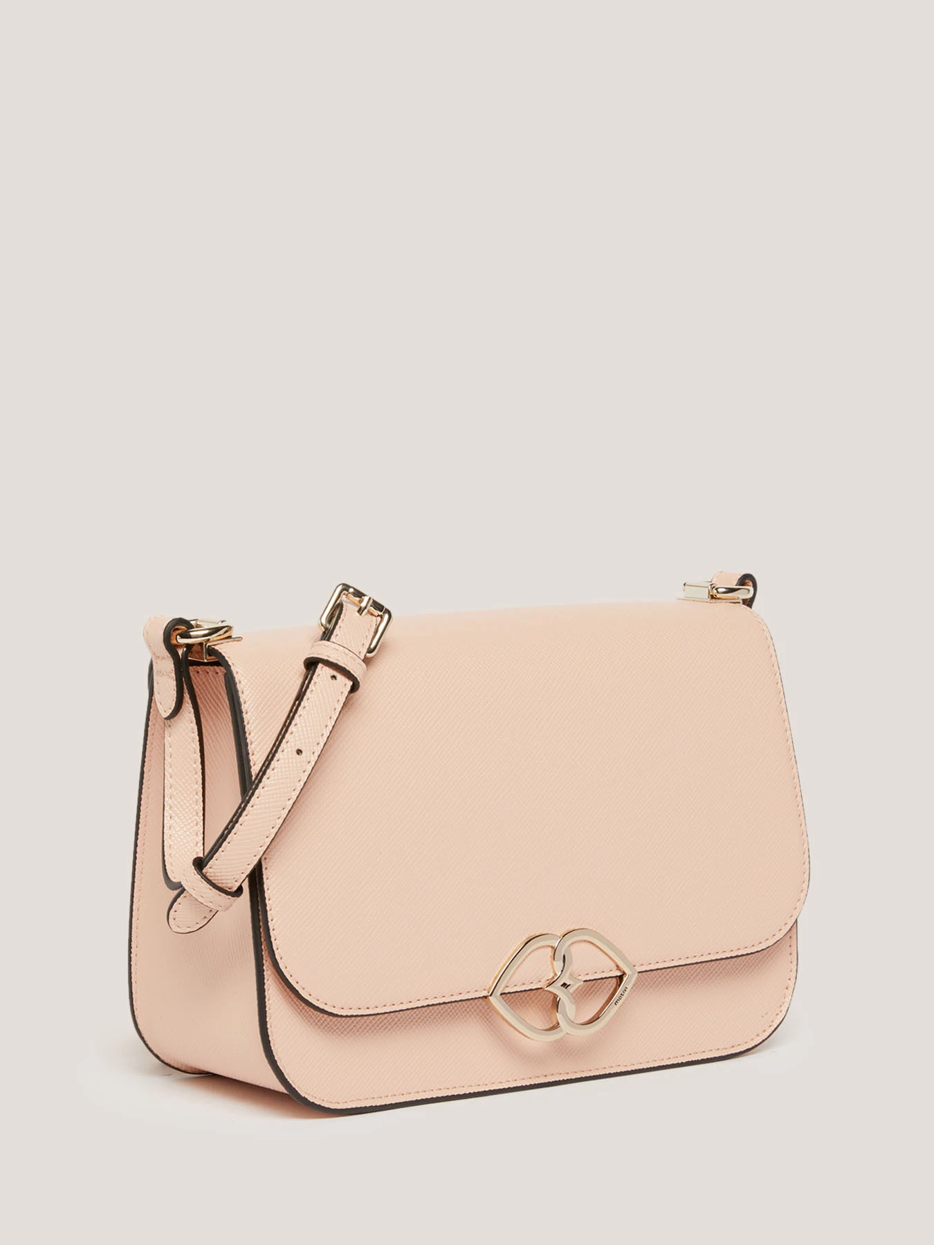 Maxi Daily Bag in similpelle effetto saffiano; tracolla regolabile tono su tono, chiusura con patta e placca metallica Double Love, tasca interna; dimensioni: altezza 16 cm, larghezza 24 cm, ampiezza 9 cm.