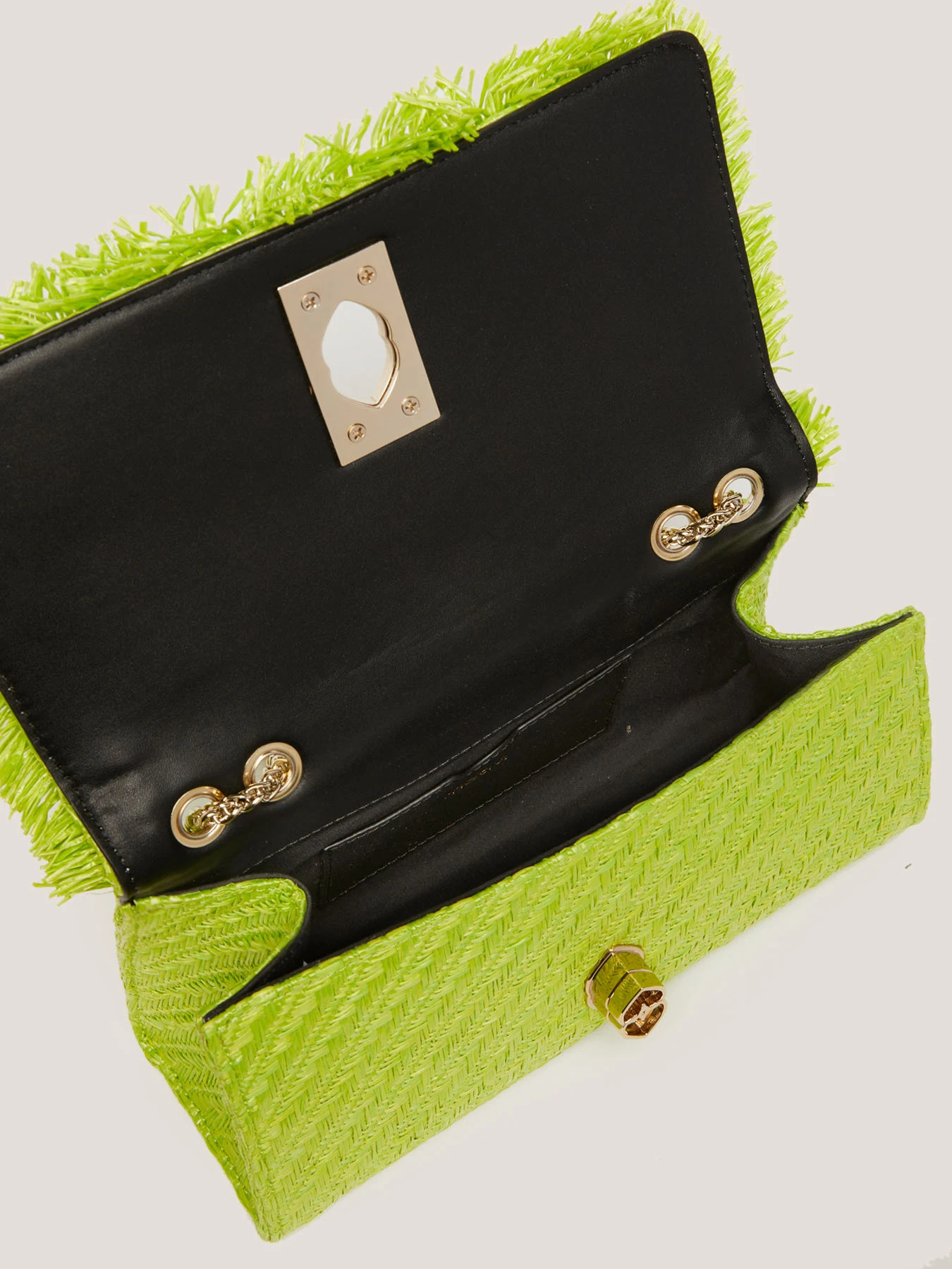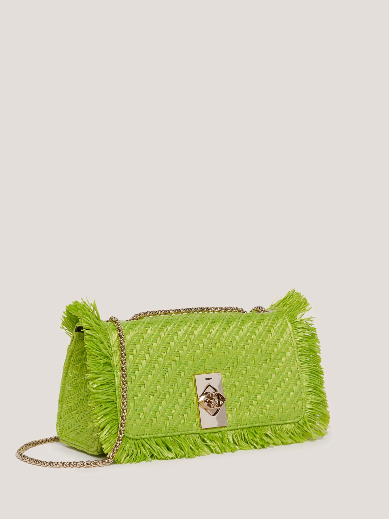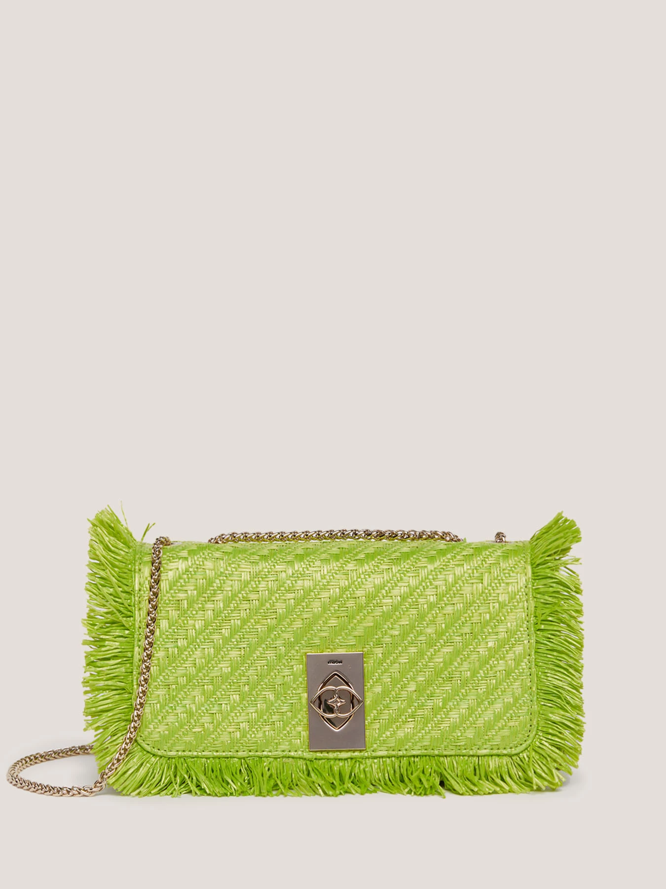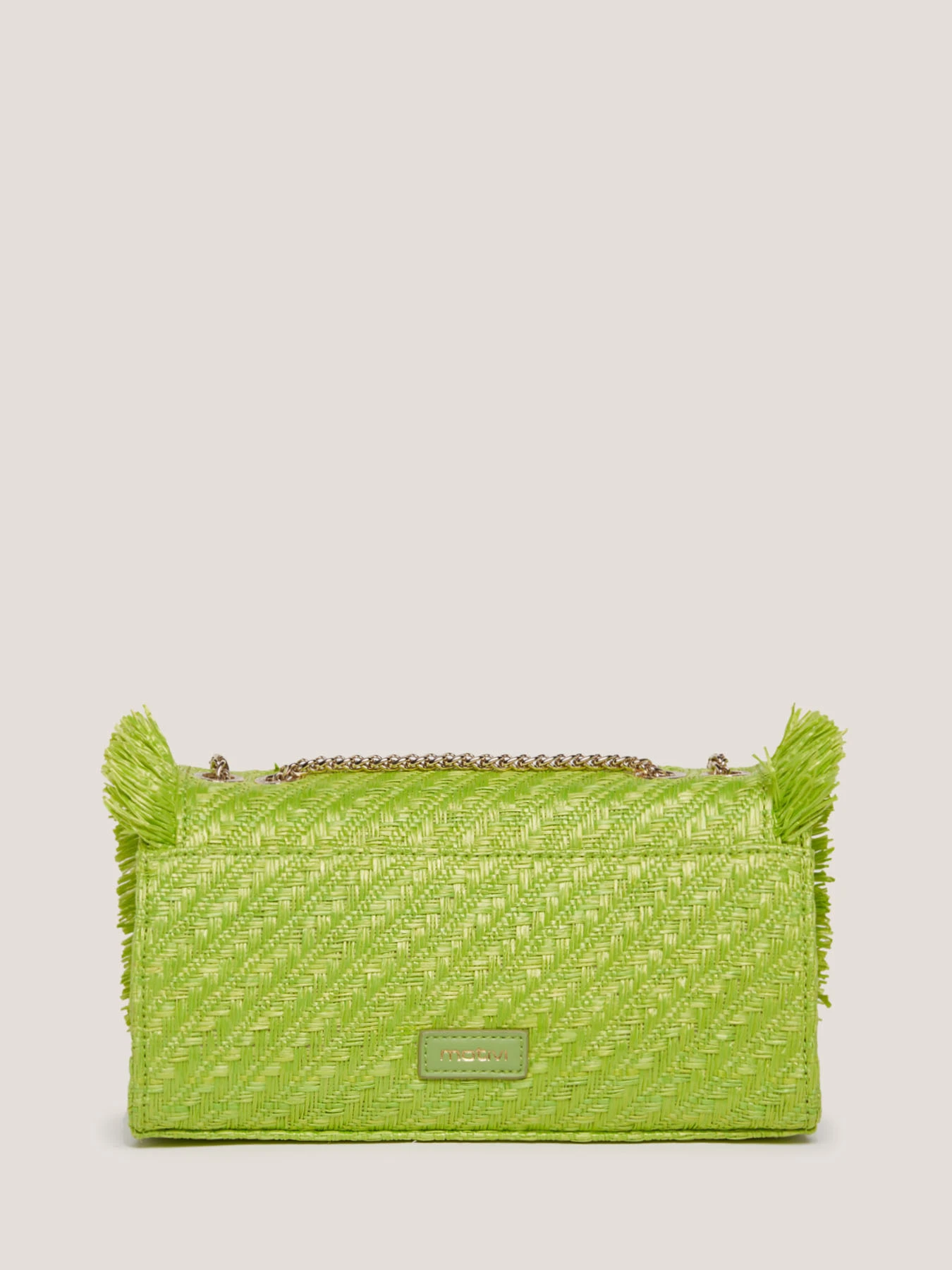 Miami Bag in rafia; tracolla in catena metallica, chiusura con nottolino Double Love, tasca interna; dimensioni: altezza 14 cm, larghezza 24 cm, ampiezza 6 cm.