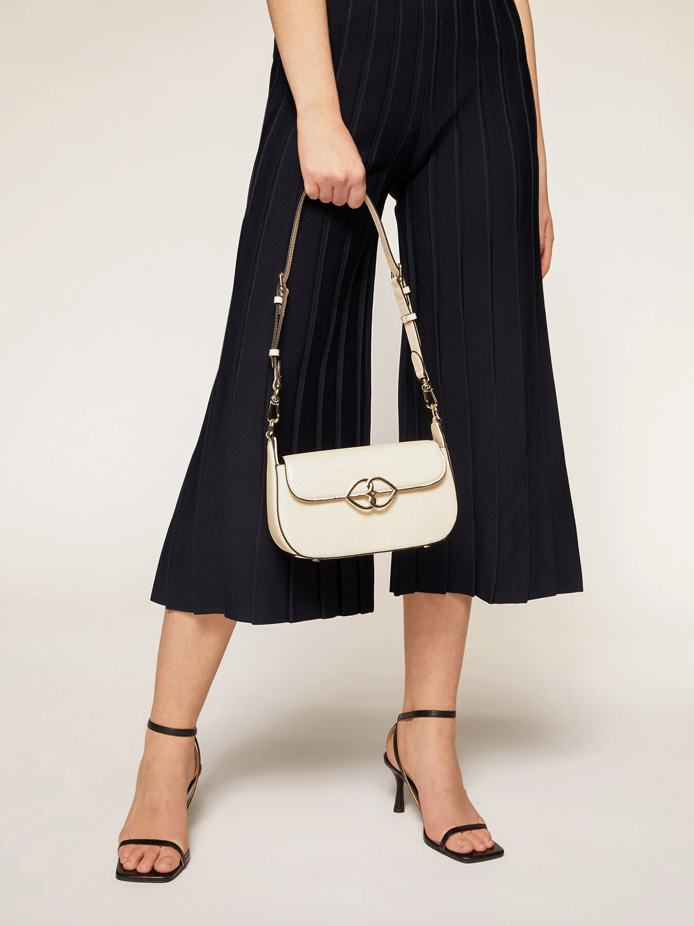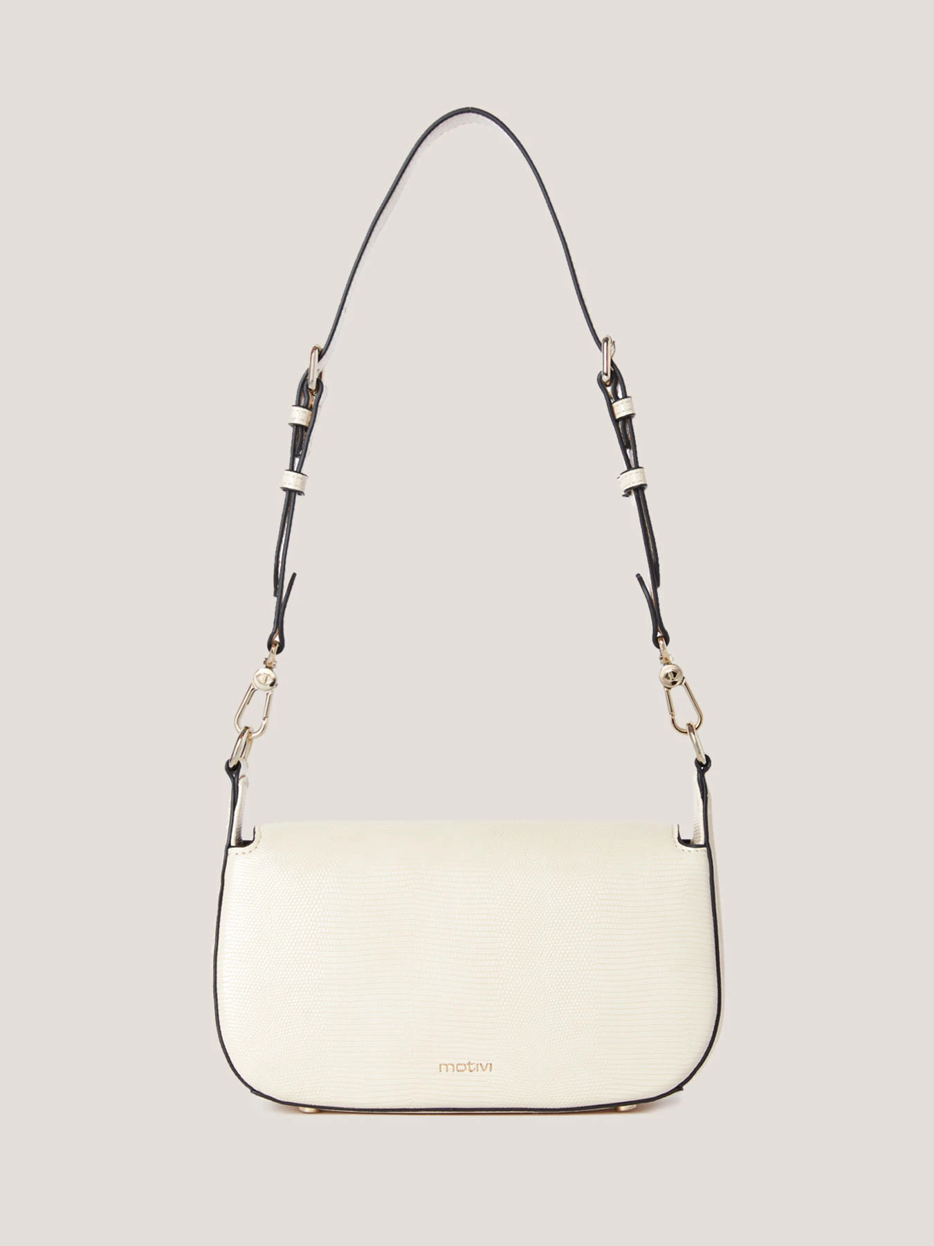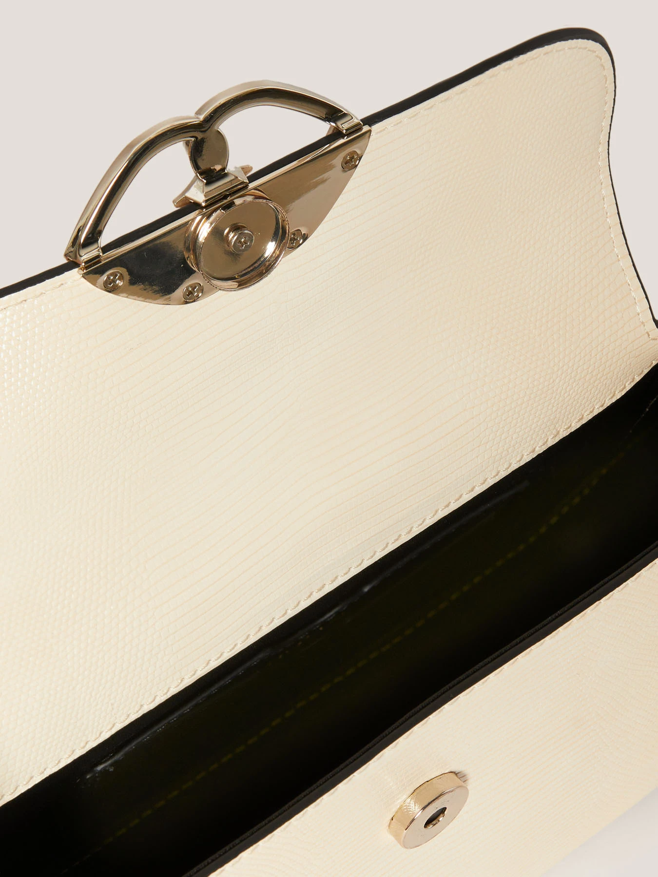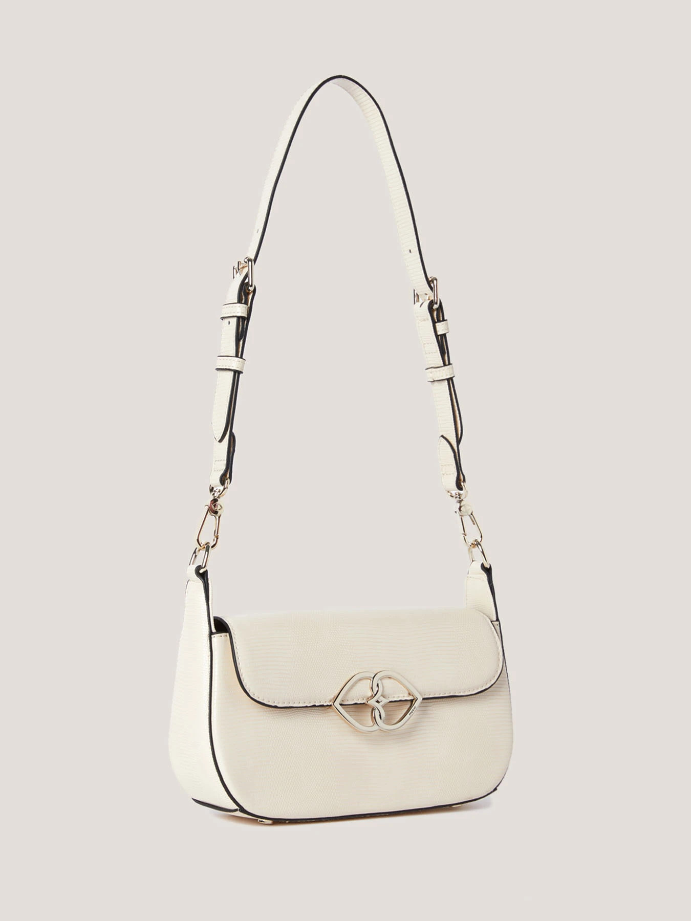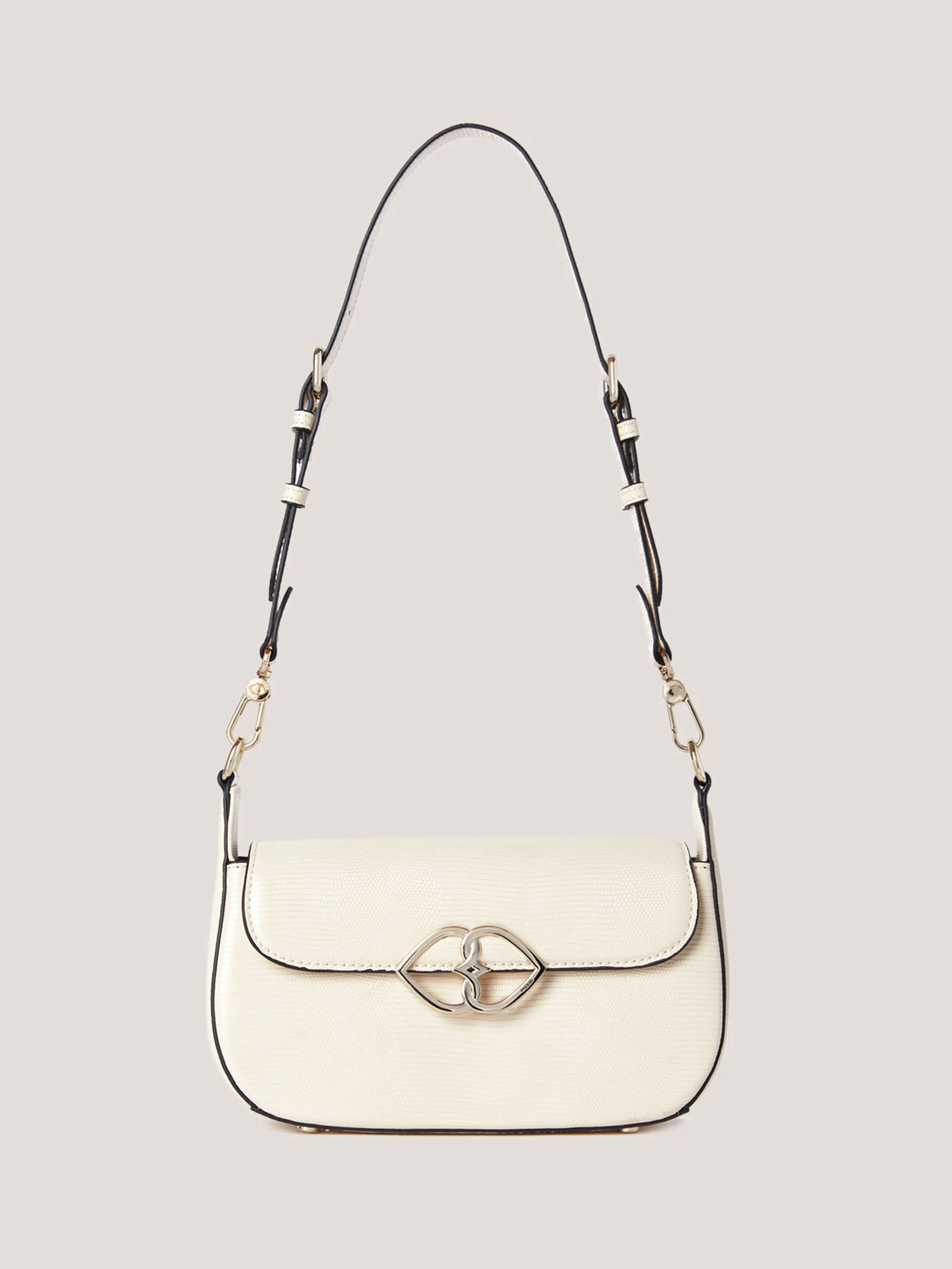 Mini Arizona in similpelle stampa rettile; manico tono su tono, chiusura con patta e placca metallica Double Love, vano interno; dimensioni: altezza 12 cm, larghezza 22,5 cm, ampiezza 6,5 cm.