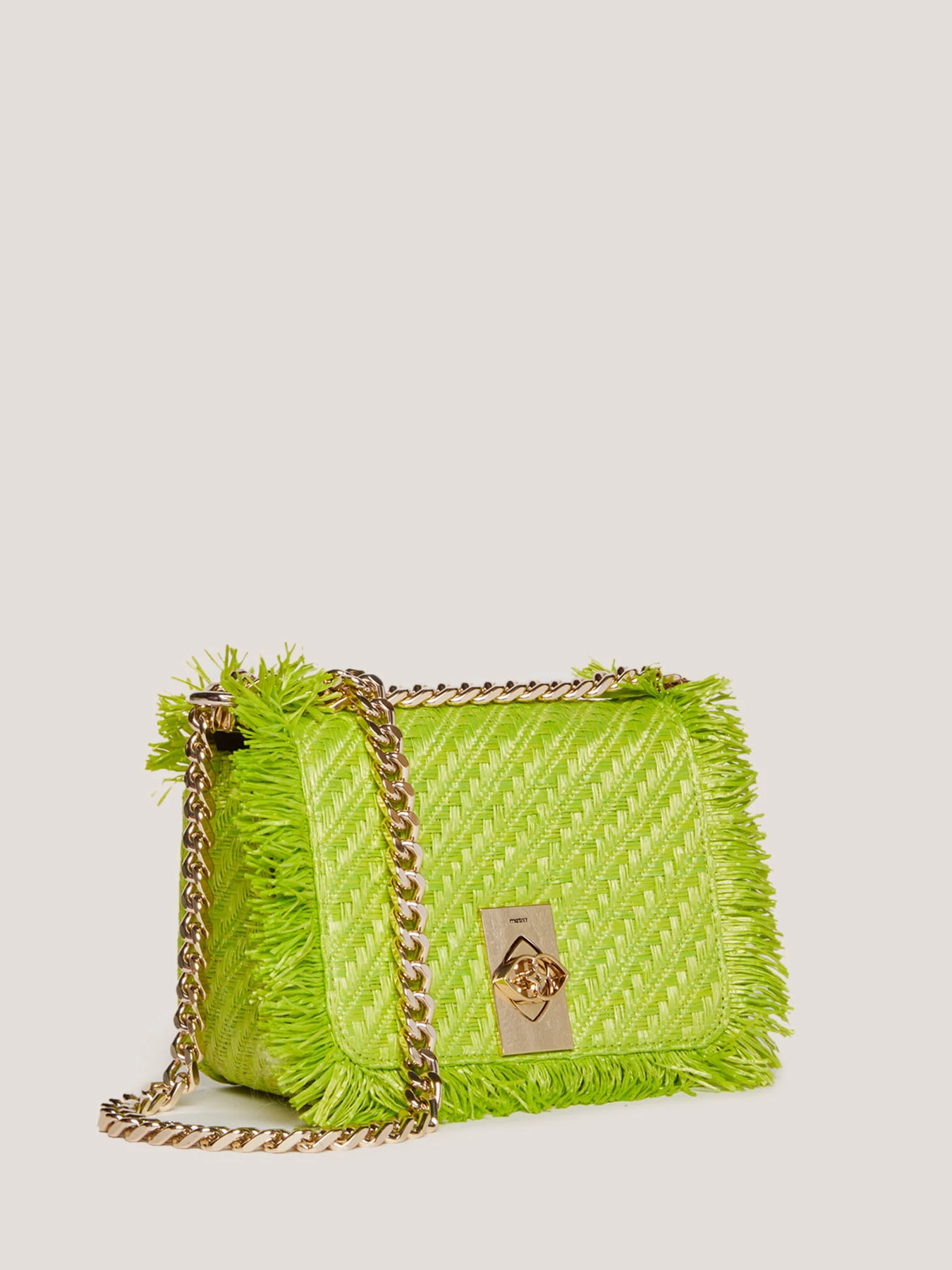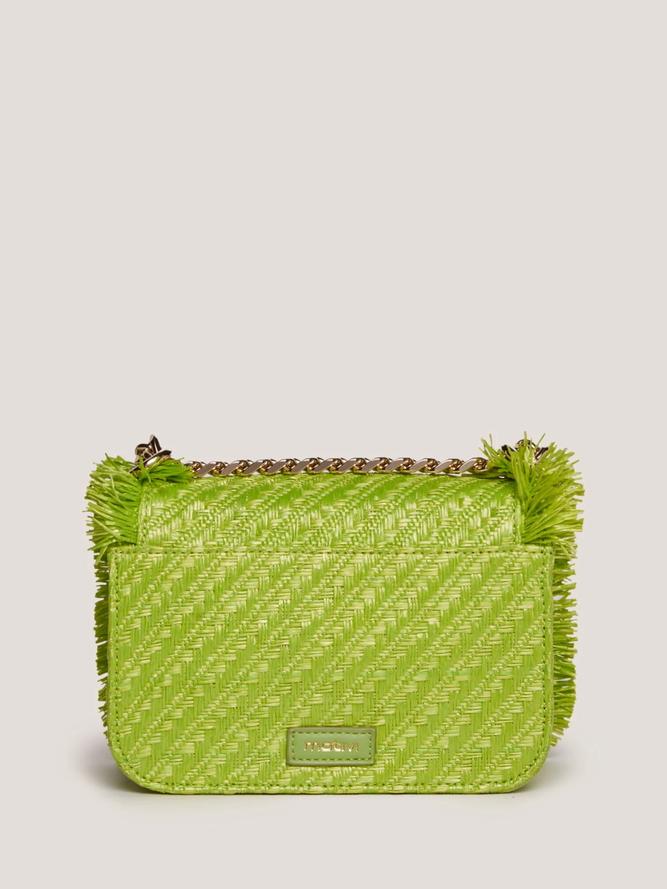 Mini City Bag in rafia; tracolla regolabile in catena metal diamantata, chiusura con nottolino Double Love, tasca interna; dimensioni: altezza 14 cm, larghezza 19 cm, ampiezza 7 cm.